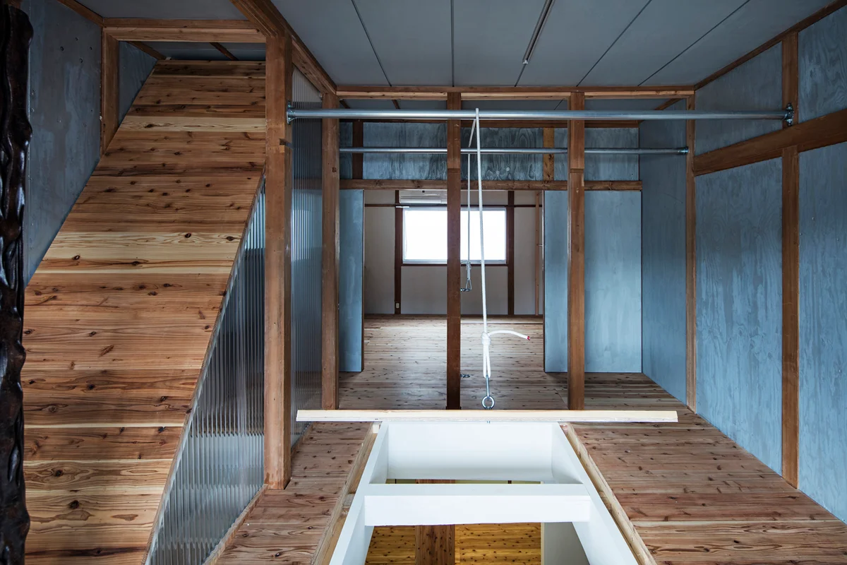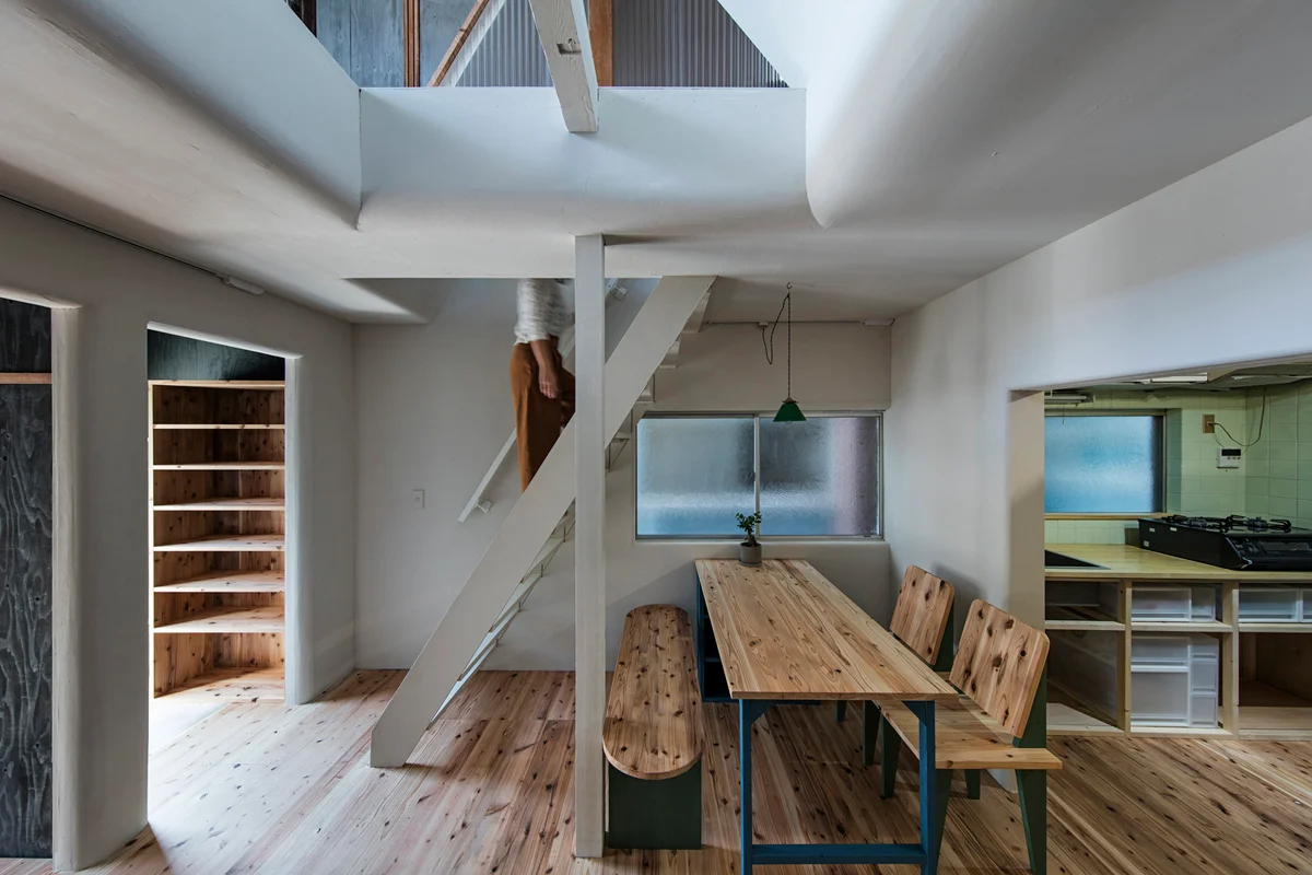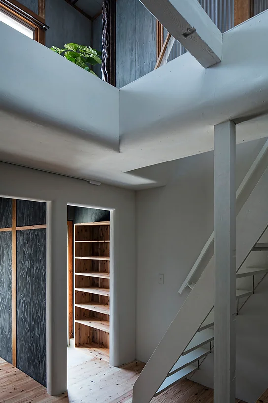 構成は生活の中心となる広くて白いホールを1Fの中心に、その周りにキッチンや玄関、寝室設けました。2Fは将来出ていく可能性のある妹の部屋と息子家族が泊まりに来た時の寝室ともなる屋根裏としています。ホール以外の各室の仕上げはホールとの明確な差異を付けるため、既存の真壁を活かしながら色や素材のバリエーションを付けています。