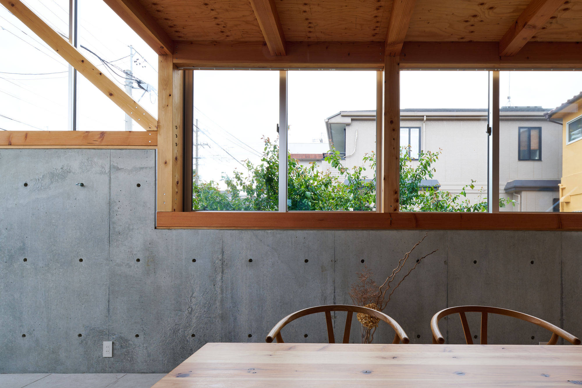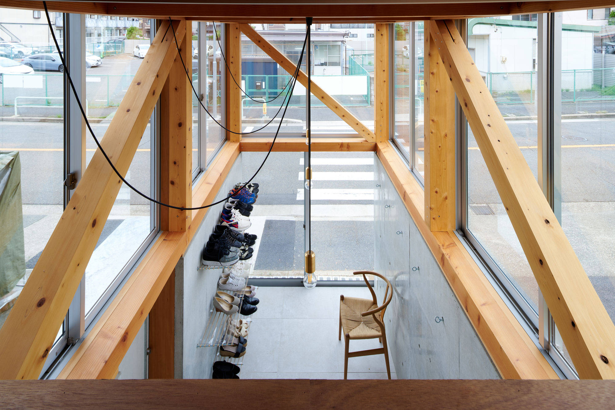 厳しい斜線制限を有する限られた敷地の中で空間の伸びやかさをつくるために、建物内部の気積を最大化するような縦長なプロポーションと、外部環境を最大限取り込むために周囲と視線が交錯しない位置(1階と2階のあいだ)に設けた大きな窓の層という2つの案が生まれました。