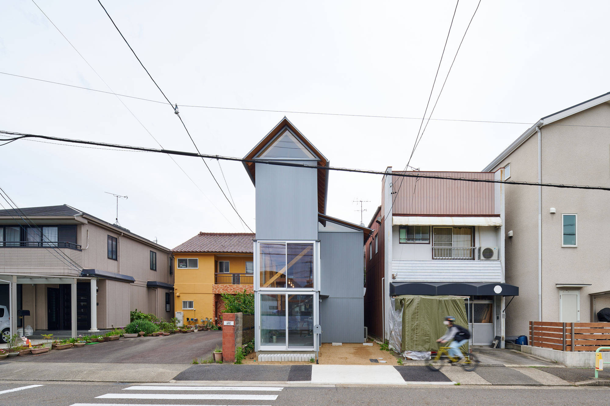 縦長なプロポーションと真ん中をすっぽりと抜かれたような外観を持つ2階建ての小さな住宅です。
