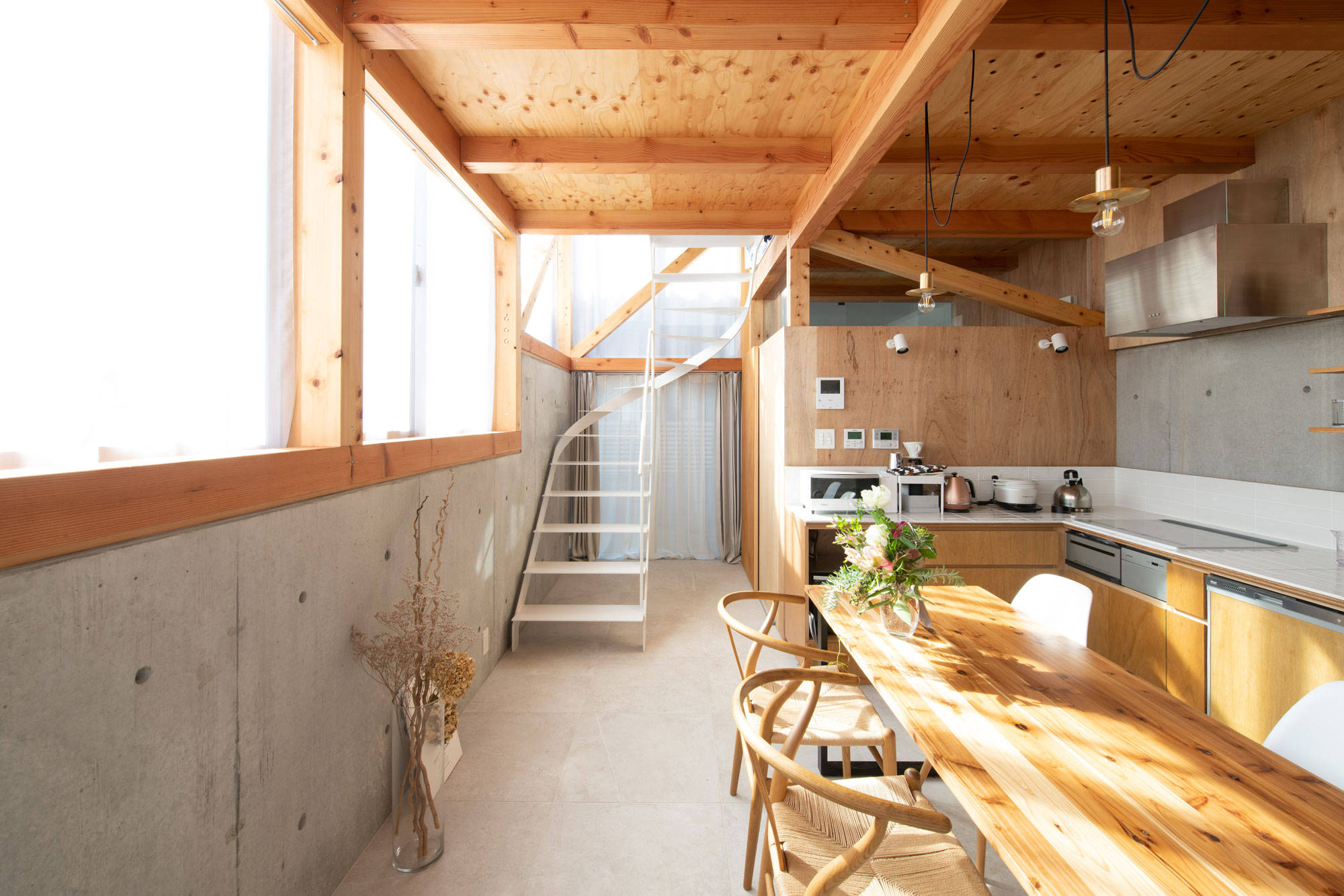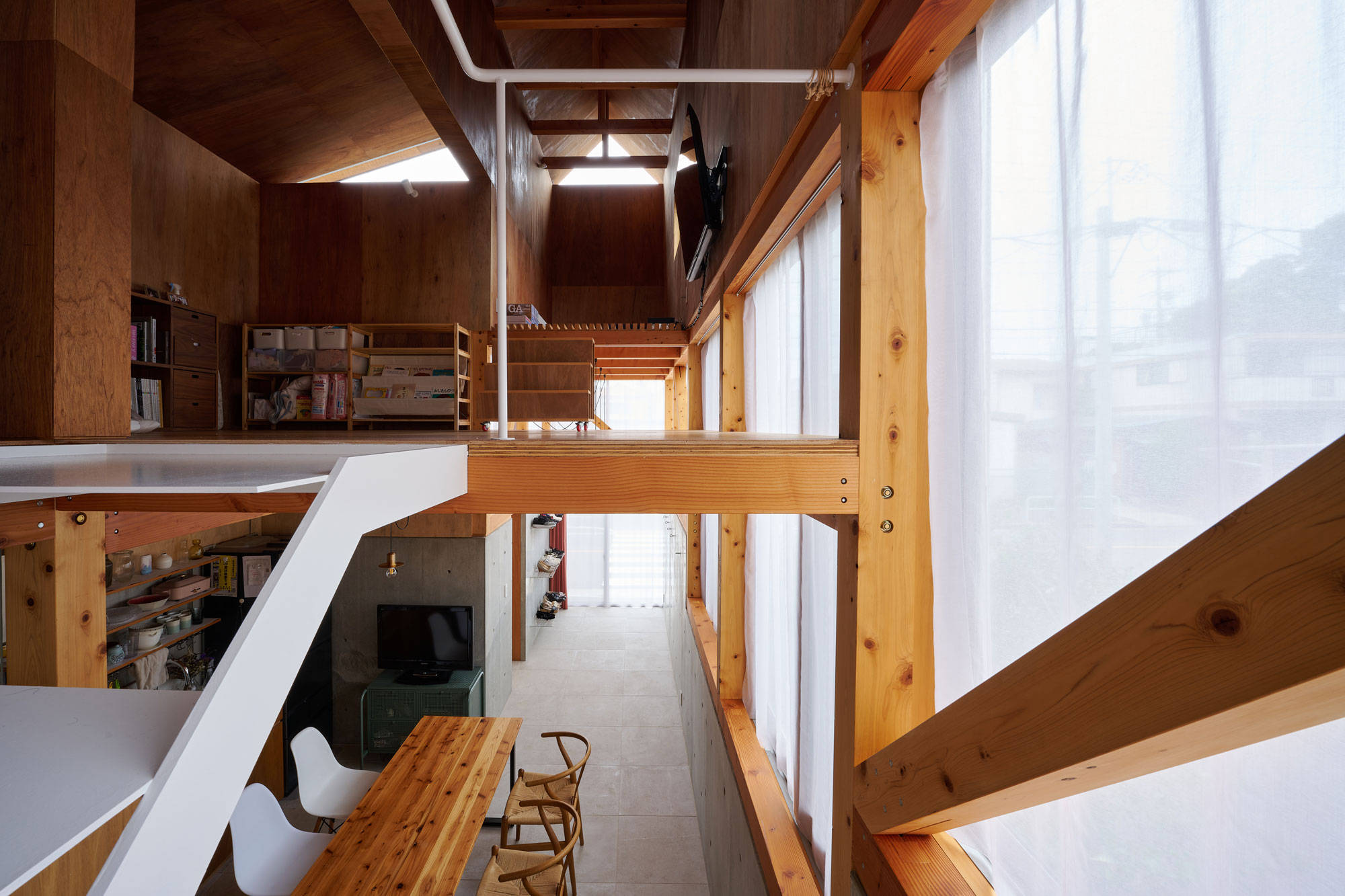 この1階と2階のあいだに設けた窓の層を立体的に楽しむために内部には色々な窓辺空間をつくりました。見上げる窓辺、見下ろす窓辺、しゃがむとまちを感じる窓辺など、一般的に縁側などでイメージする窓辺とは少し異なるかもしれません。