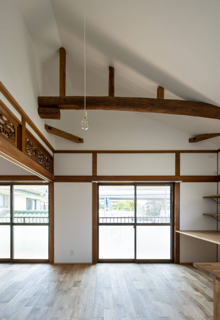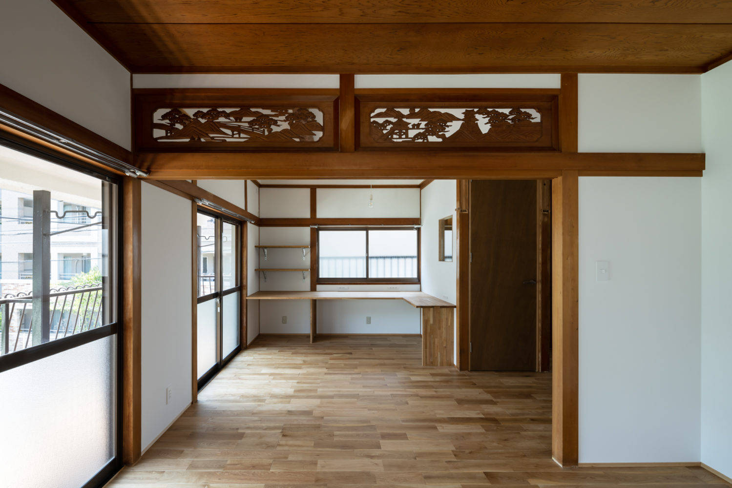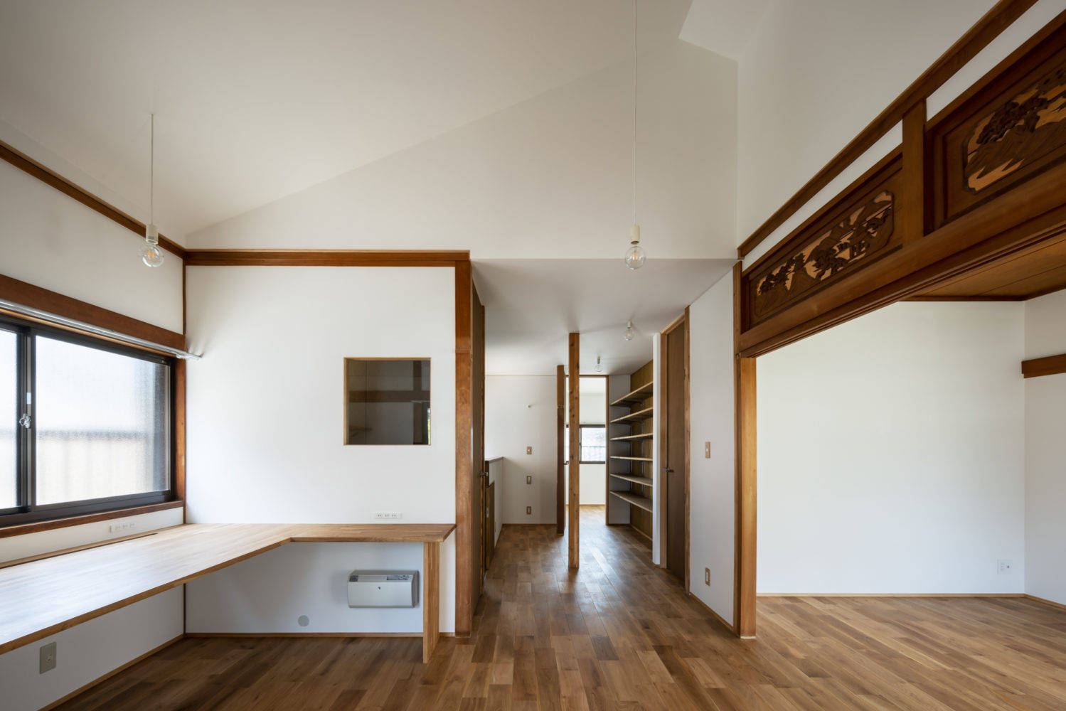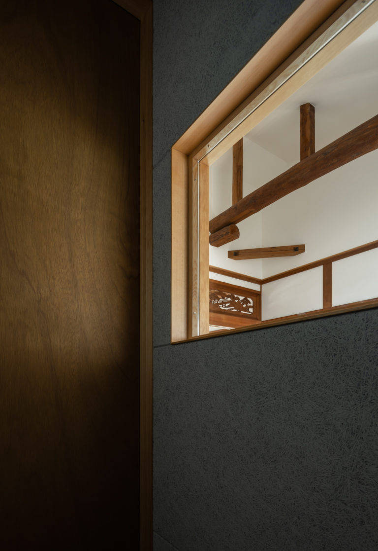 そこで、天井・壁の面材や、鴨居・長押の部材を「剥がす」ようにして、改修することを考えた。また、鴨居・長押の部材を剥がし、空間の境目をより曖昧にしつつ、柱を独立させることで、空間を広く見せる。さらに剥がすことで、天井裏に隠れていた梁や間仕切り壁が付いていた柱の面、部材が接合されていたほぞ穴等、既存の仕上げと新規の仕上げとも違う表情が顕になり、新旧仕上げの緩衝材となる第三の仕上を生み出すことを狙った。