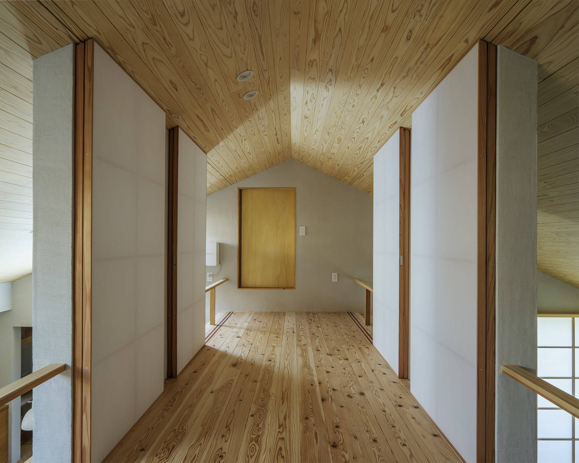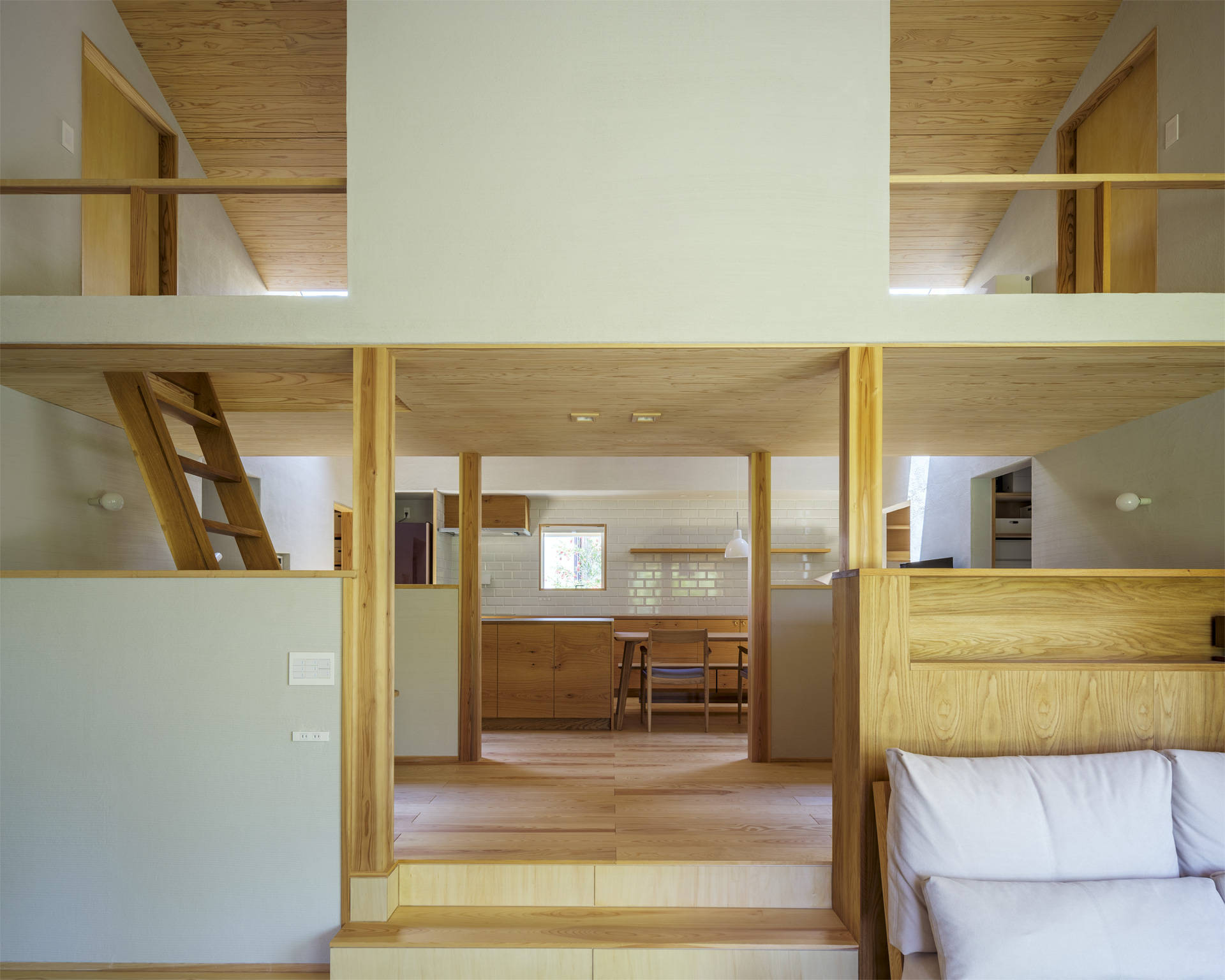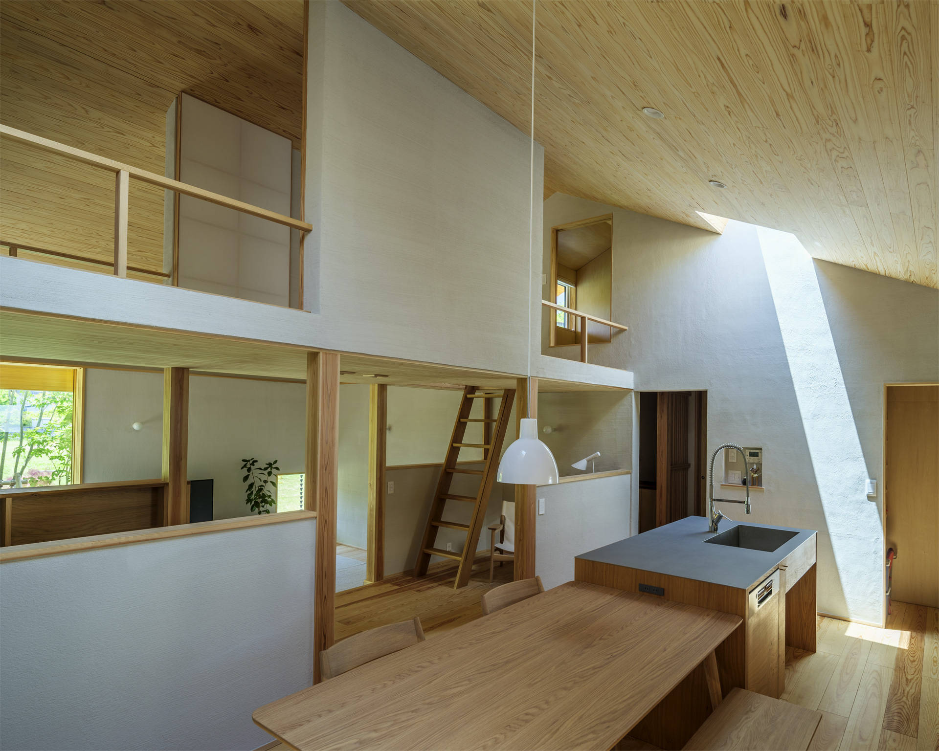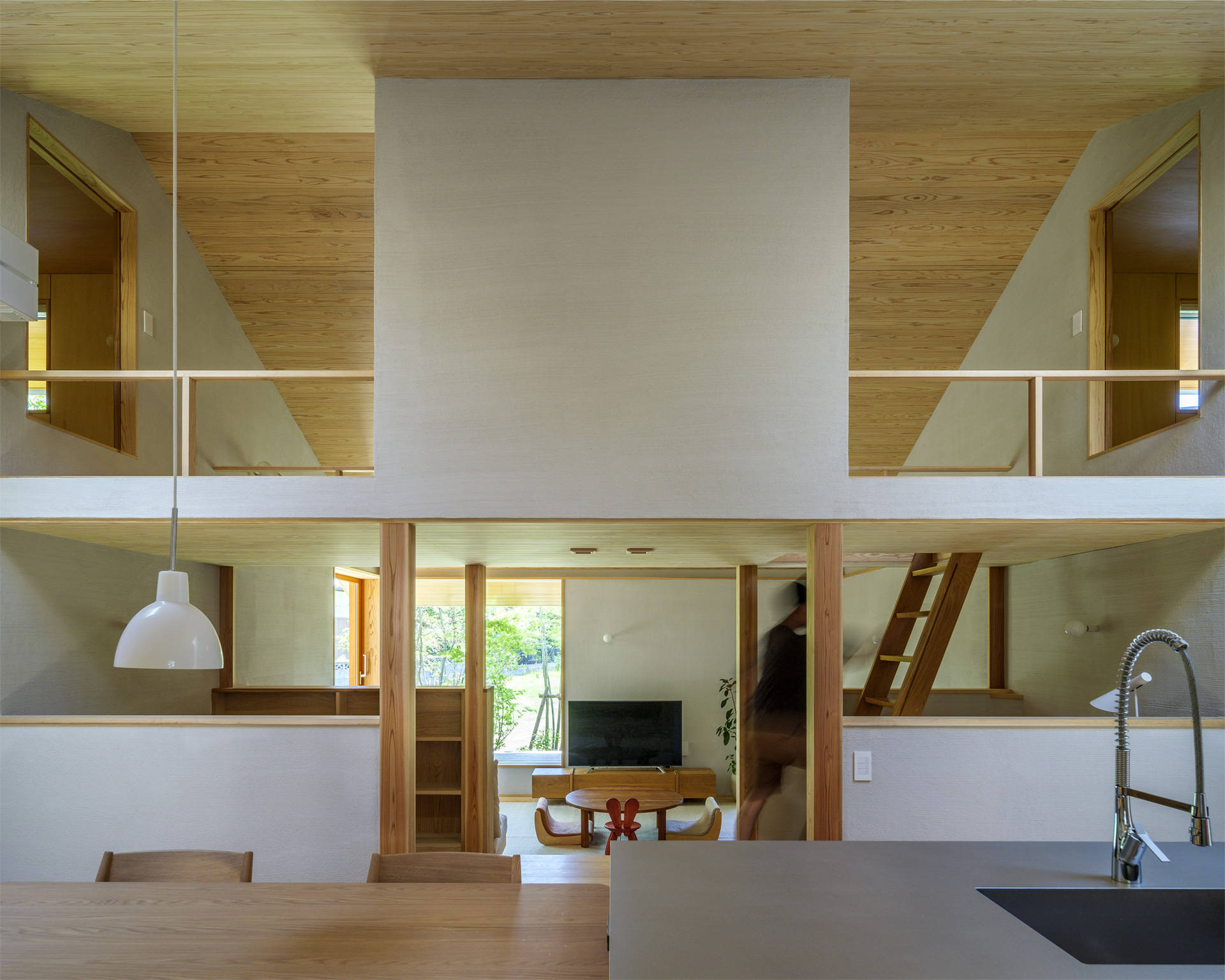 内部空間は、大きな家型の断面空間をタテヨコに利用し、様々な用途を持つ居場所を散りばめた。天井が高いところもあれば、天井が低いところもあり、視線が抜けるところもあれば、籠れるところもある。1段下がったピットリビングからは出隅部に設けた開口部から外との繋がりを感じると共に、デッキとのレベル差を利用し、そこに腰かけることで、室内側との繋がりも確保した。