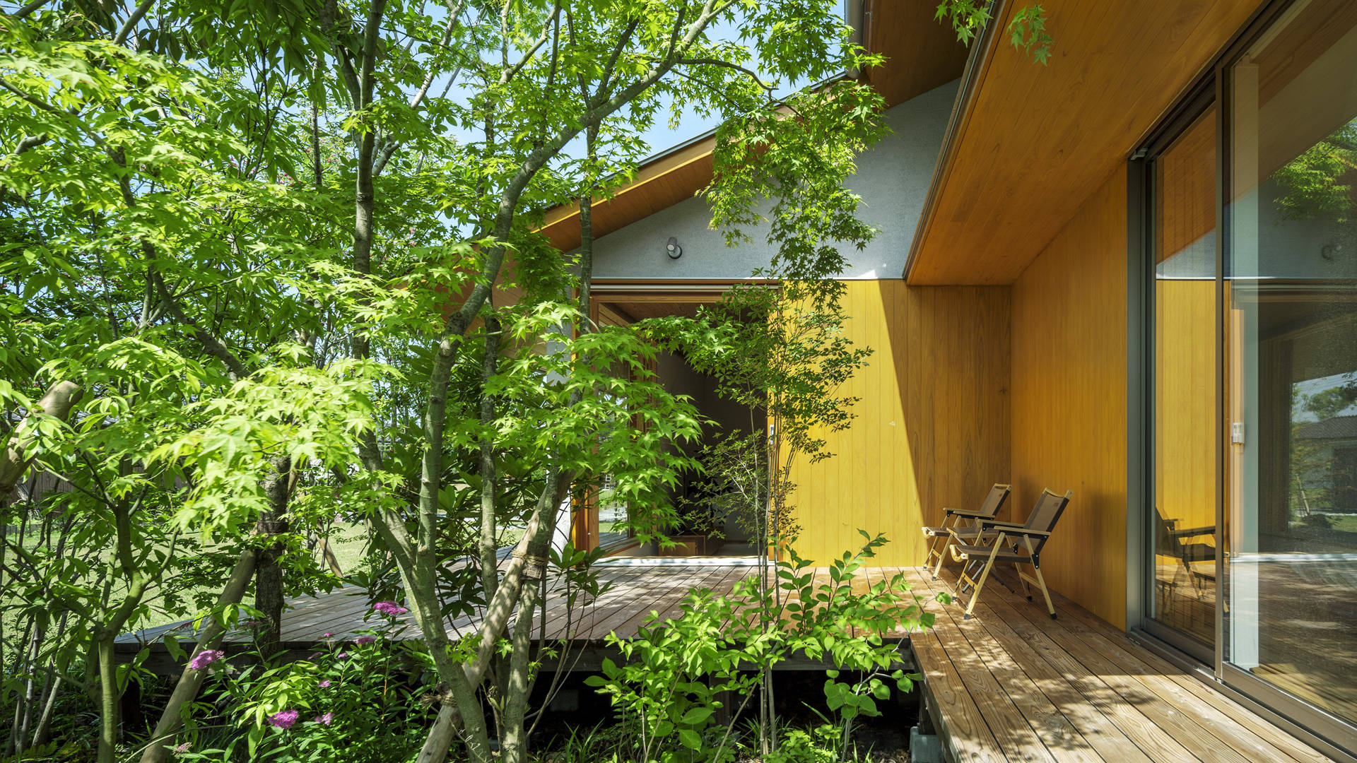 北側の山の風景と馴染ませるように、建物近傍に植栽を施し、その周囲は多用途に使える芝庭とした。性格の違う庭の緑がグラデーションを描くように、北側の山の風景へと繋がる。