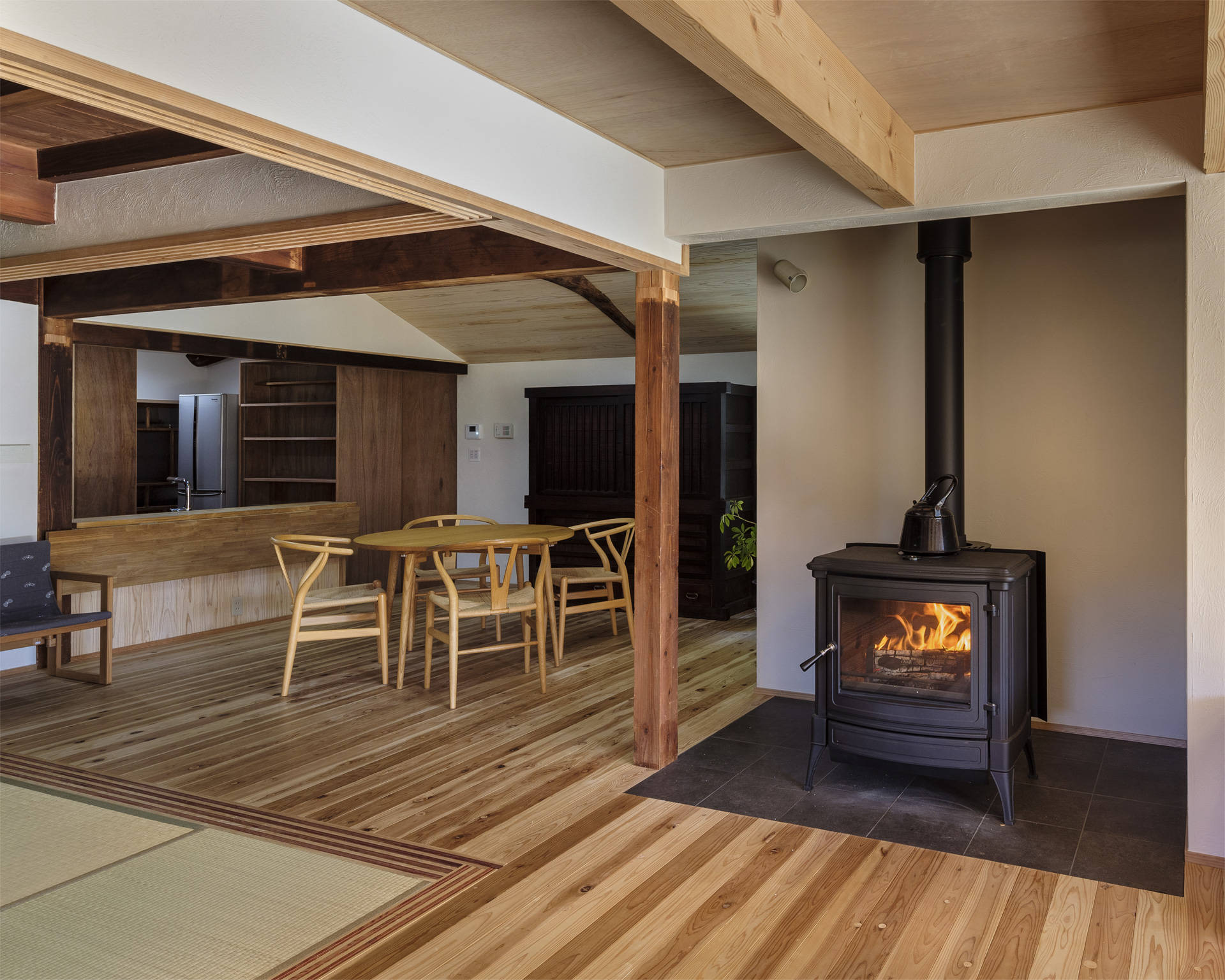 リノベーションに際し、建て主からの要望は、冬の寒さを軽減すること、今あるものを活かしたいという2点だった。 しっかりと断熱を施し、開口部も樹脂サッシとすることで、無断熱からUA値は0.53まで向上した。 元々は、田の字型に小割りされ、寒さから小さな和室に集まり、暖を取っていたが、断熱改修により、熱的なバリアーが無くなることで、開放的なプラン構成が可能となり、薪ストーブを中心にLDK、和室がひと繫がりとなる空間構成とした。 ダイナミックな丸太梁や再利用した建具、既存の長もちや箪笥、建て主がリメイクしたTVボードなど、新しいものの中に古いものが混在する、温故知新を体現する心地良い住まいとなった。