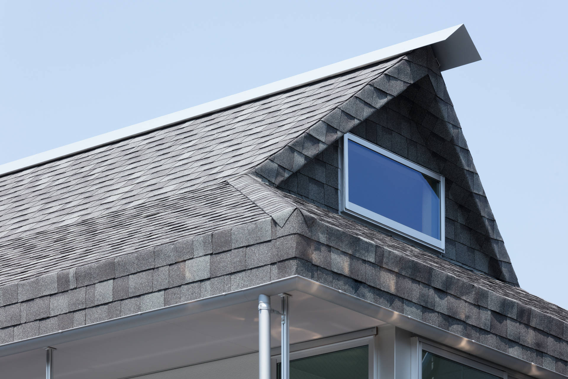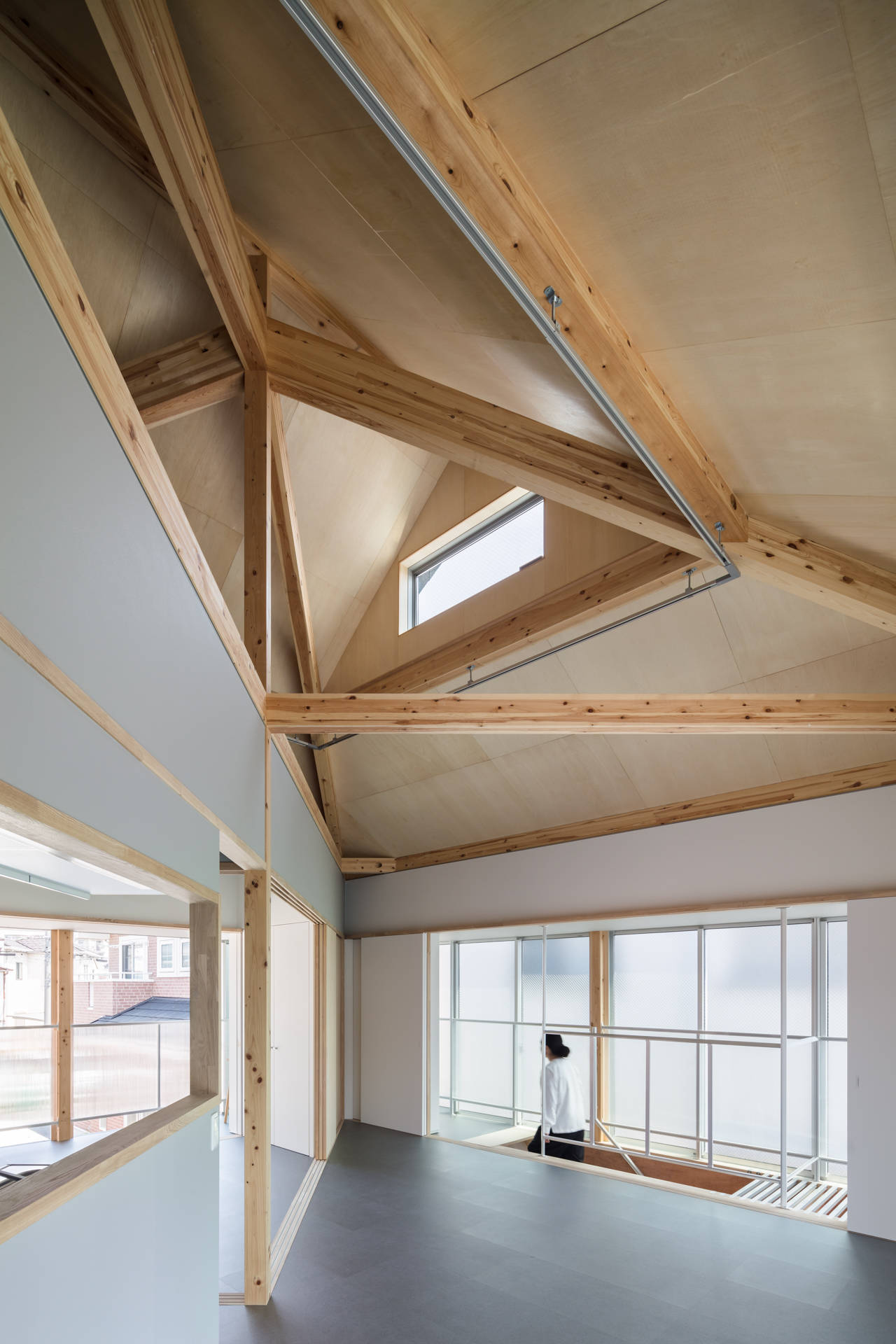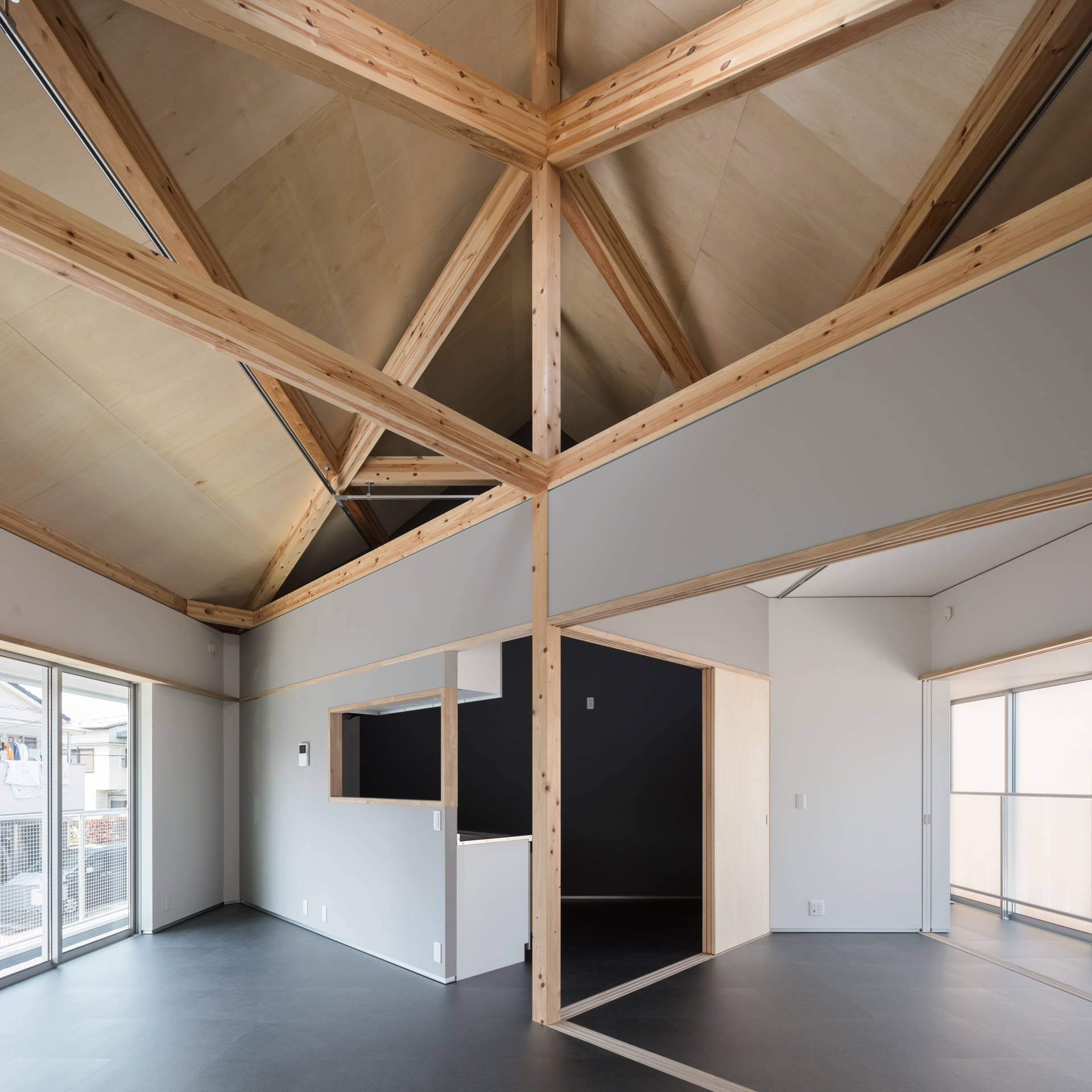 ローコストを実現するために、二戸一化のスケールメリットによる減額に加えて屋根形状やファサードも規格品の寸法や作り易さから決めている。構造体は、極力プレカットで対応できるよう各接合部を一点へ集中させずにずらし、減額を計りながらニュアンスをつけている。屋根架構は45度振ったX型で周辺に対して開く向きをつくり、左右で完結しつつ一体化した際には新たな全体性を帯びる。
