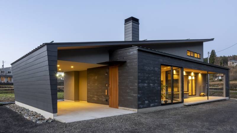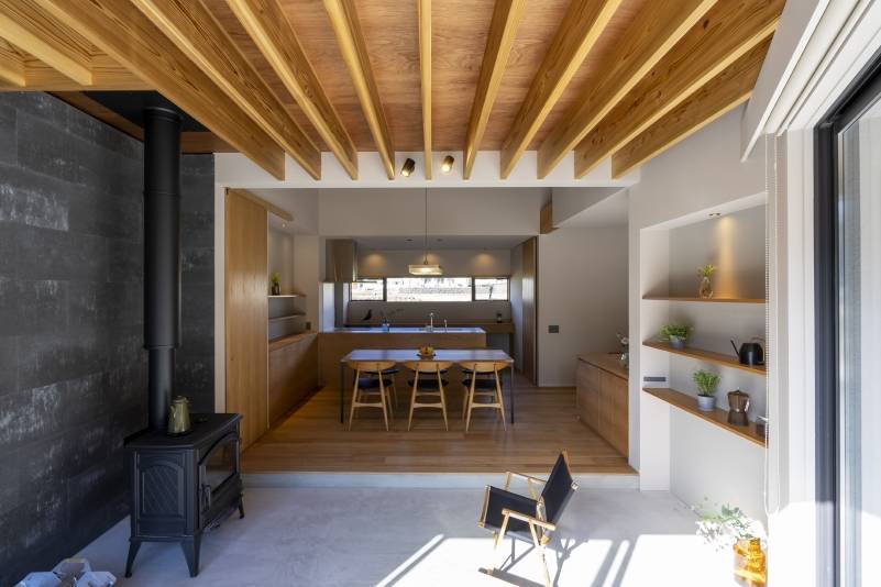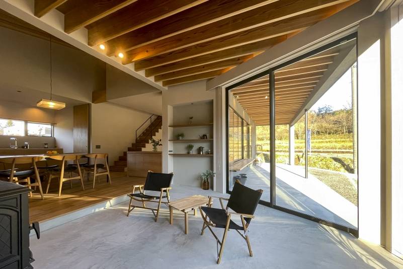 木造2階建ての一戸建て・アウトドアリビング・土間リビング・薪ストーブ・吹抜のある住宅。田園風景の中で、「建築・デザイン」×「自然・アウトドア」が融合し、「豊かな暮らし」を実現する住まいです。■動画で見る