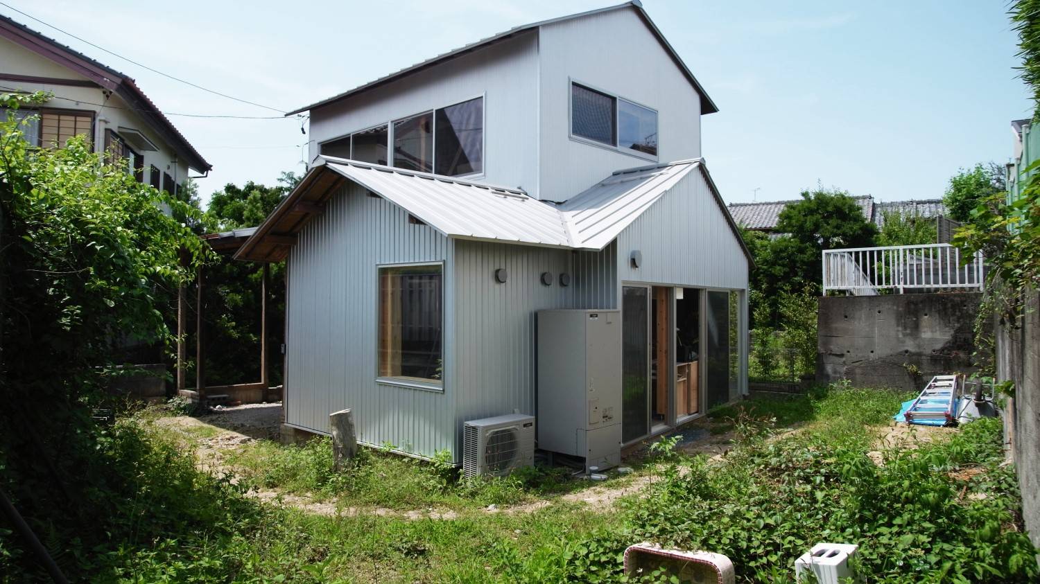 敷地の東には2mほど高い隣地との間に擁壁がある。減築により生まれた屋外空間は「囲われた庭」となっている。東の下屋には屋外からも使える全面開口のキッチンを整備し、このプライベートな庭と擁壁に静かに向き合える空間とする。西側には出窓があるが、東側とは逆に隣地が低く視線の抜けを確保できるため、地袋を撤去し掃き出し開口として出窓を「額縁」のように設える。北側には出窓や下屋はないが、小さな窓を設けることで土地や外部との関係性を相対化させる。そして2階は、土間と空との関係を取り持つ。南の下屋はアプローチの突き当たりでもあり、近隣や来客を受け入れるこの家の態度を表象する空間となる。