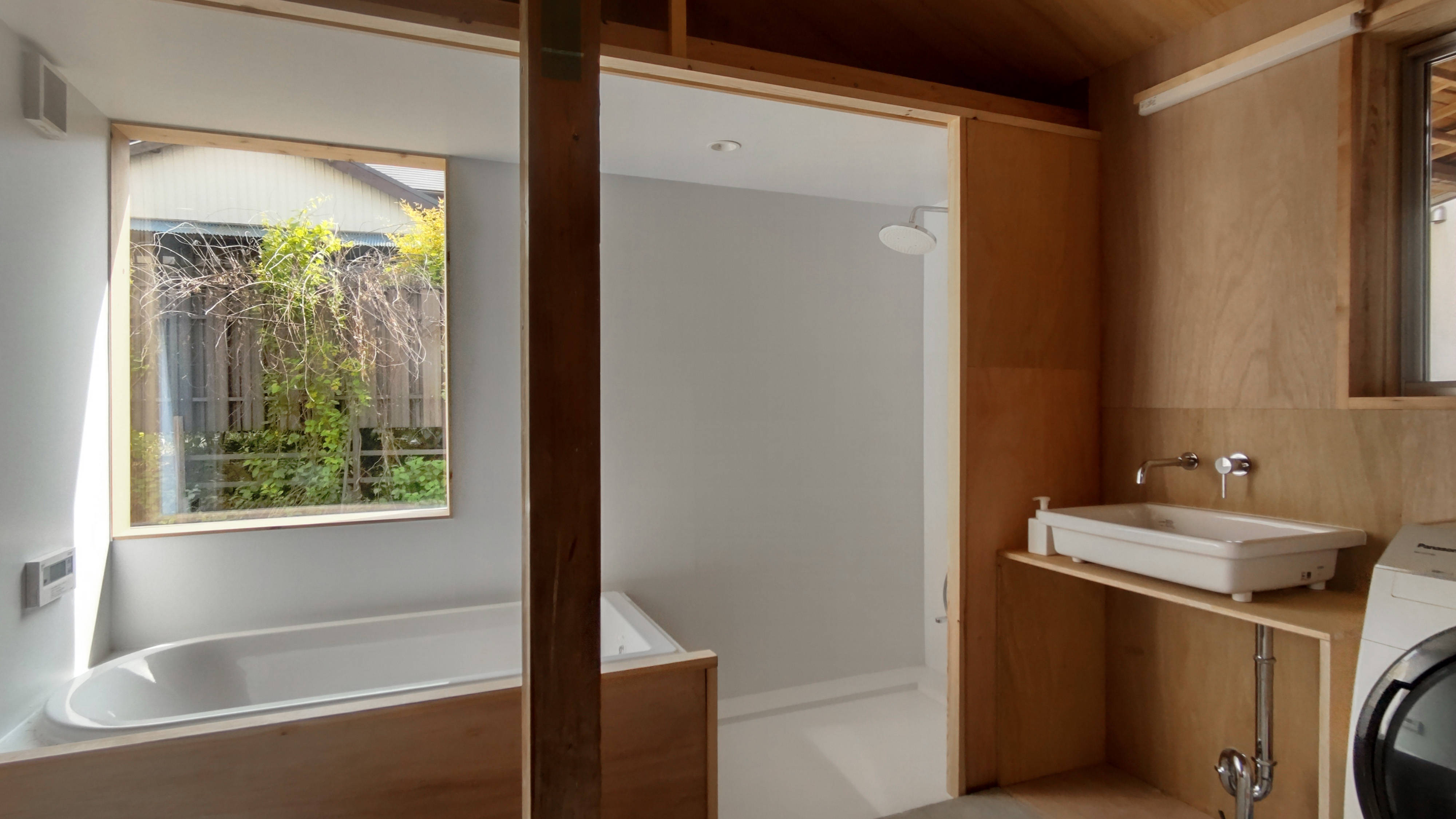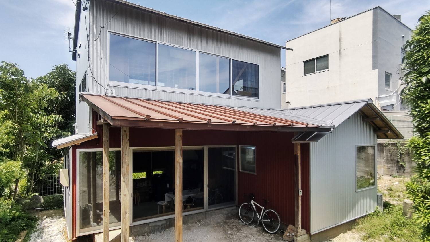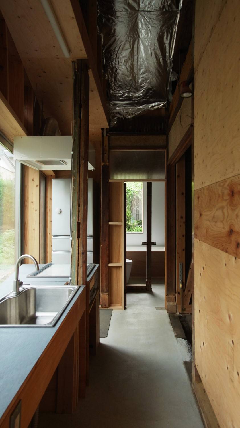 既存の洋間を解体して屋根だけ残した大らかな軒下空間とする。畳敷きだった1階の和室は、床を撤去してベタ基礎補強をしたのち、そのまま土間として使っているが、土間のレベルは周辺地盤より少し下げている。これは、床下の土を鋤き取って増設基礎の重量を相殺するためでもあるが、路地を下るアプローチのシークエンスを踏まえ「地形を建築に引き込む」選択をしたことも理由として大きい。