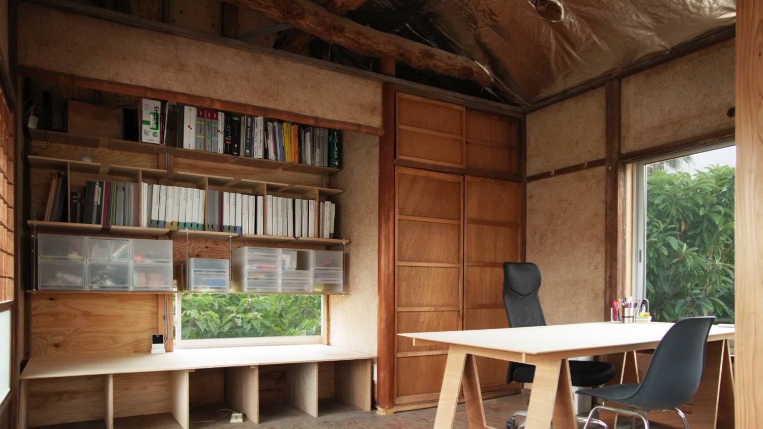 この家には下屋や出窓など「突出したボリューム」がある。これらのボリュームを建築的にどう扱うかが一つの主題でもあった。家の中心的な空間は1階の土間だが、「突出したボリューム」が土間と外部環境をそれぞれ異なる方法で関係づけることで、建築全体の豊かさを引き立てられると考えた。