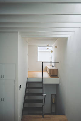 都市部の住宅街に建つ住まい。スキップフロアで半階ごとにずらしながら空間を縦に繋ぐことで小さな敷地面積に建てる住宅でありながら視線が抜け広がりが生まれました。家族の気配を感じながら楽しく暮らせる住まい。