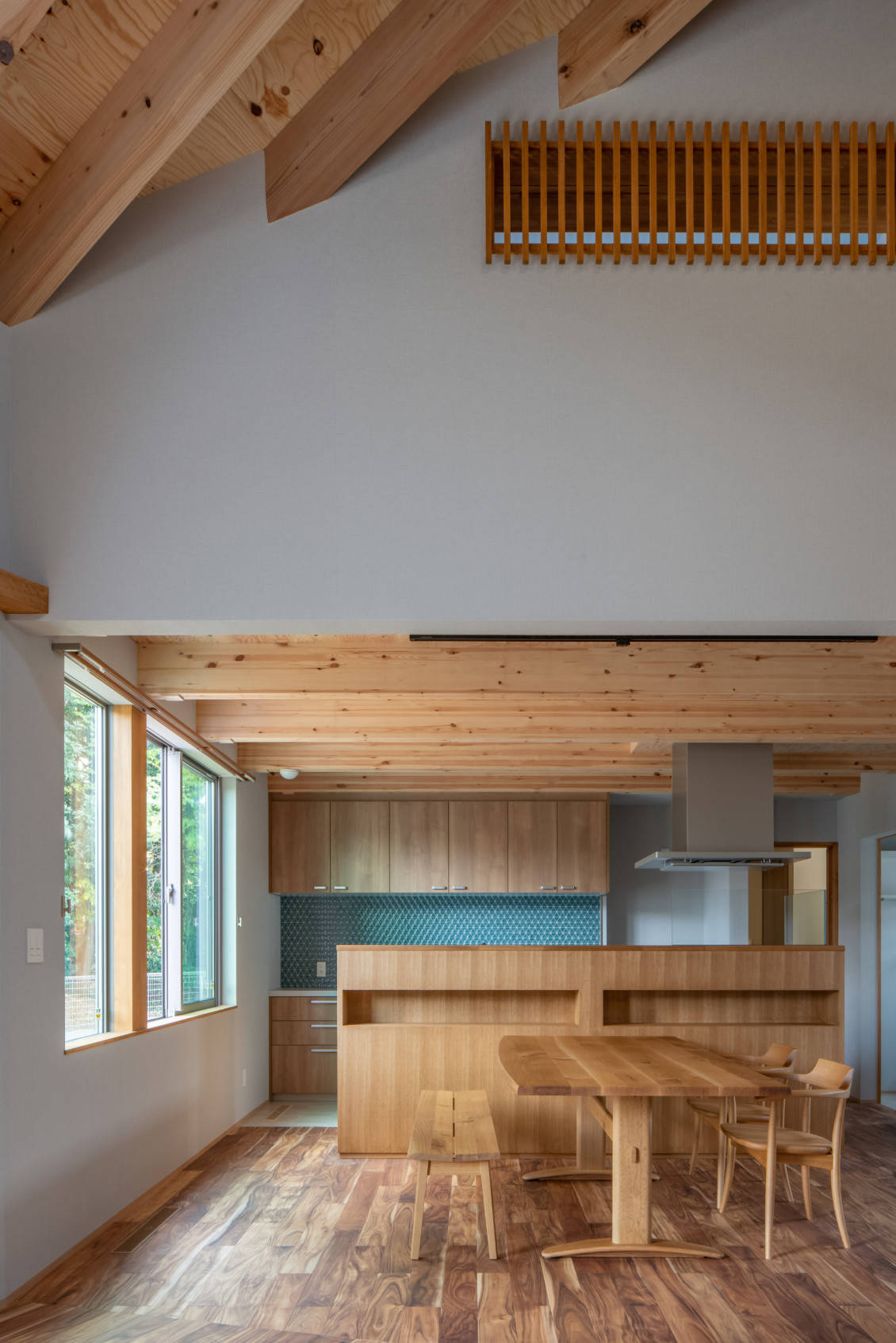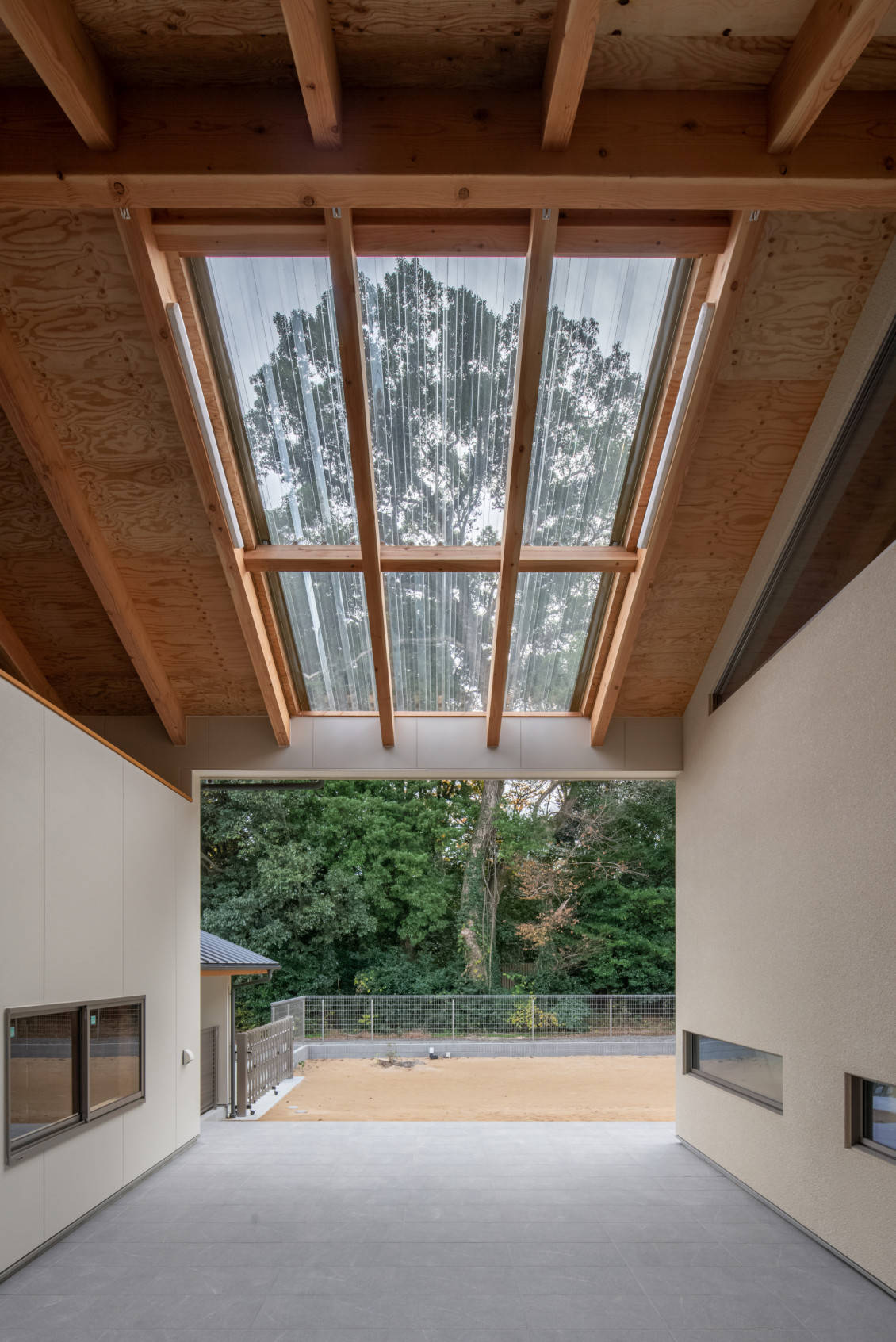 ガレージ棟と住居棟を屋外テラスでつなぎ、となりの神社の杜に向かって開いた住まいです。