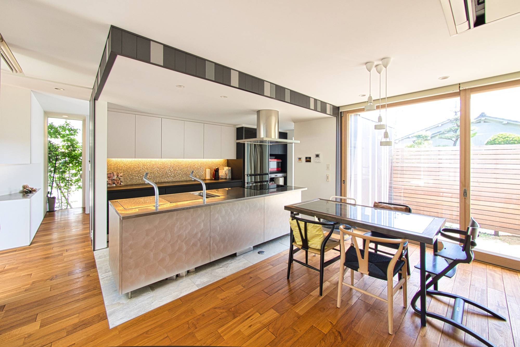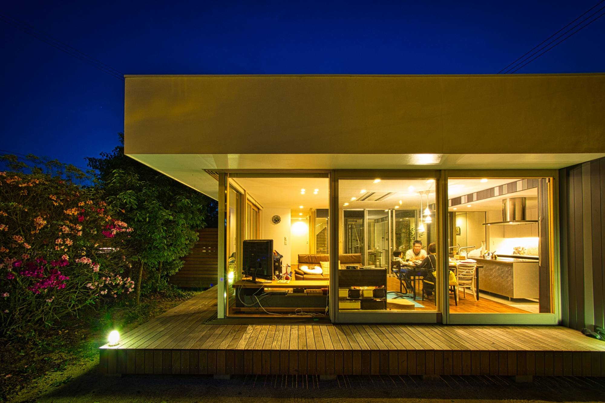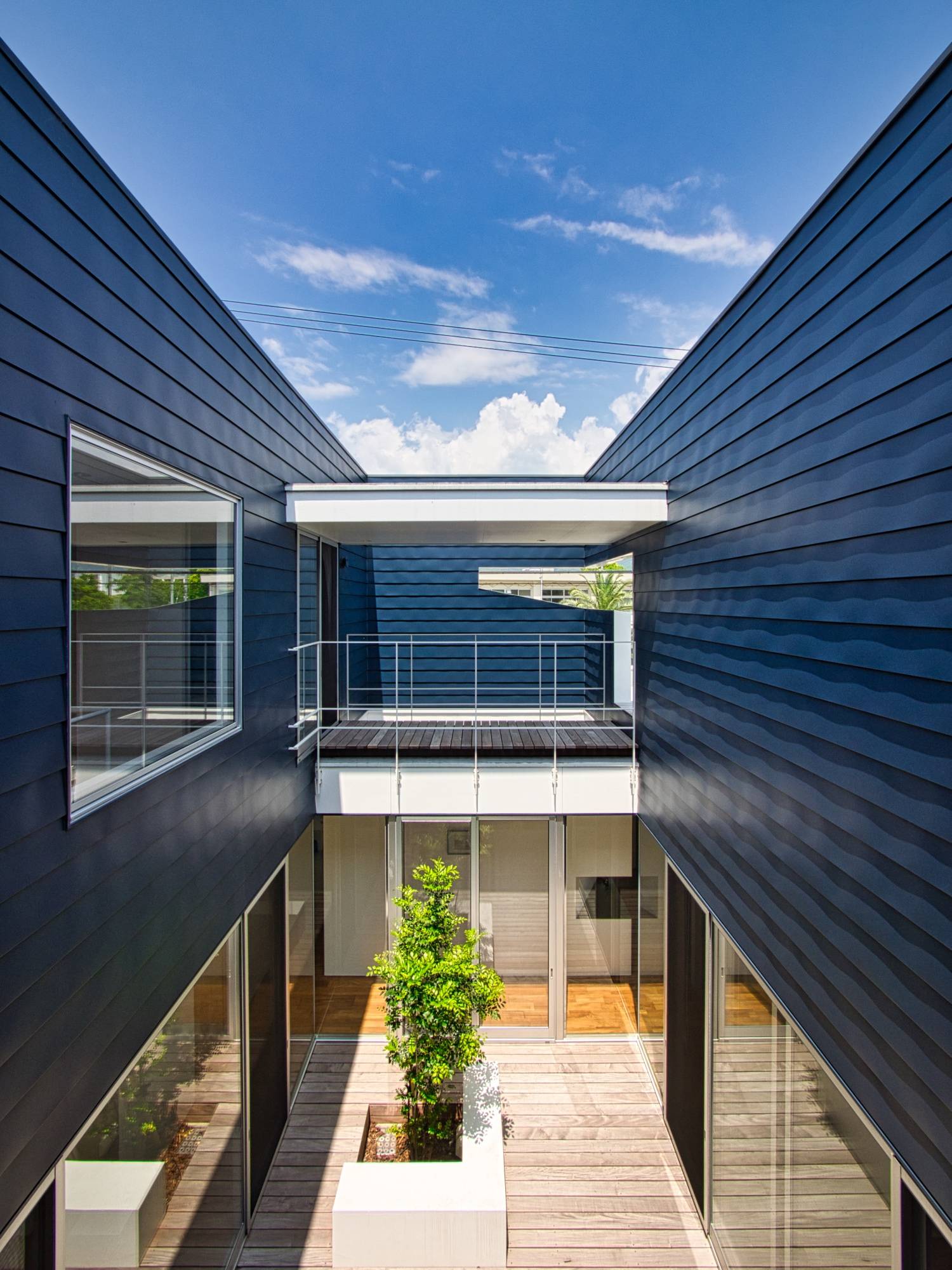 大きな中庭を囲むようにロの字にレイアウトされた住宅です。この中庭は、二層分の壁に囲まれているので外部からの視線を完全に遮ることが可能となっています。「緑が映える南側の外庭」と「デッキで内部に繋がる中庭」に挟まれたリビングダイニングスペースは、日常的に緑を感じながら自然豊かな生活を営むことができます。中庭はぐるっと一周することができる回廊が配置されているので、普段の何気ない移動の中にも季節の移ろいを感じることができます。浴室には隣接するバスコートを設けており露天風呂のように入浴することもできます。2階部分の屋根は、デッキを設けているので夏は花火を見ることができます。