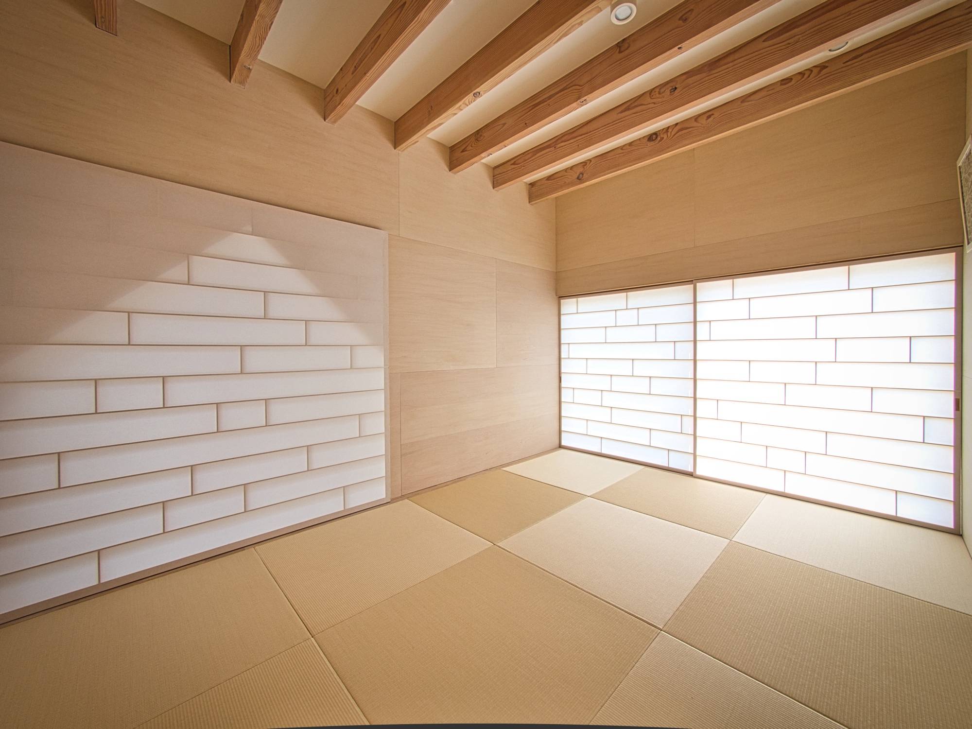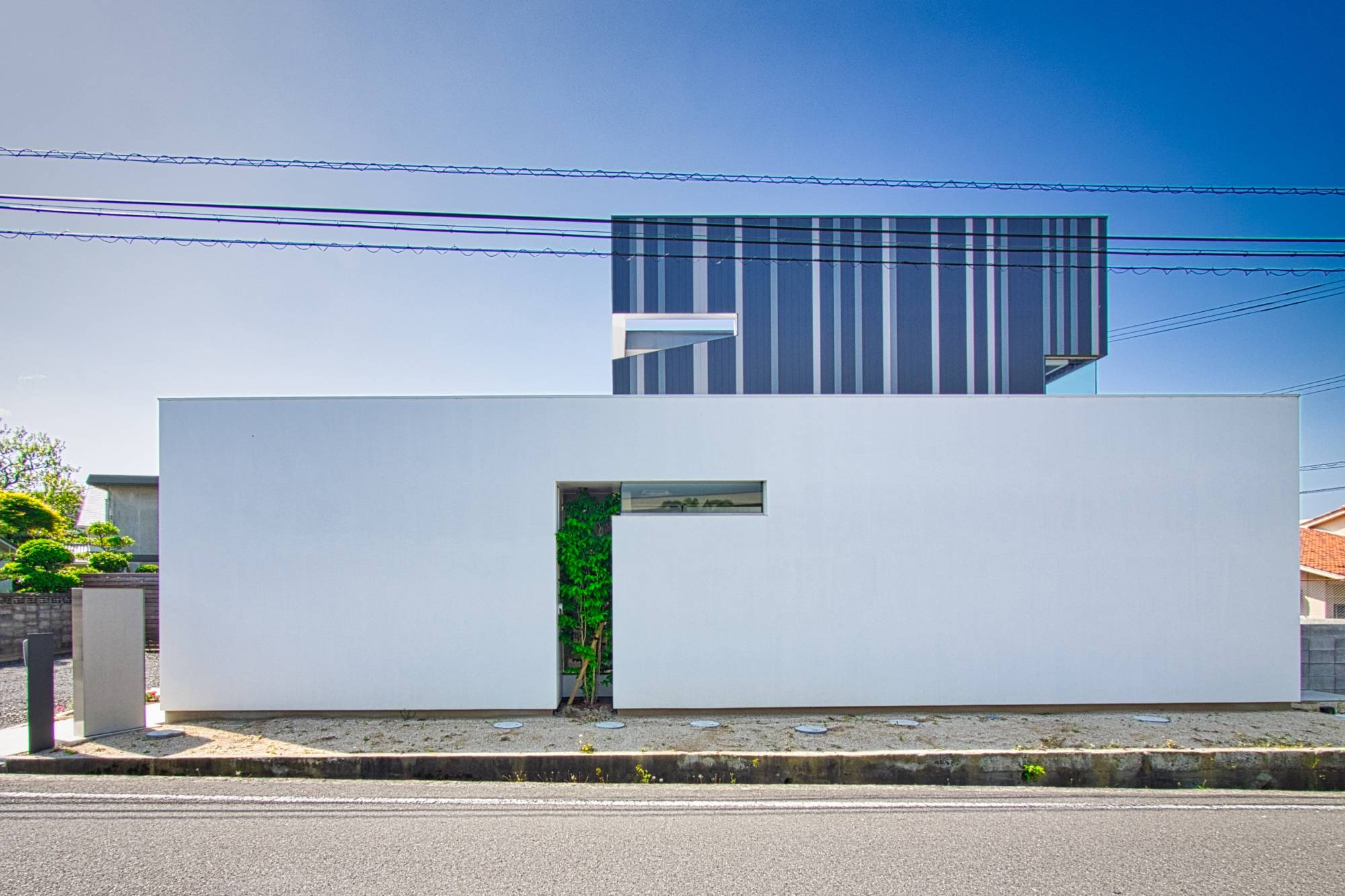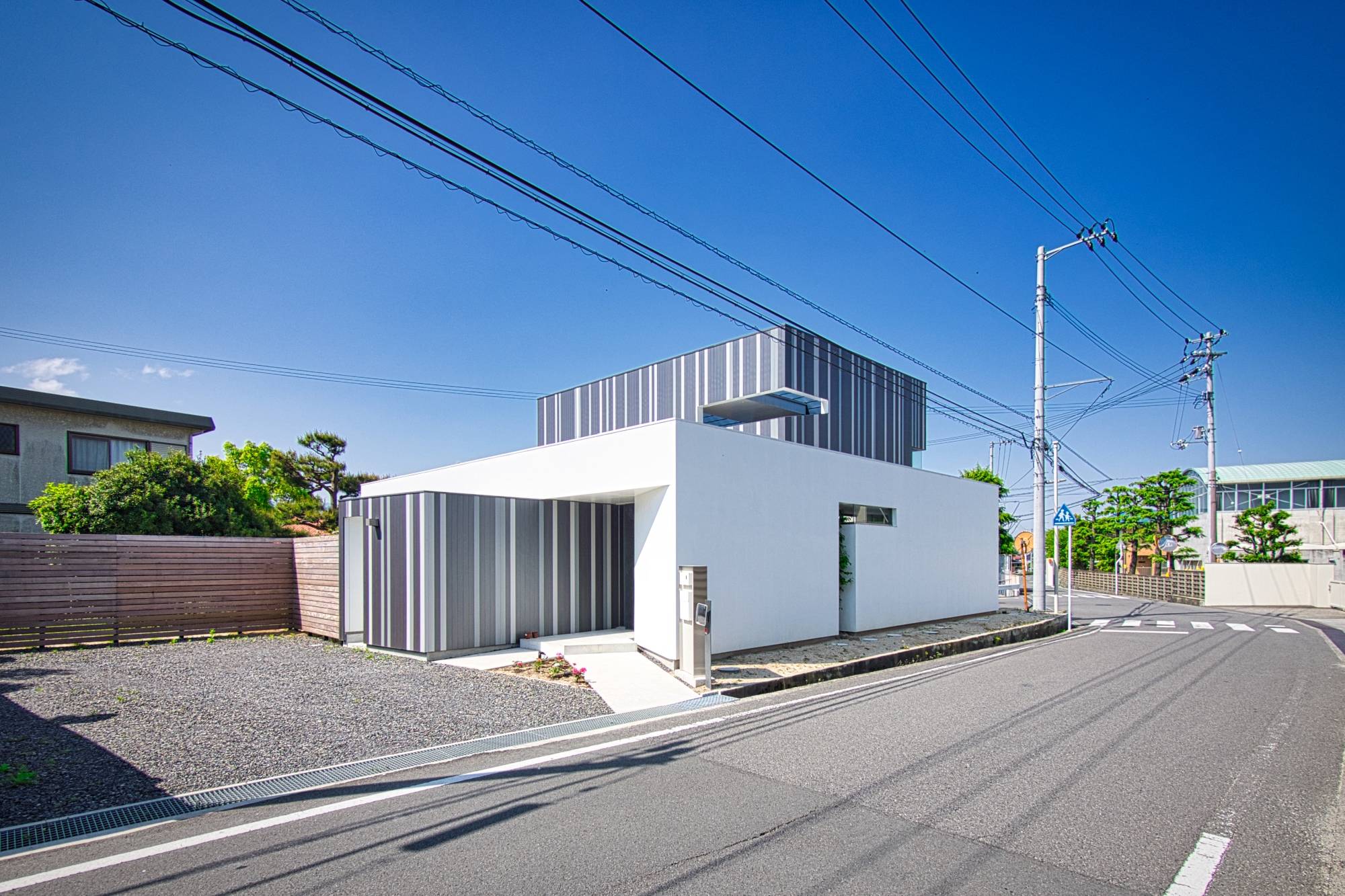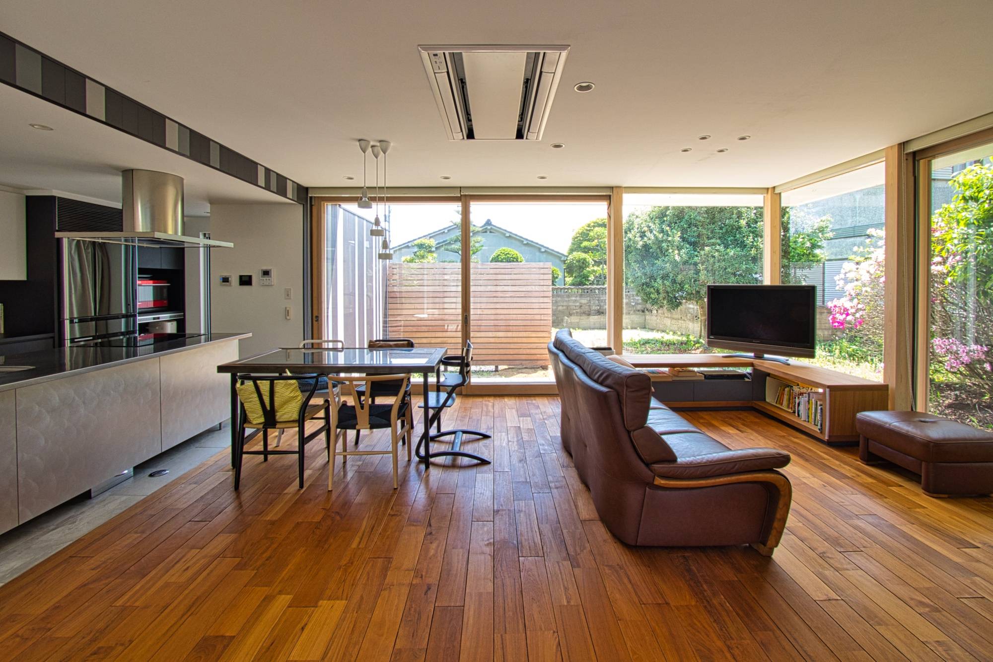 大きな中庭を囲むようにロの字にレイアウトされた住宅です。この中庭は、二層分の壁に囲まれているので外部からの視線を完全に遮ることが可能となっています。「緑が映える南側の外庭」と「デッキで内部に繋がる中庭」に挟まれたリビングダイニングスペースは、日常的に緑を感じながら自然豊かな生活を営むことができます。中庭はぐるっと一周することができる回廊が配置されているので、普段の何気ない移動の中にも季節の移ろいを感じることができます。浴室には隣接するバスコートを設けており露天風呂のように入浴することもできます。2階部分の屋根は、デッキを設けているので夏は花火を見ることができます。