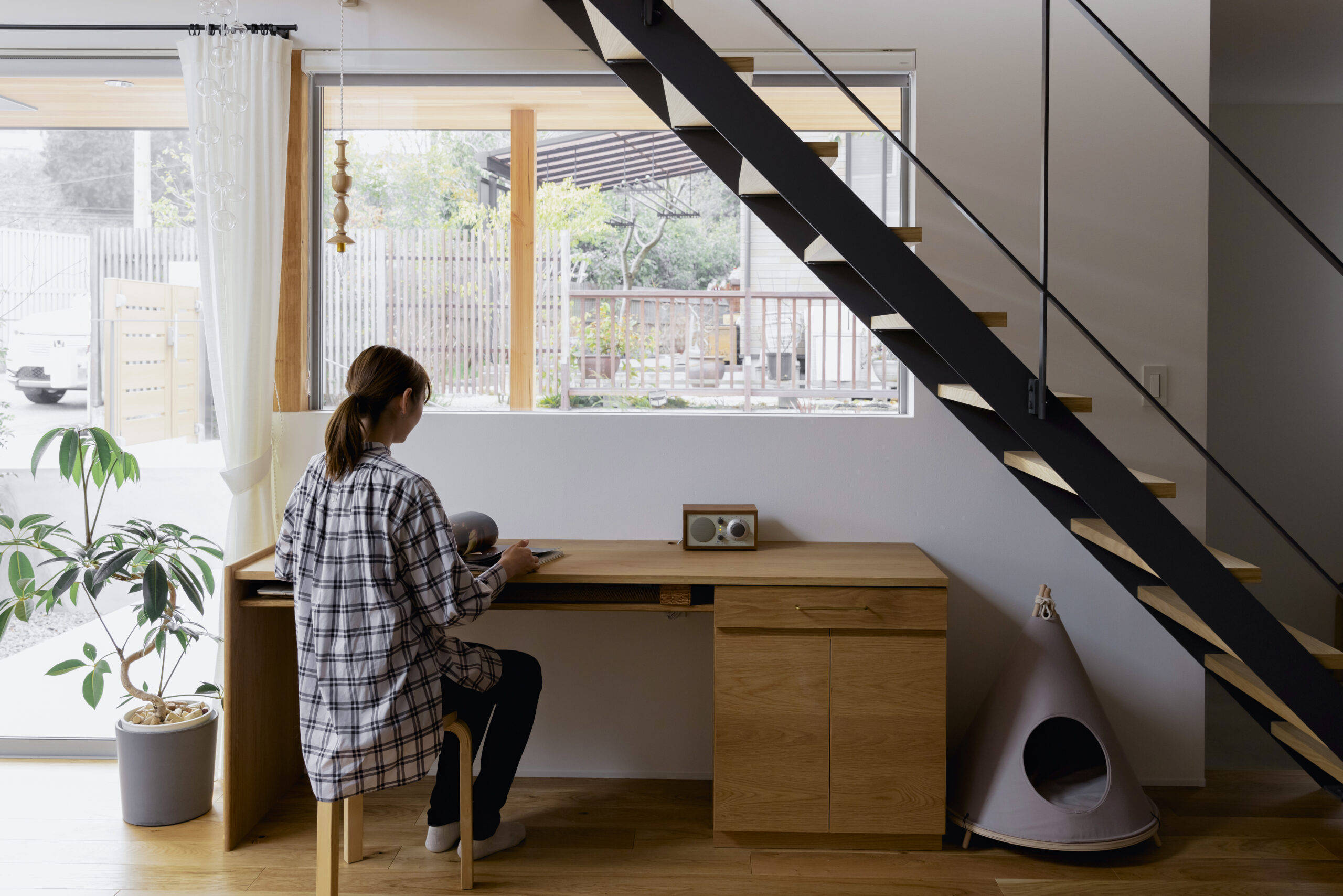 また、猫との生活を楽しむことのできるよう、構造を生かしたキャットウォークや、鉄骨のストリップ階段と階段下のスタディースペースなど、ゆるやかに猫を感じ共に生活ができる空間となっています。