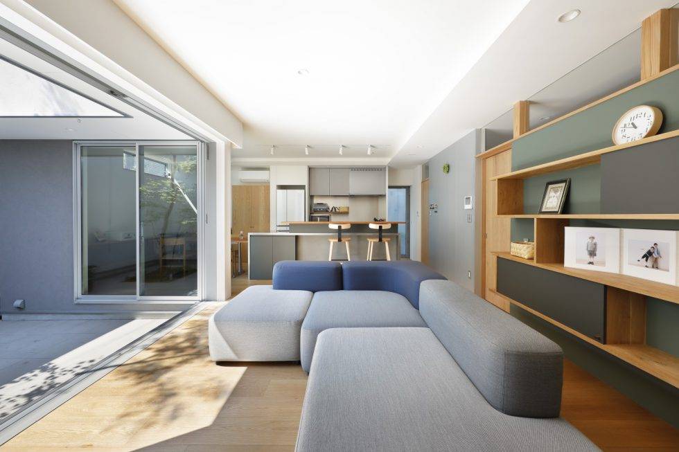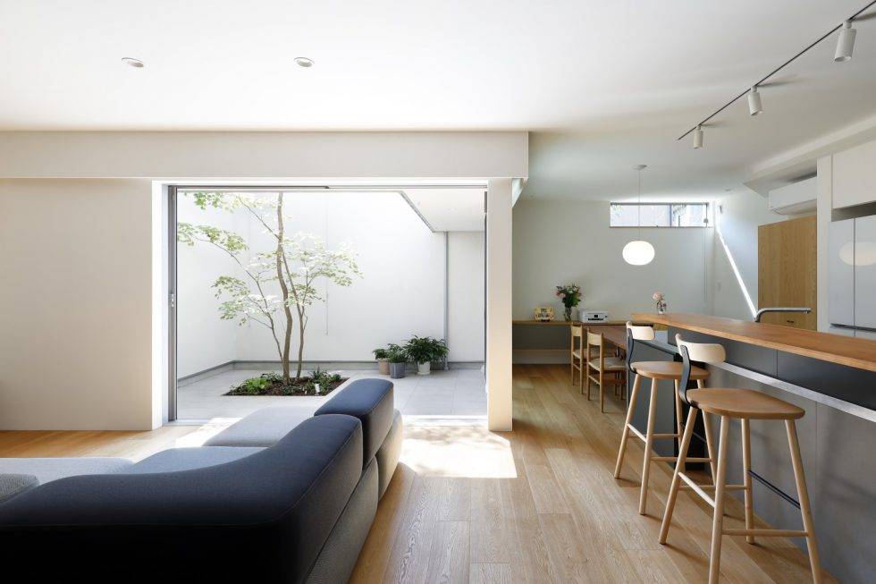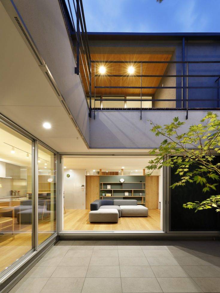 比較的人通りの多い街区の角地であることもあり、L型プランのコートハウスを採用。