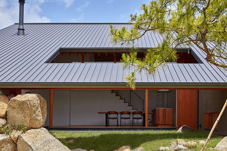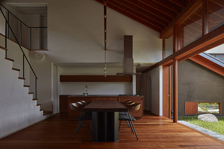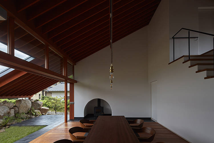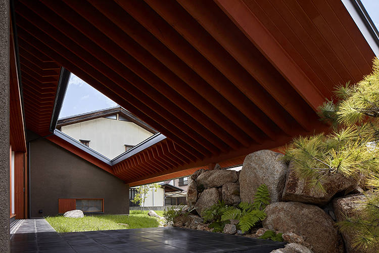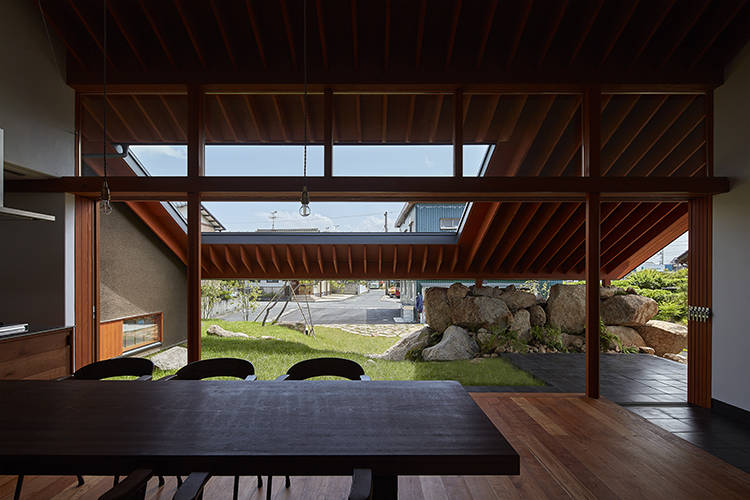 この新しい関係で、庭の一部である岩山を独立基礎として、住宅の大屋根を架けることにより、「住宅の精緻な技」 と 「庭の生命感」 が響き合う佇まいとなりました。干拓により陸地に残された小島の痕跡のような岩山に、大らかに架かる大屋根の家は、未来永劫この地を拠点とする決意を現しているかのようです。