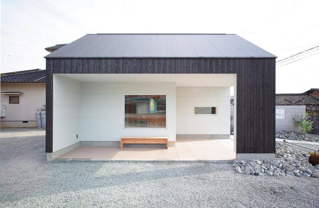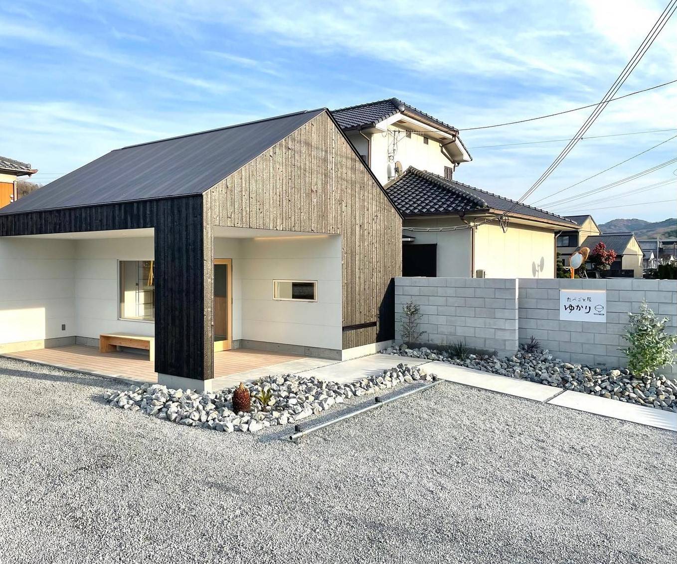 姫路市石倉の新築店舗。近隣集落との調和を考え外壁に杉焼板を採用しつつ、フォルムに特長を持たせることでモダンな印象となるようデザインしました。