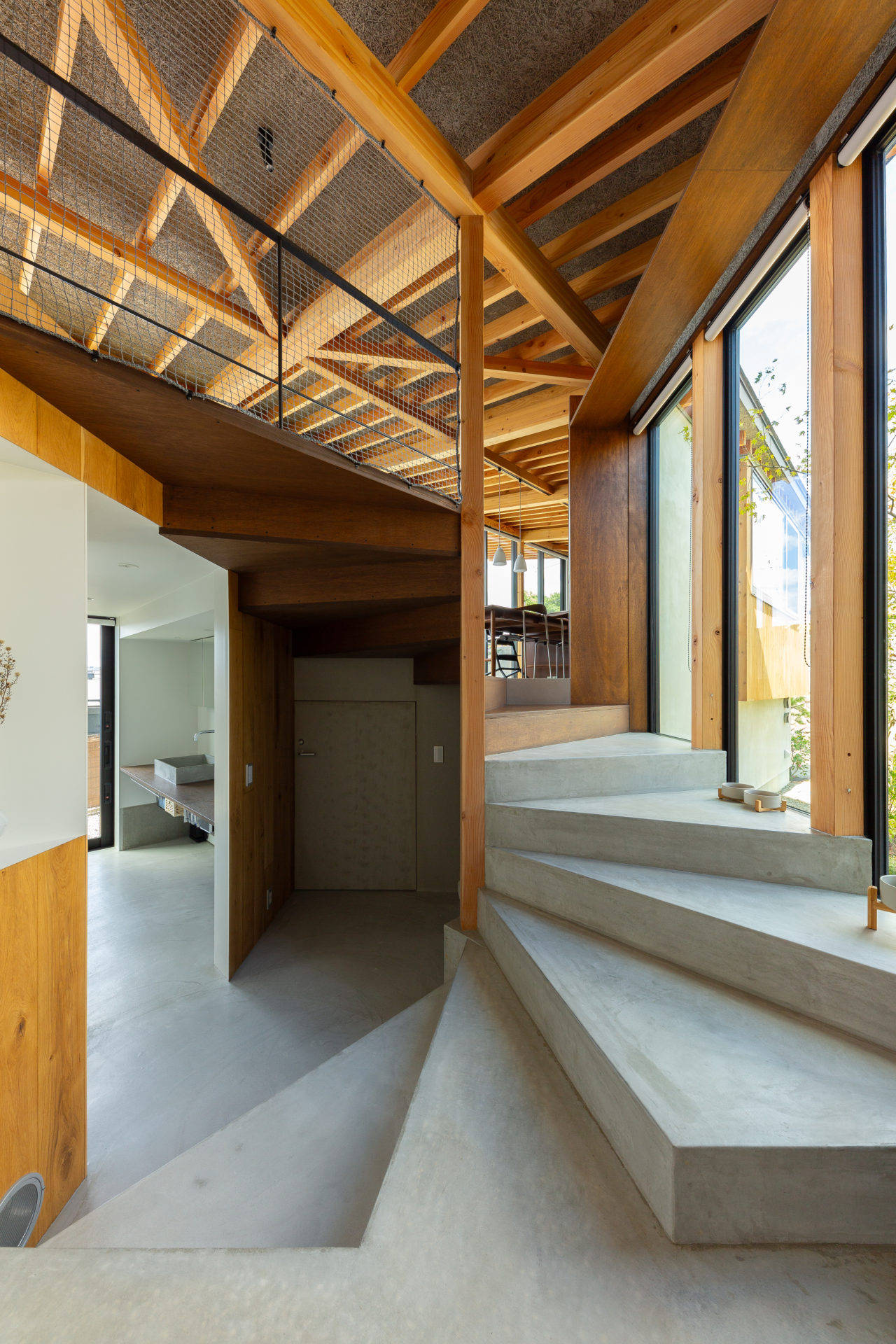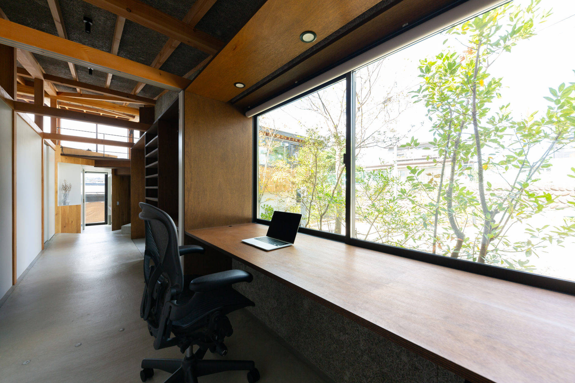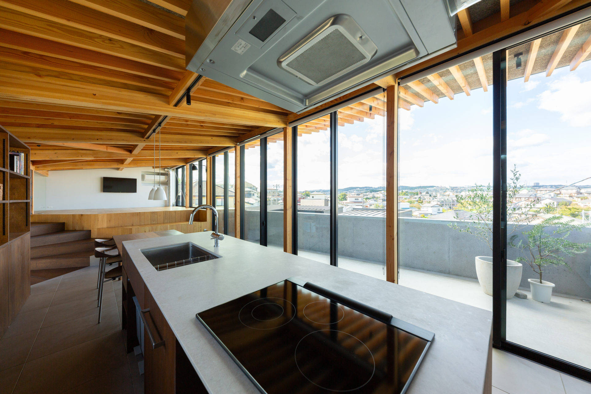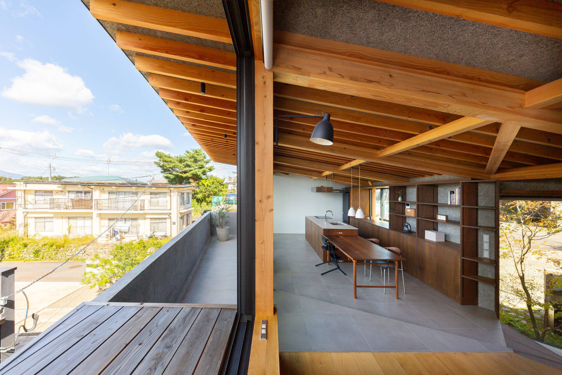 豊かなランドスケープと建築が調和しながら混ざり合い、そこに緩やかなL型の大屋根が掛かる伸びやかな住宅である。