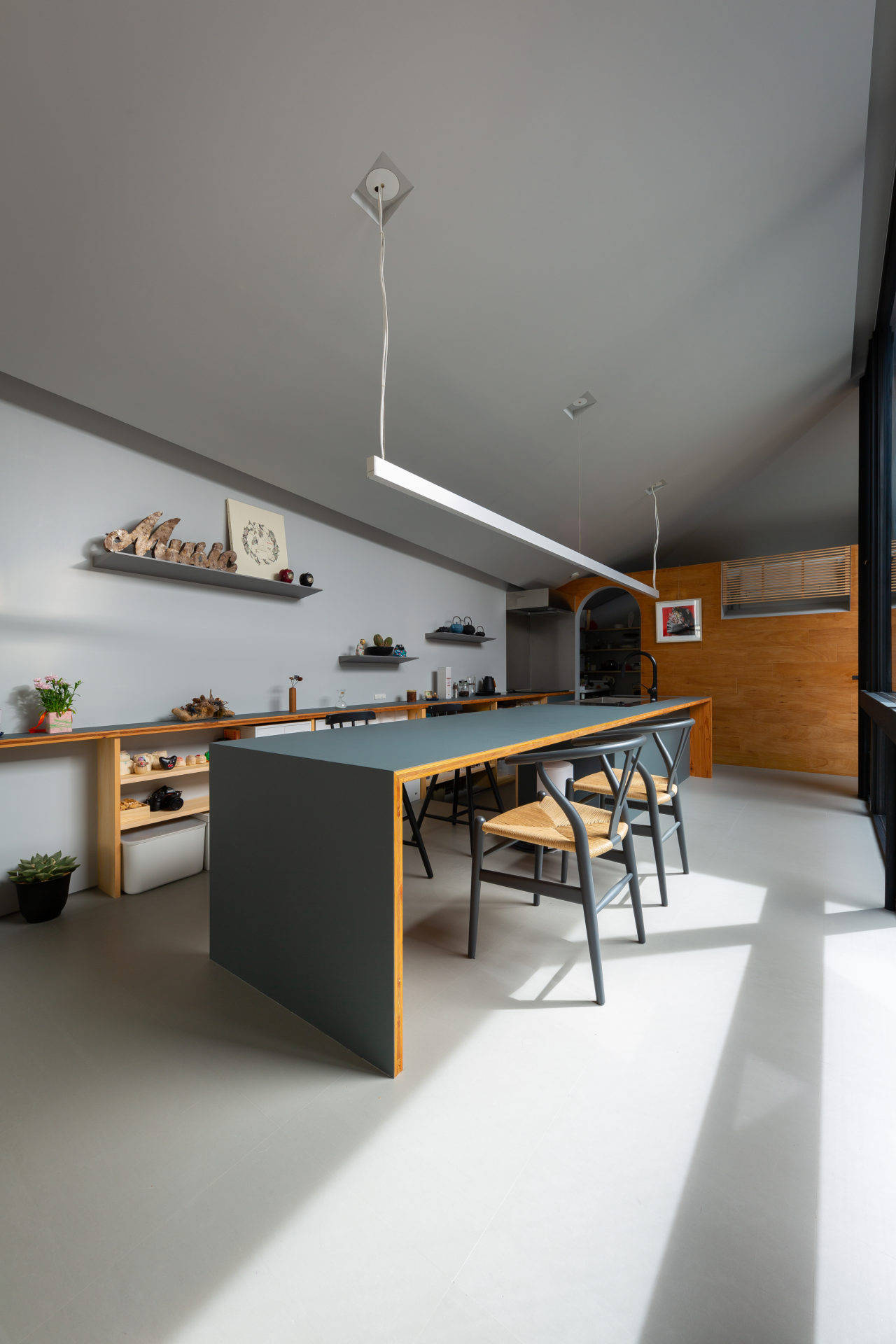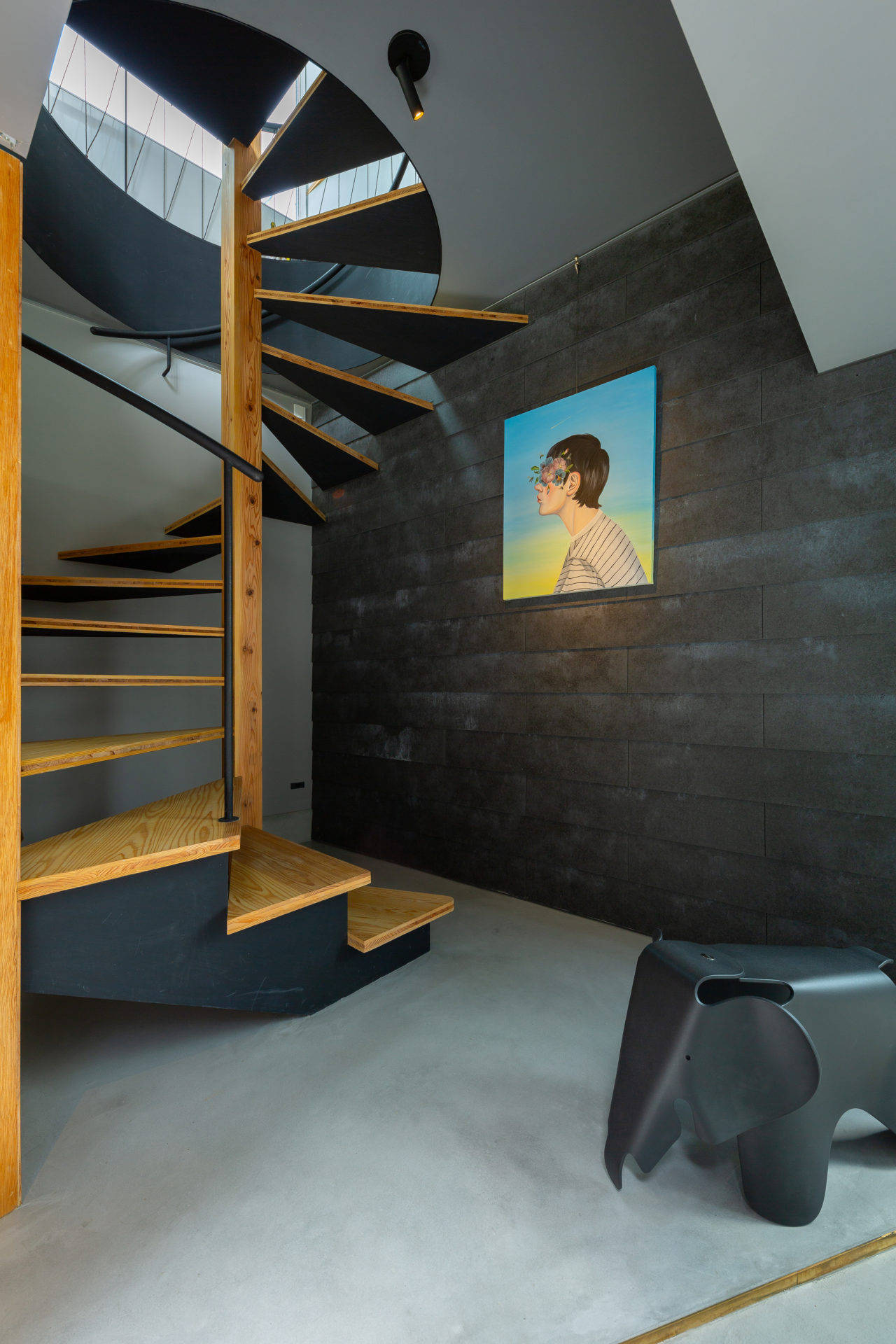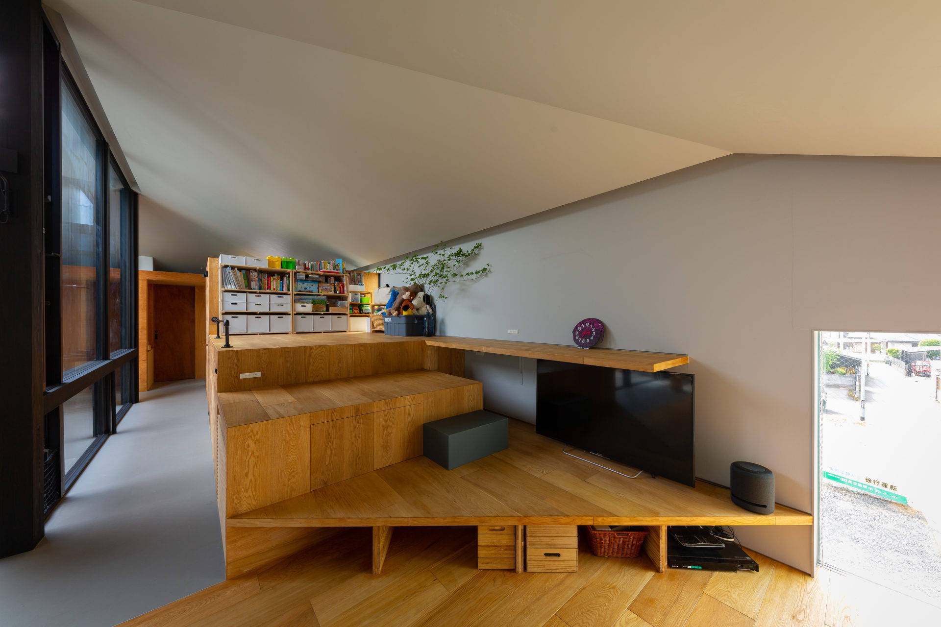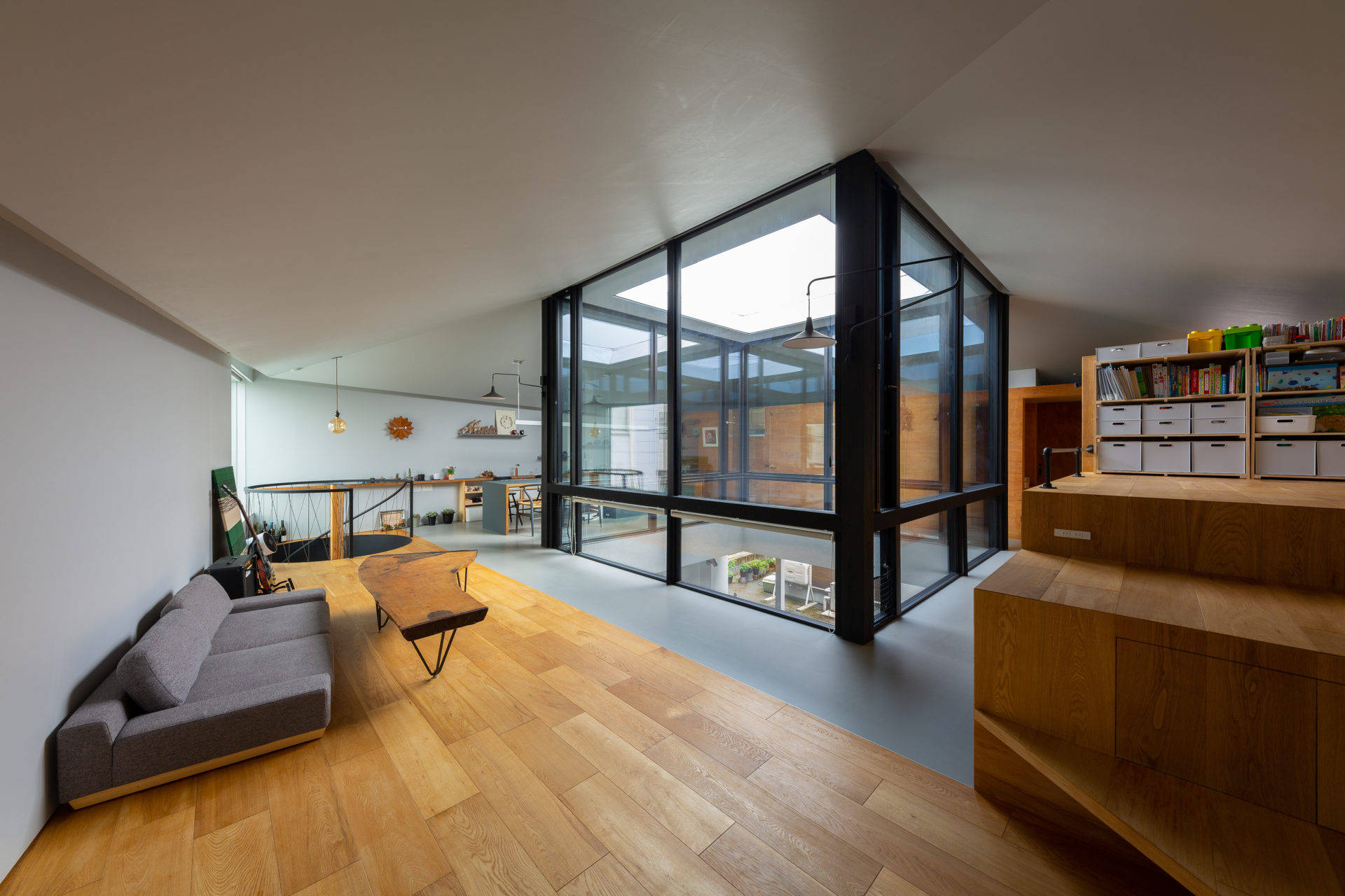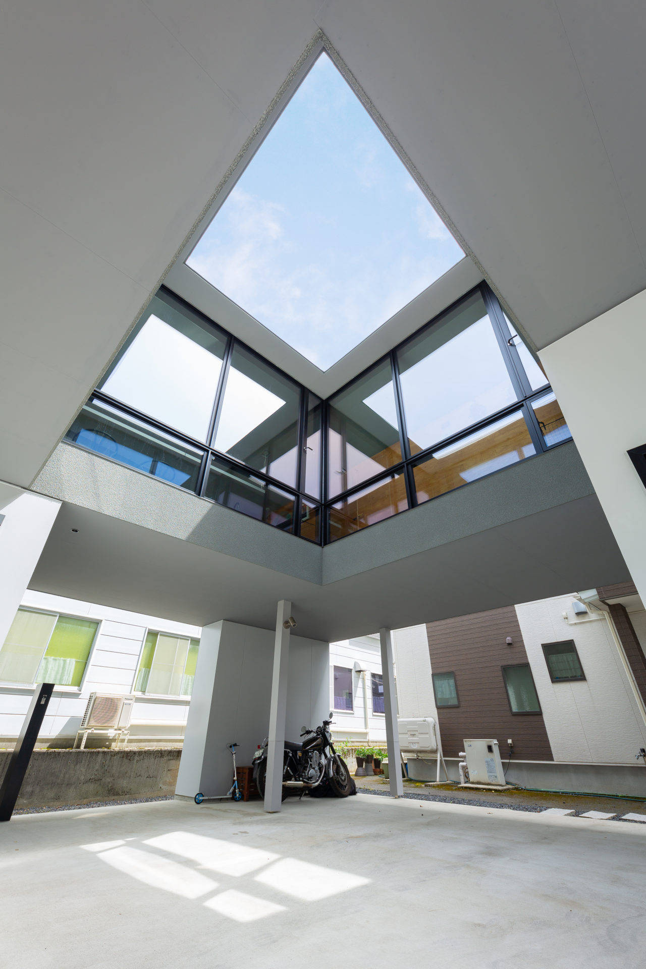 上階は中央に吹抜を設けて“空への意識を高める”一室空間として作ることで、自分たちだけの空を有する住宅です。