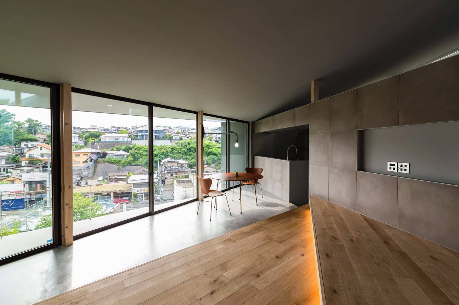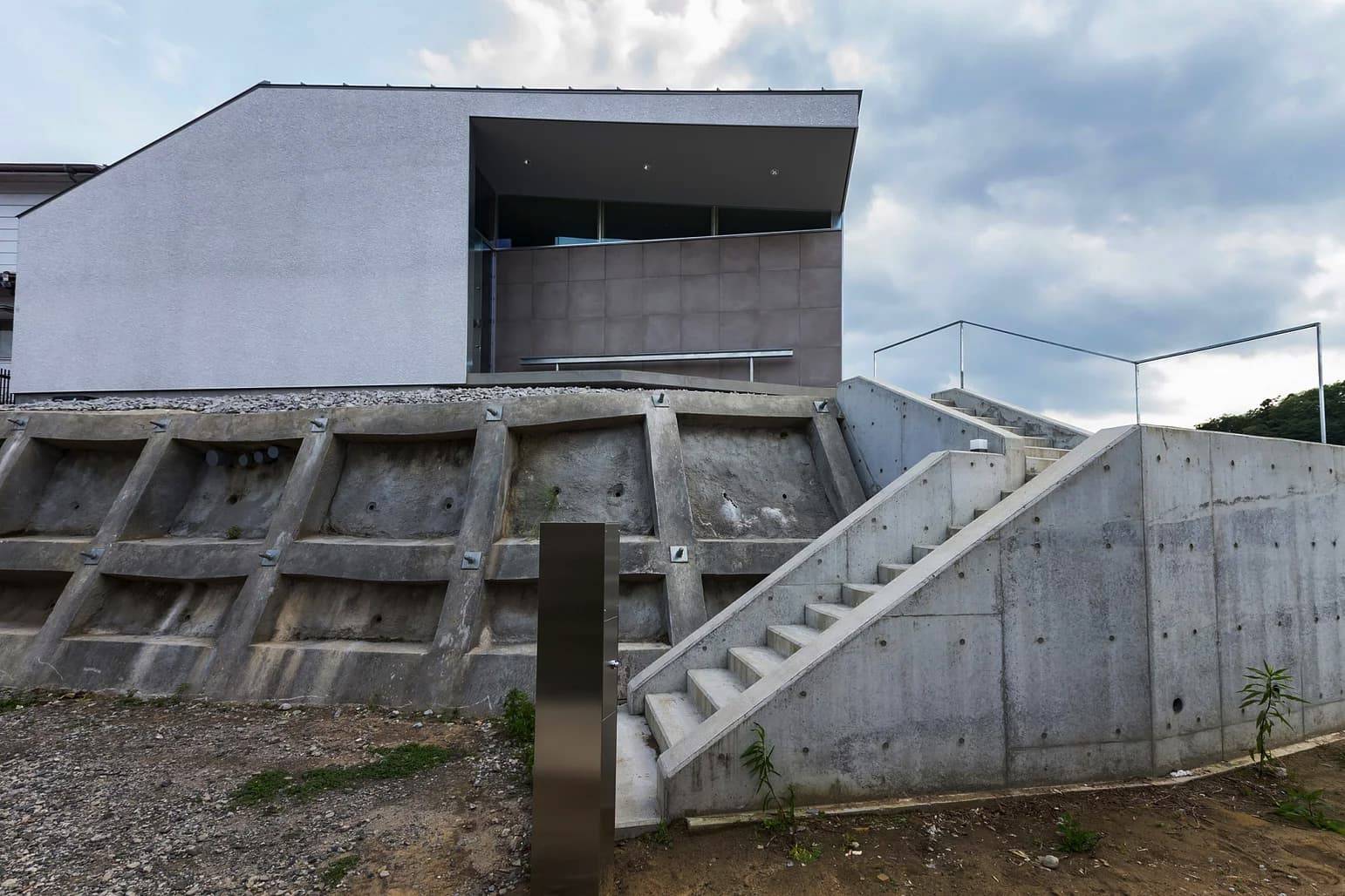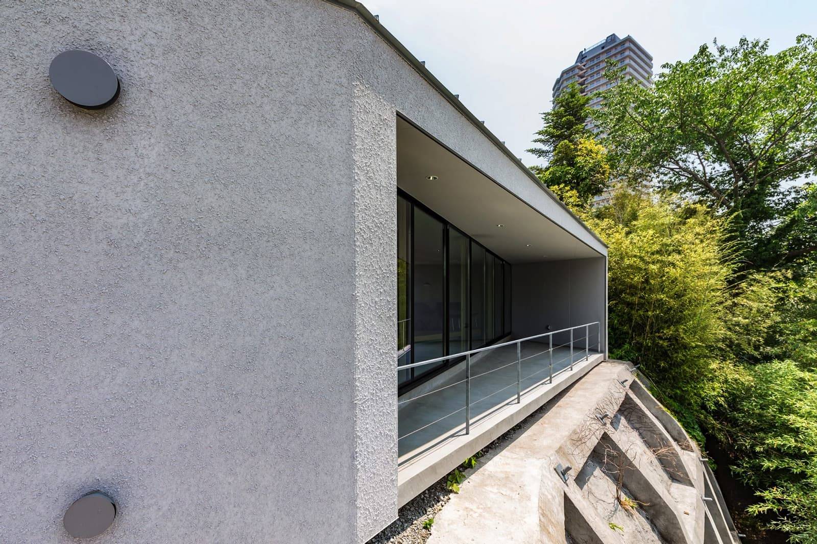 そこで、擁壁に干渉しないように建物を建て、擁壁に干渉しそうな部分は、半外部のテラスや玄関ポーチをキャンチレバー(跳ね出し)の基礎や庇で構成しながら、擁壁際まで建築を近づけることとした。シンプルな正方形の平面を元に、眺望に合わせて対角線上に片流れの屋根を掛け、眺望や敷地の形状の成りに合わせてボリュームをカッティングしながら形を決めていった。既存の擁壁は、あたかも新築の上部に合わせてデザインしたような基壇のようにも見えたり、基壇の上にオブジェのような塊があるような状態を目指した。