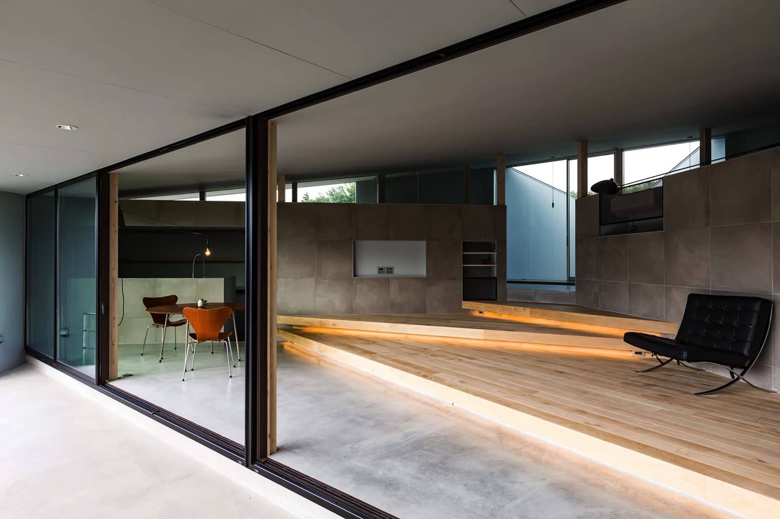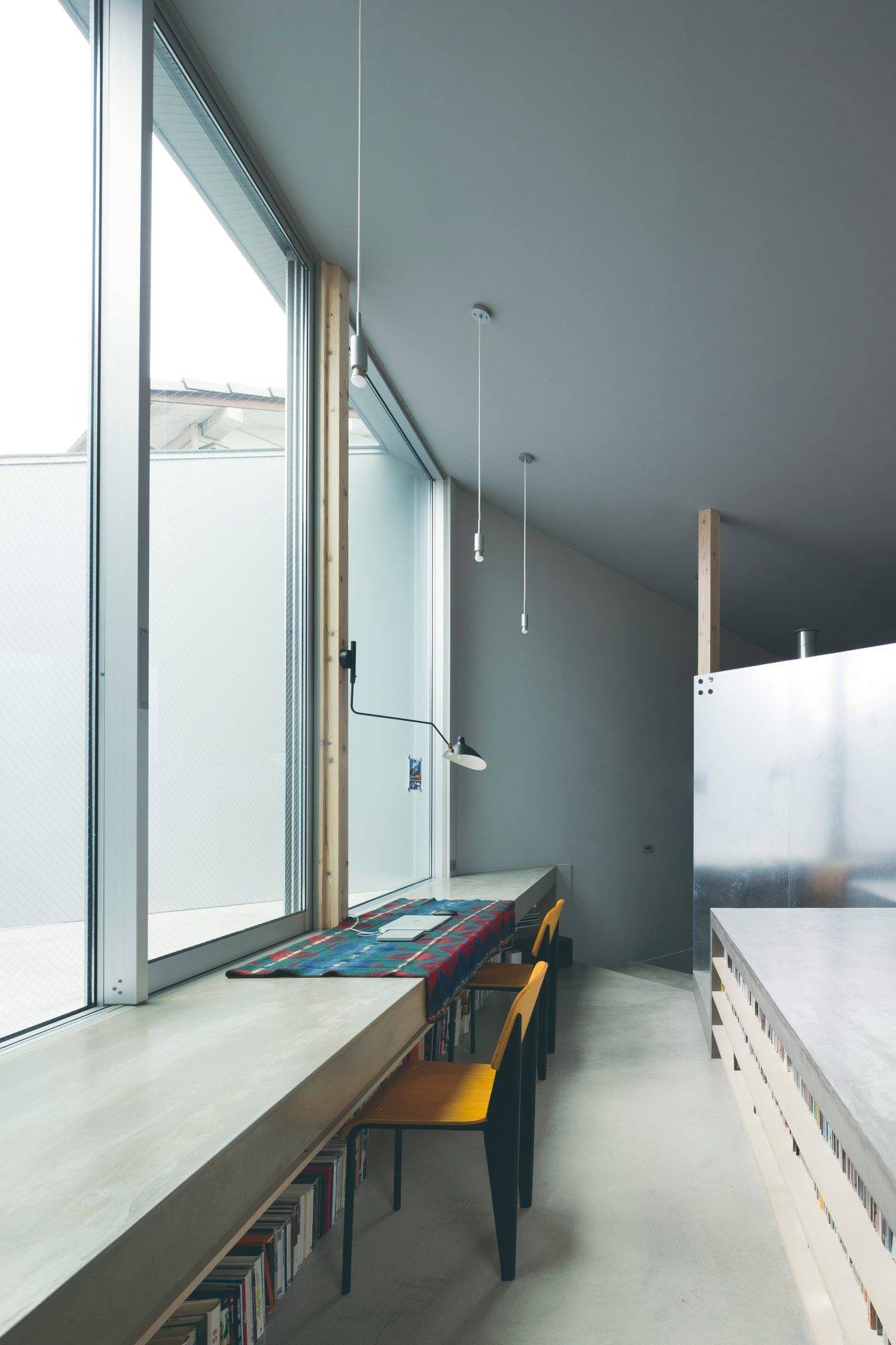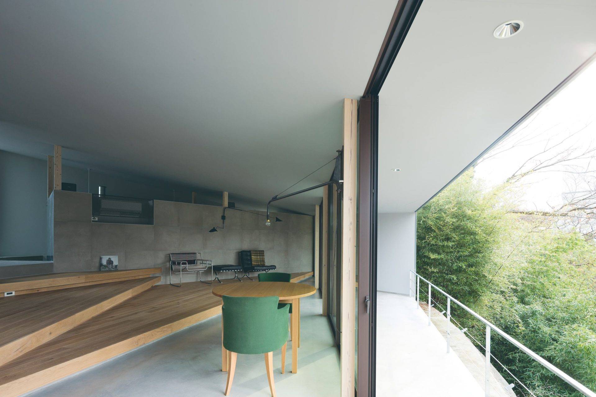 そこで、擁壁に干渉しないように建物を建て、擁壁に干渉しそうな部分は、半外部のテラスや玄関ポーチをキャンチレバー(跳ね出し)の基礎や庇で構成しながら、擁壁際まで建築を近づけることとした。シンプルな正方形の平面を元に、眺望に合わせて対角線上に片流れの屋根を掛け、眺望や敷地の形状の成りに合わせてボリュームをカッティングしながら形を決めていった。既存の擁壁は、あたかも新築の上部に合わせてデザインしたような基壇のようにも見えたり、基壇の上にオブジェのような塊があるような状態を目指した。