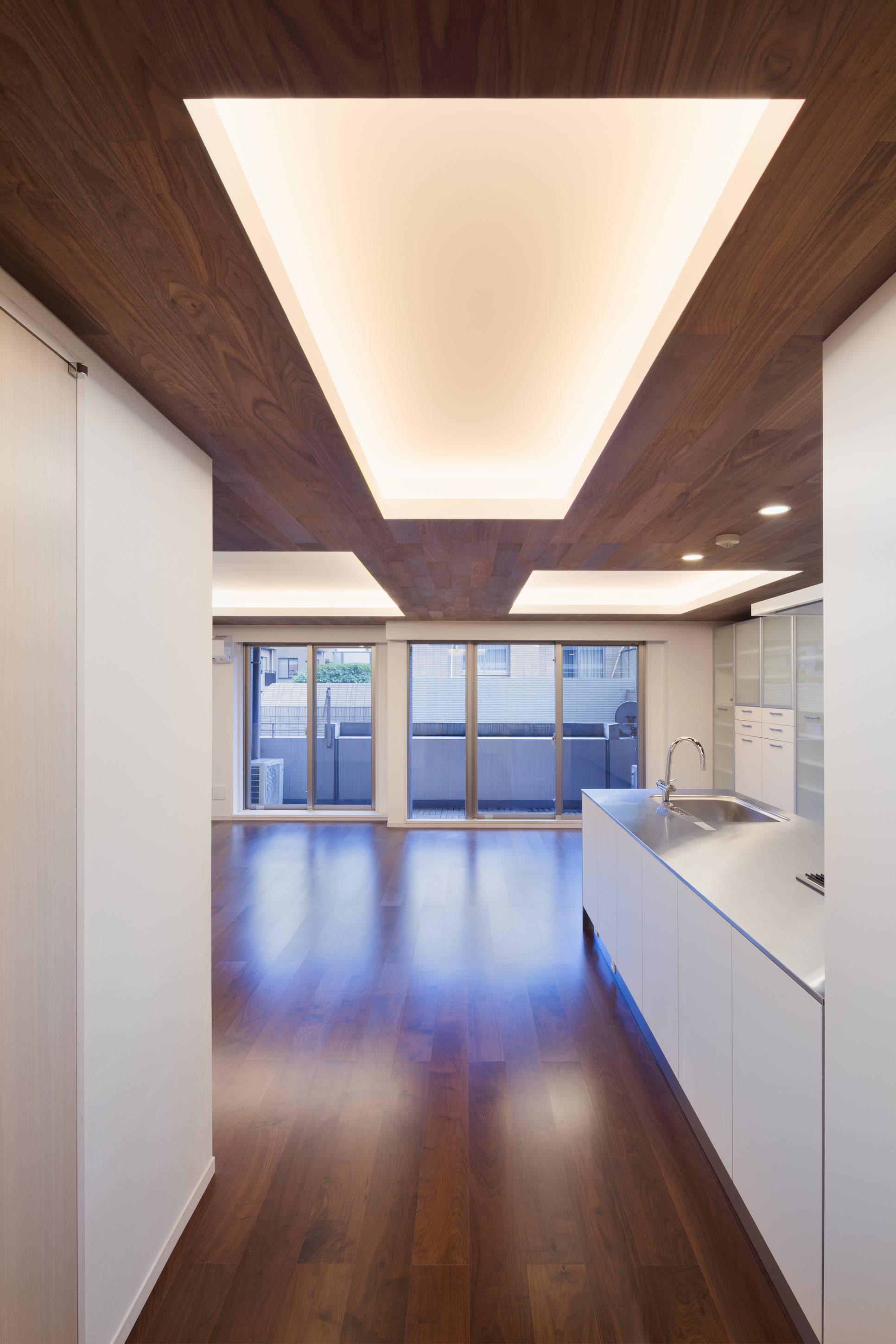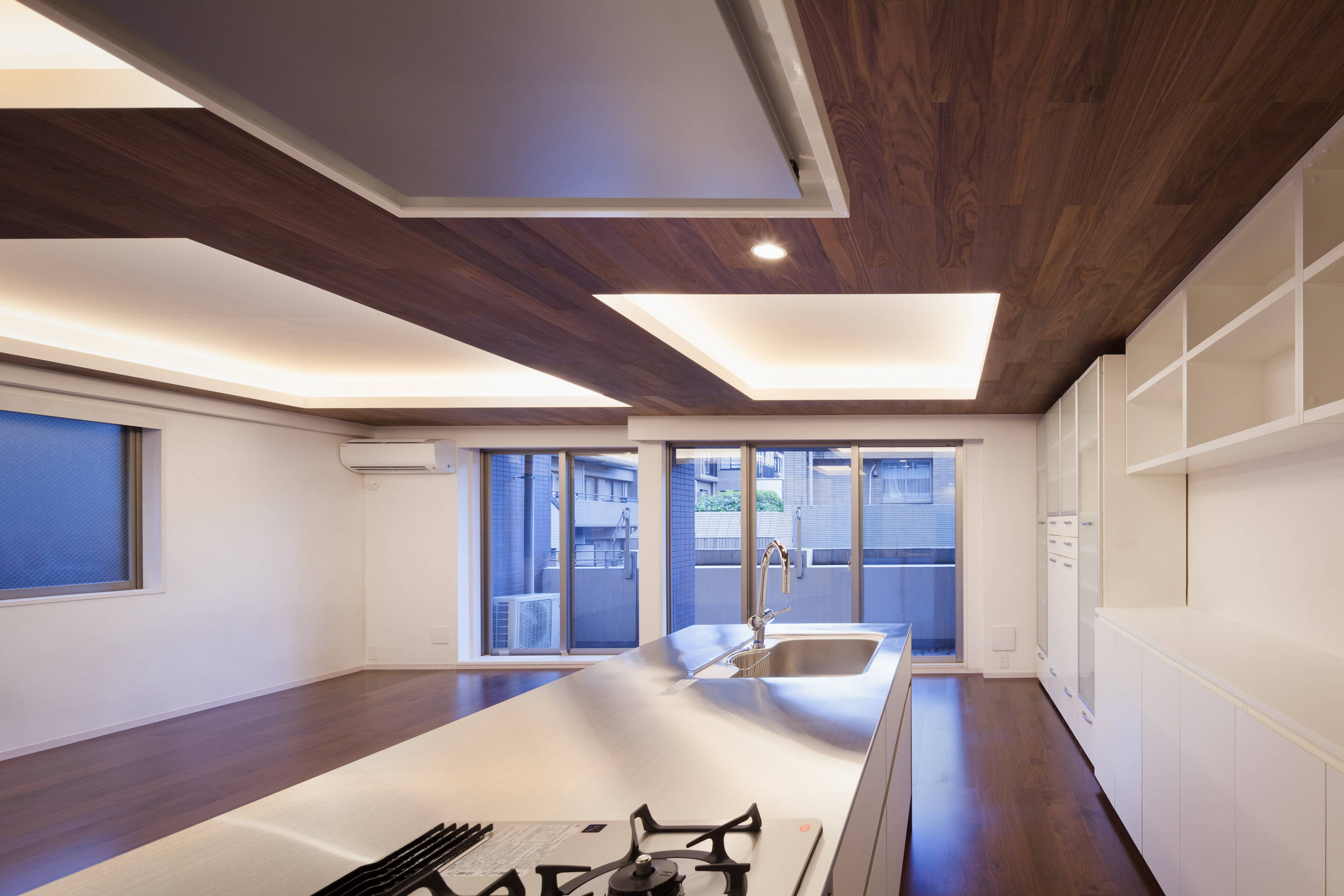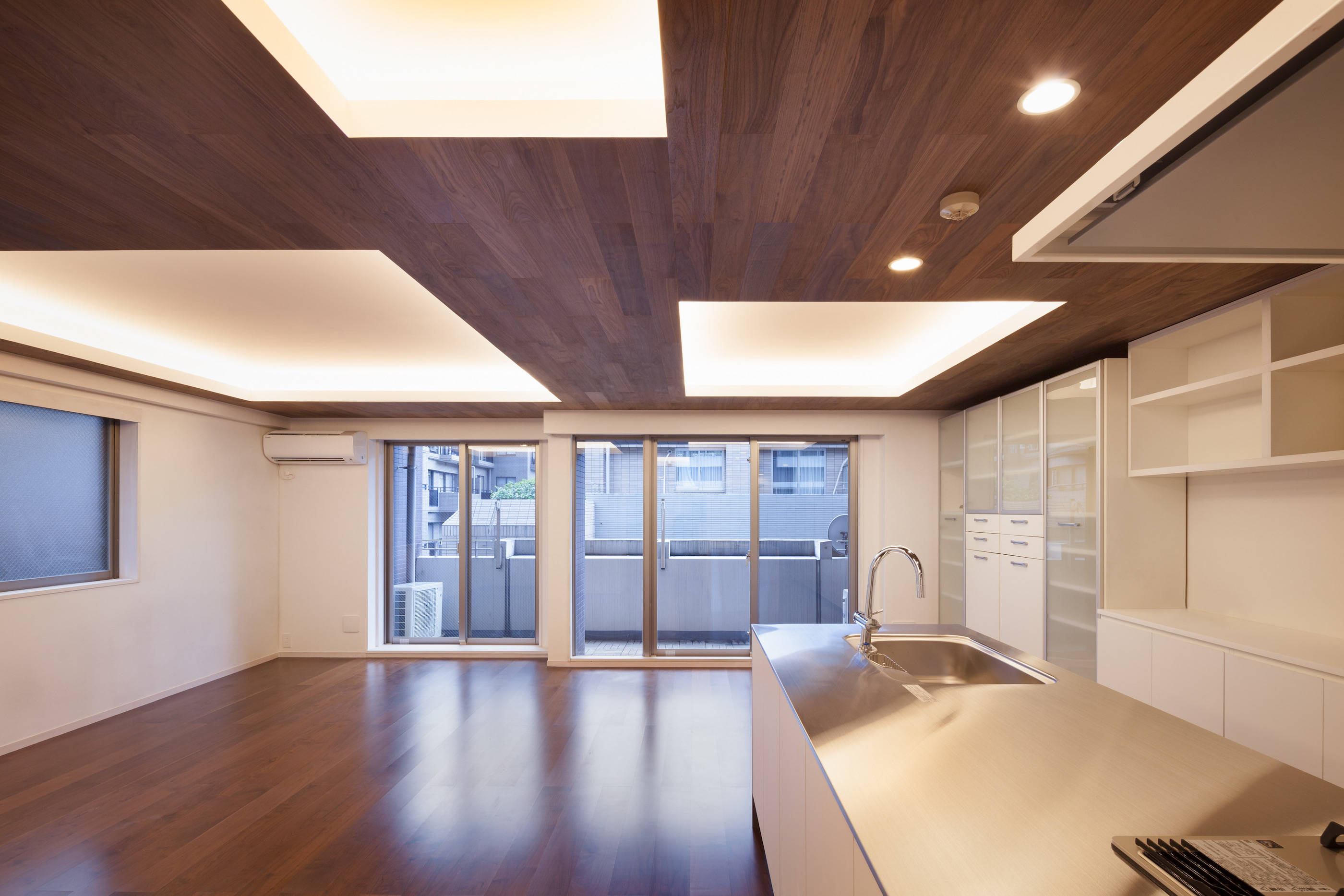 床と天井をローズウッド仕上げで少し高級感を、キッチンはオープンにして料理中も友人との会話を楽しめるように、天井は圧迫感がないように穴を開け、折上げ天井にして間接照明で部屋全体の照度を確保しました。