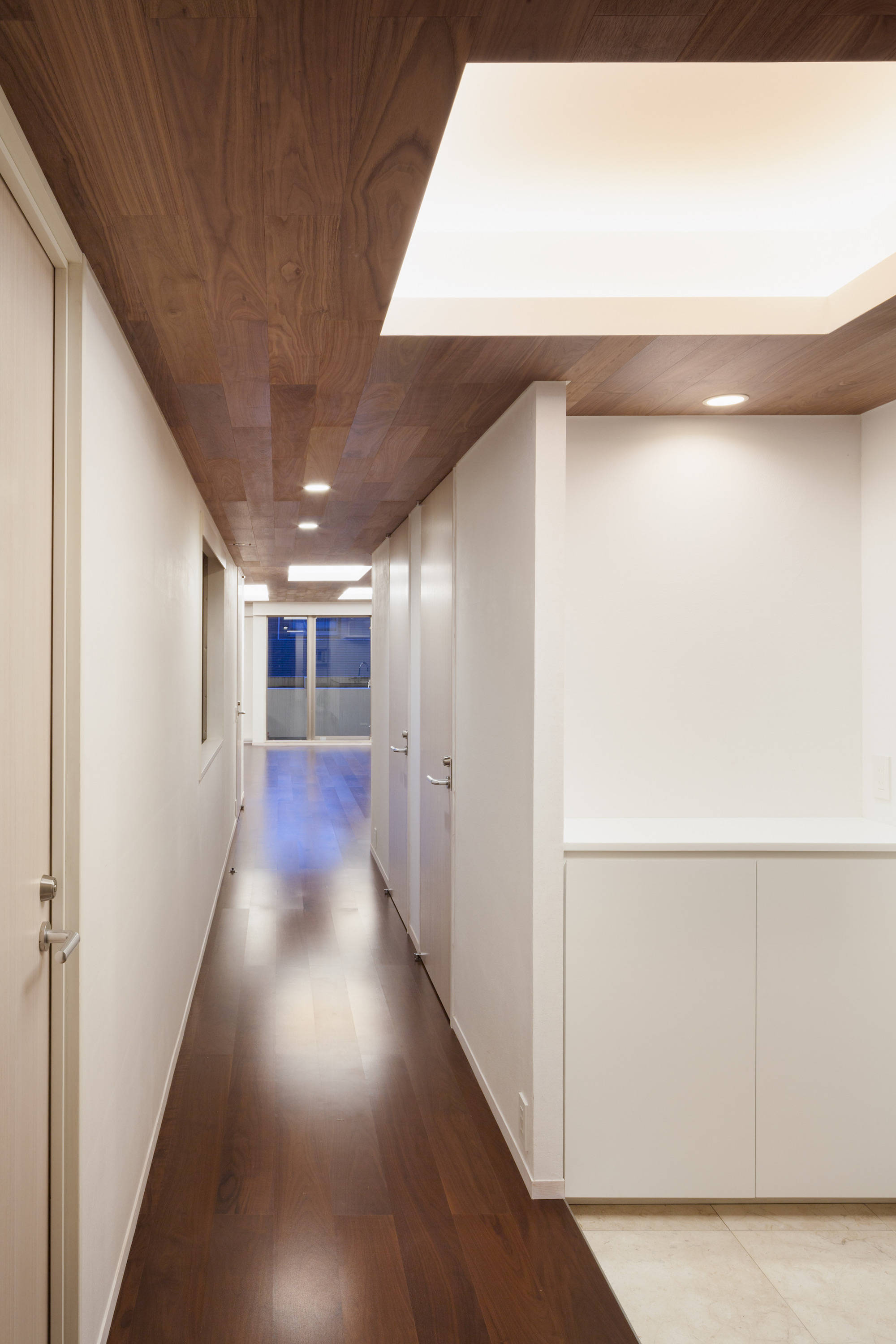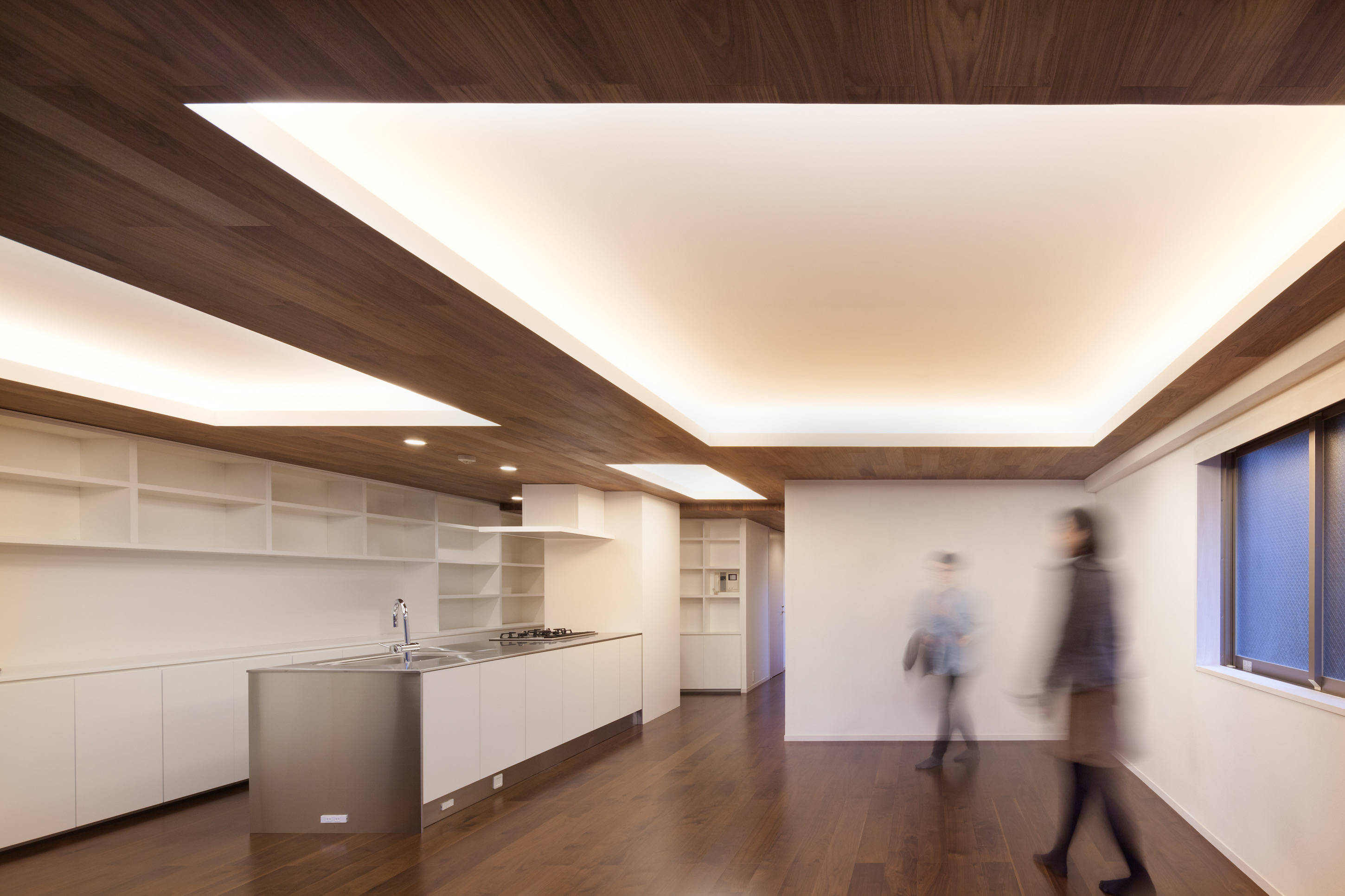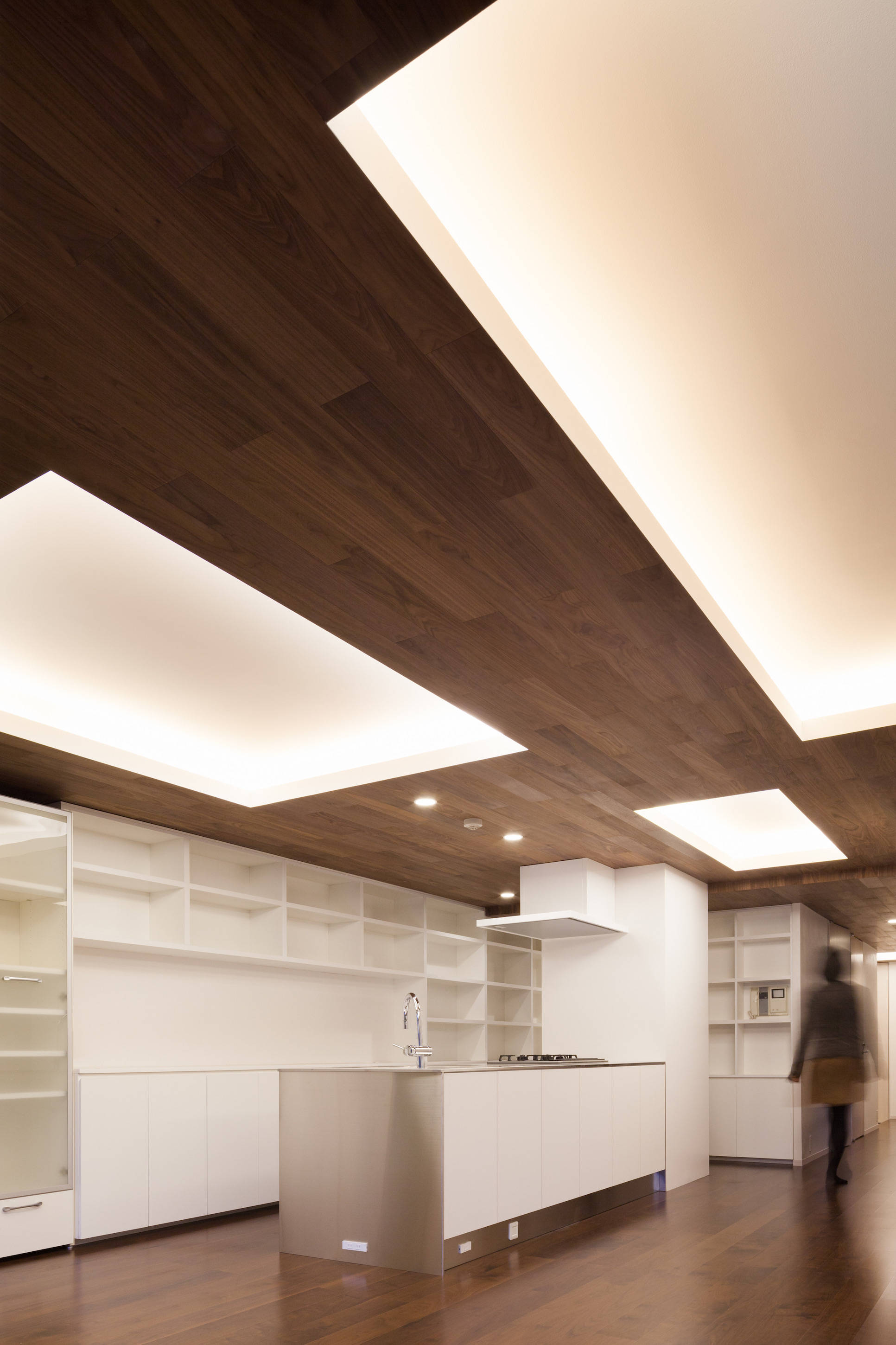 床と天井をローズウッド仕上げで少し高級感を、キッチンはオープンにして料理中も友人との会話を楽しめるように、天井は圧迫感がないように穴を開け、折上げ天井にして間接照明で部屋全体の照度を確保しました。