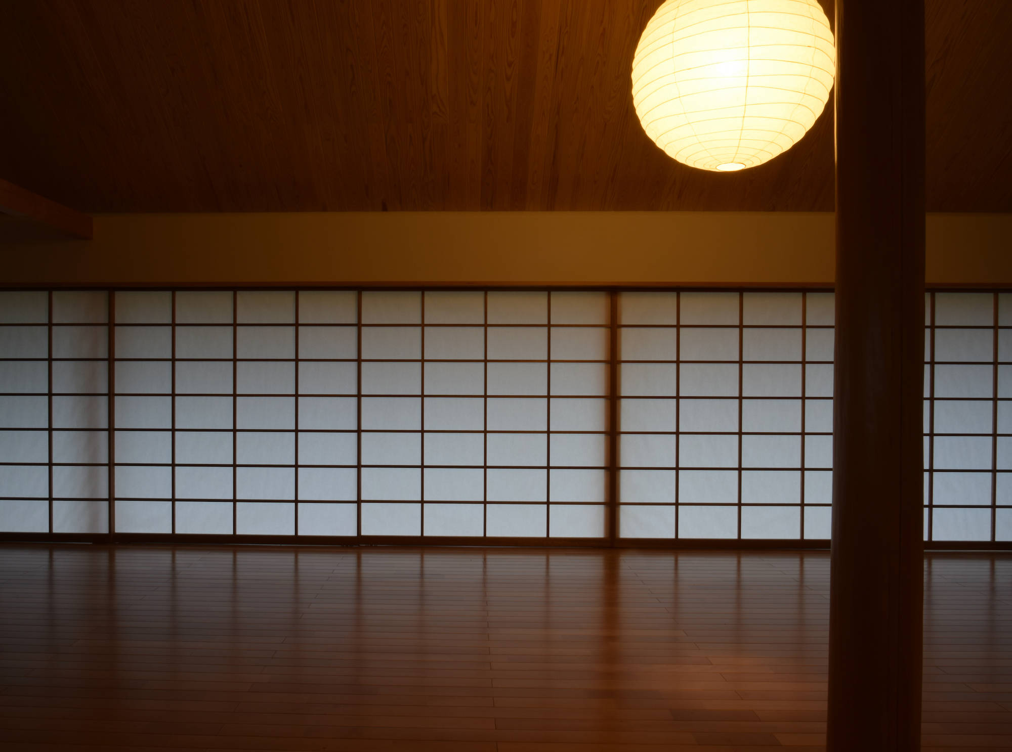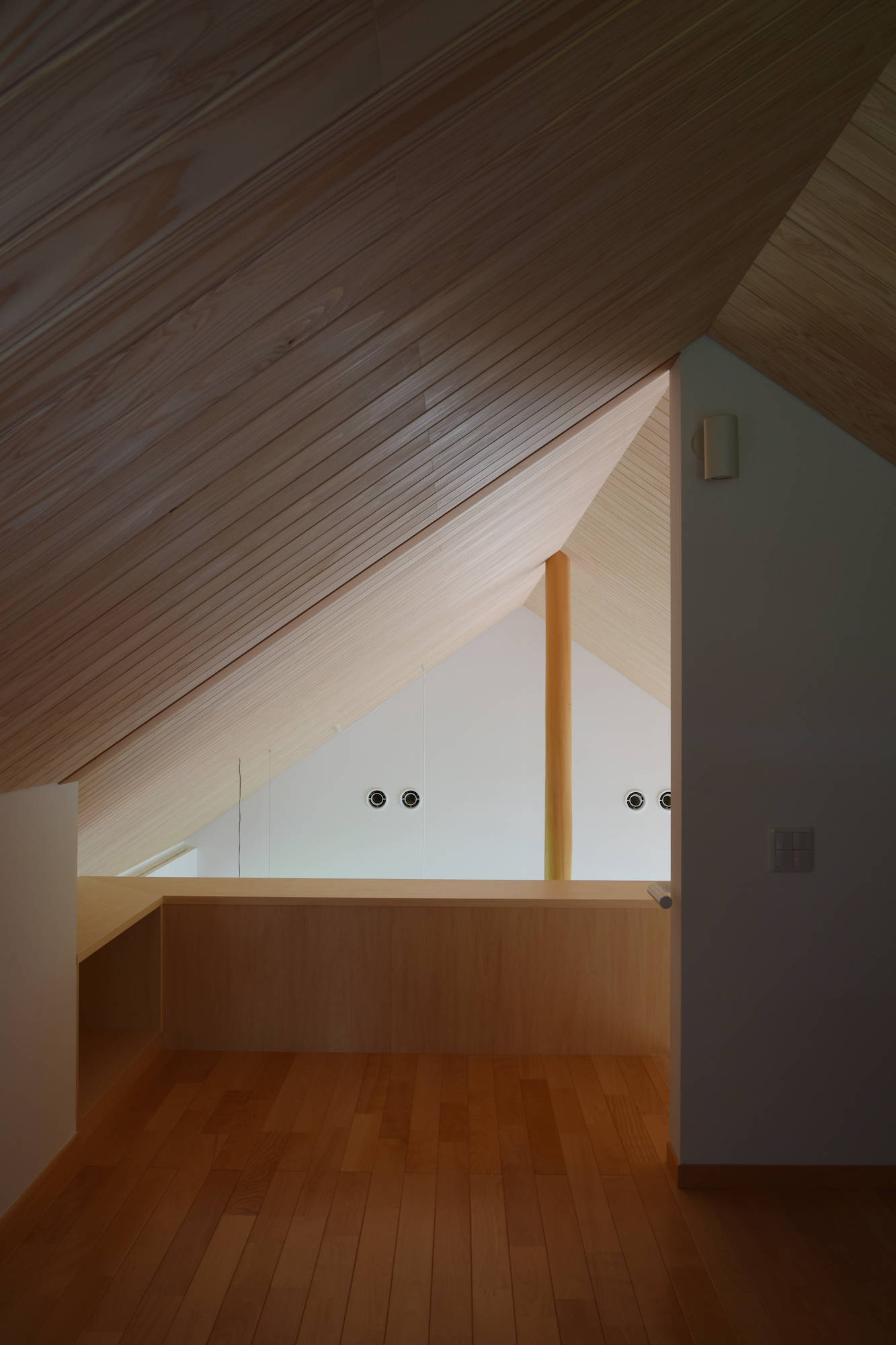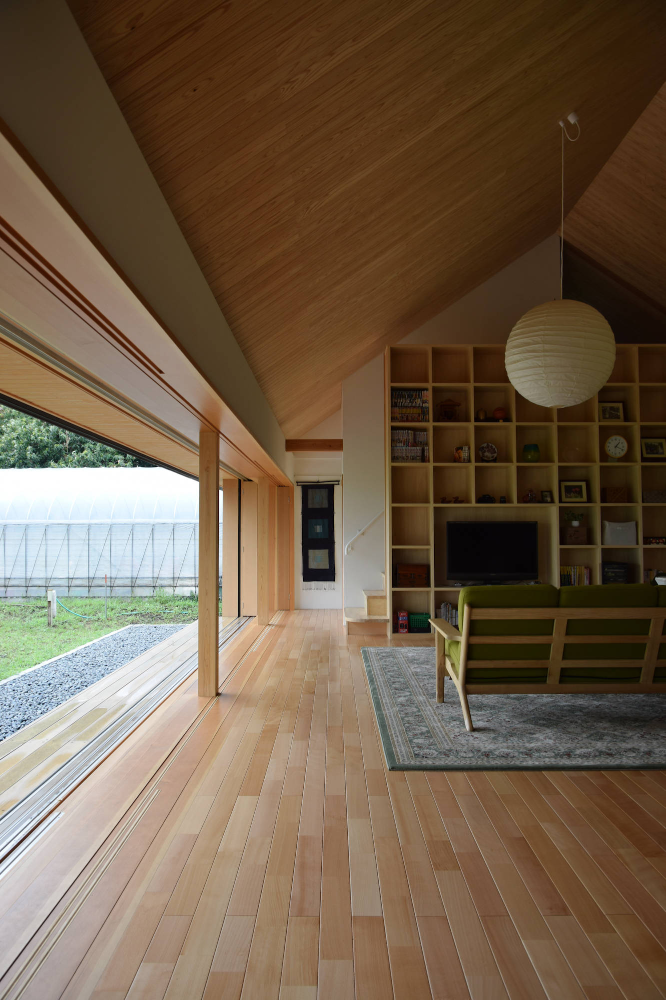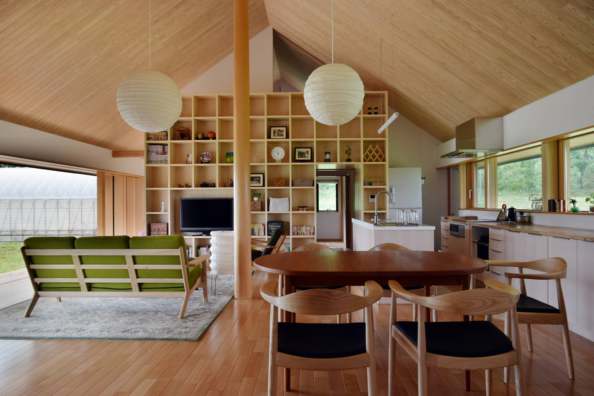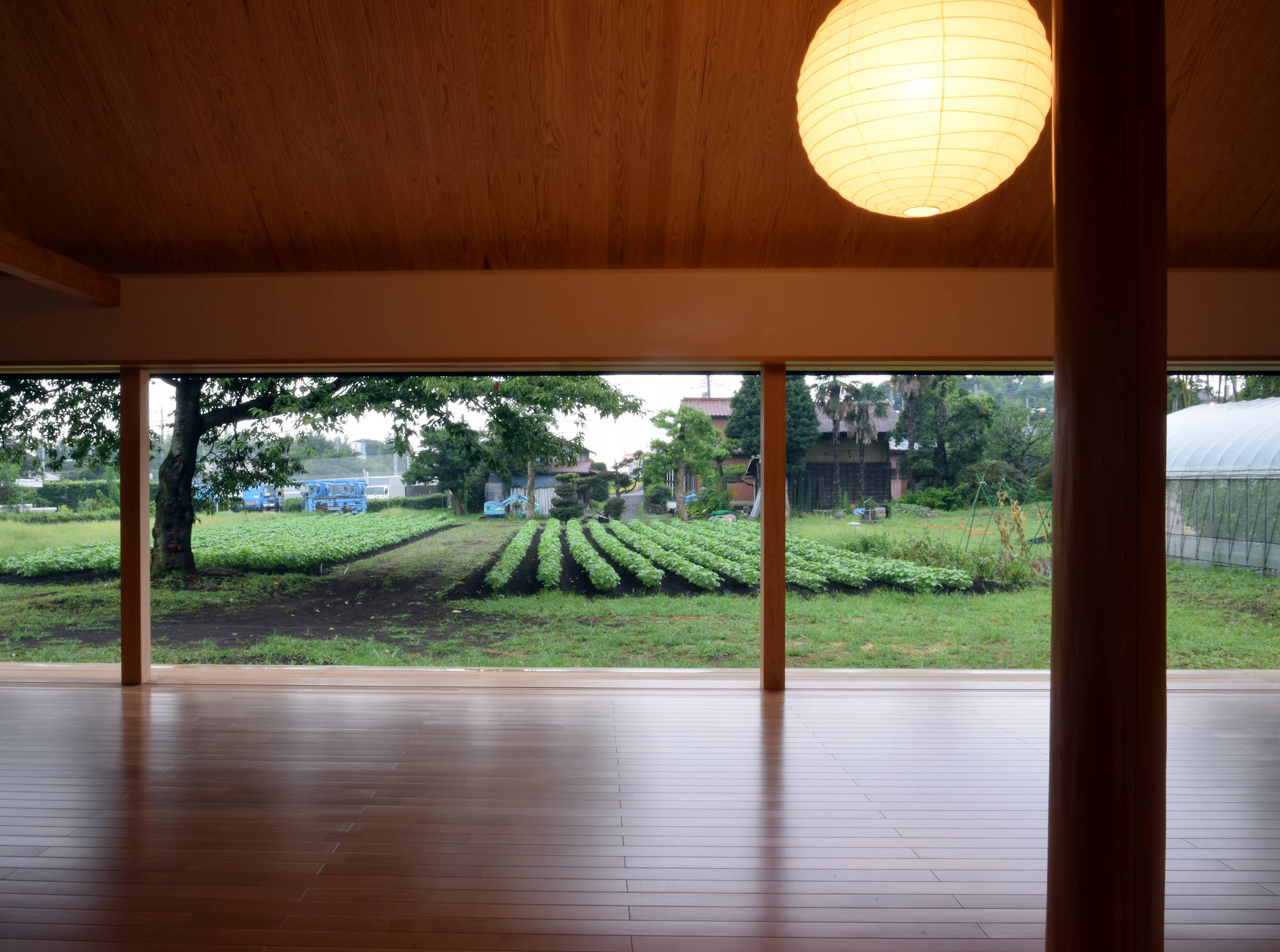 田畑と宅地が入り交じる郊外に建つ住宅。クライアントは三人のご子息が自立され、再び二人で暮らすこととなったご夫婦。要望は「広々としたリビングと和室二部屋」と至ってシンプルなもので、お二人の素朴な人柄にふさわしい“現代の民家”を目指しました。外形は単純な家型とし、内部はリビング、ダイニング、キッチンを正方形のワンルームに納め、その中央に磨き丸太の大黒柱を据えています。これは日本の古民家の特徴である「田の字型プラン」の大黒柱を間仕切から解放した形で、空間にダイナミックさと流動性をもたらします。また畑に面した大開口と木製サッシは、現代の民家だからこそ可能となった開放性と快適性を生み出し、季節の移り変わりとともにある暮らしを実現させます。