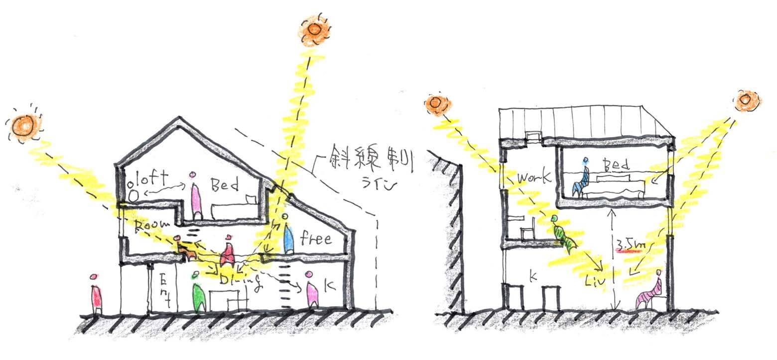 住まいに対する要望は、在宅勤務が多いこともありワークスペースが必要であることや、広々した明るいLDK空間、個室を2つ以上つくること等。メインの寝室は区切らなくてもよいことやリビング位置はプランによりフレキシブルに考えていただけることもあり比較的自由にプランの構想を練らせていただいた。