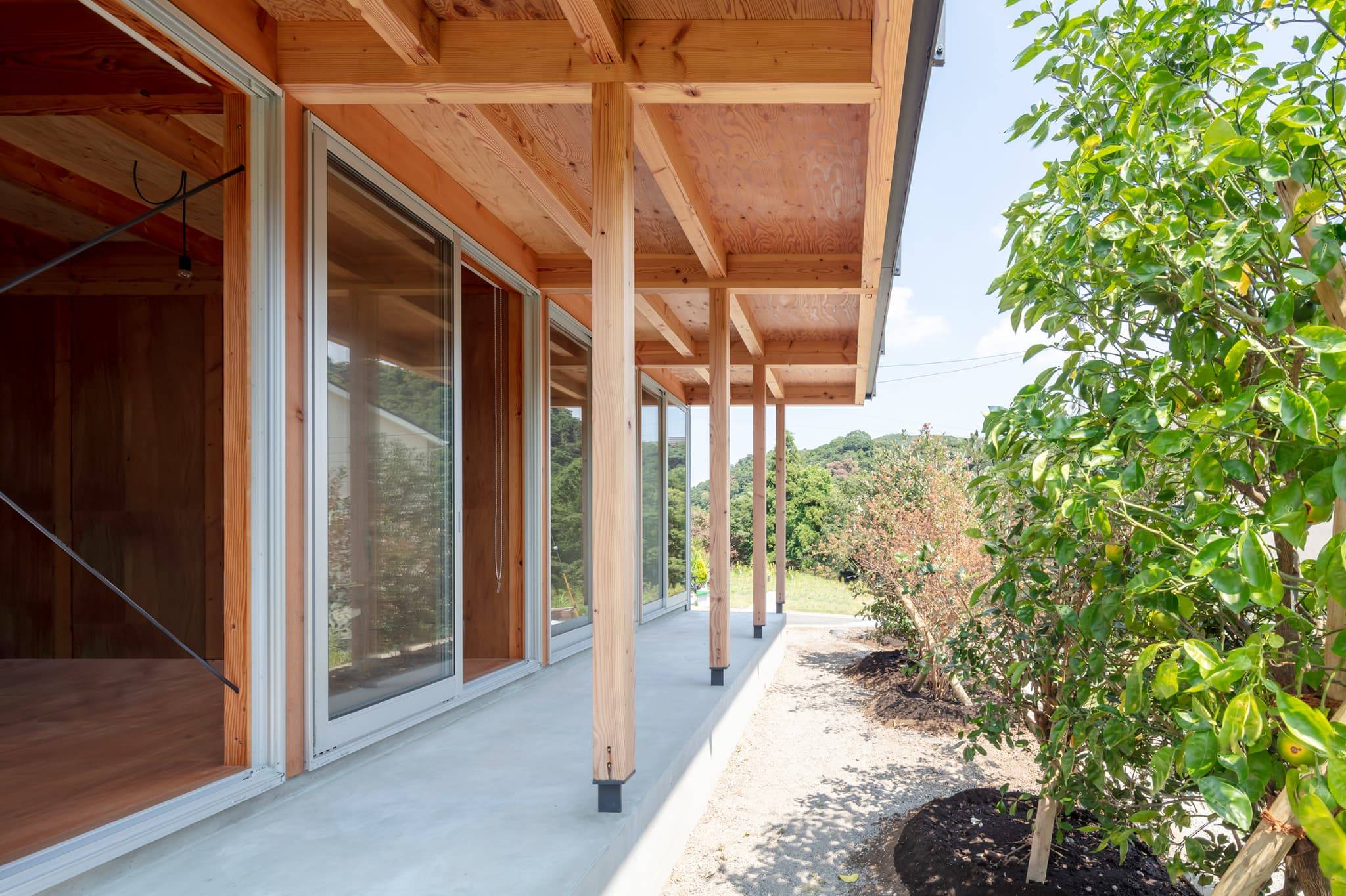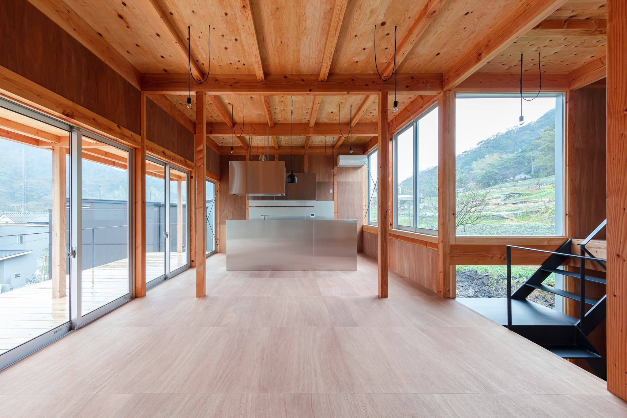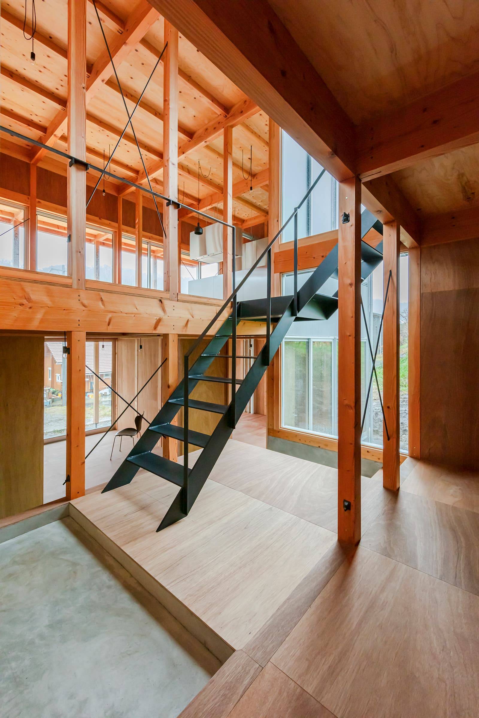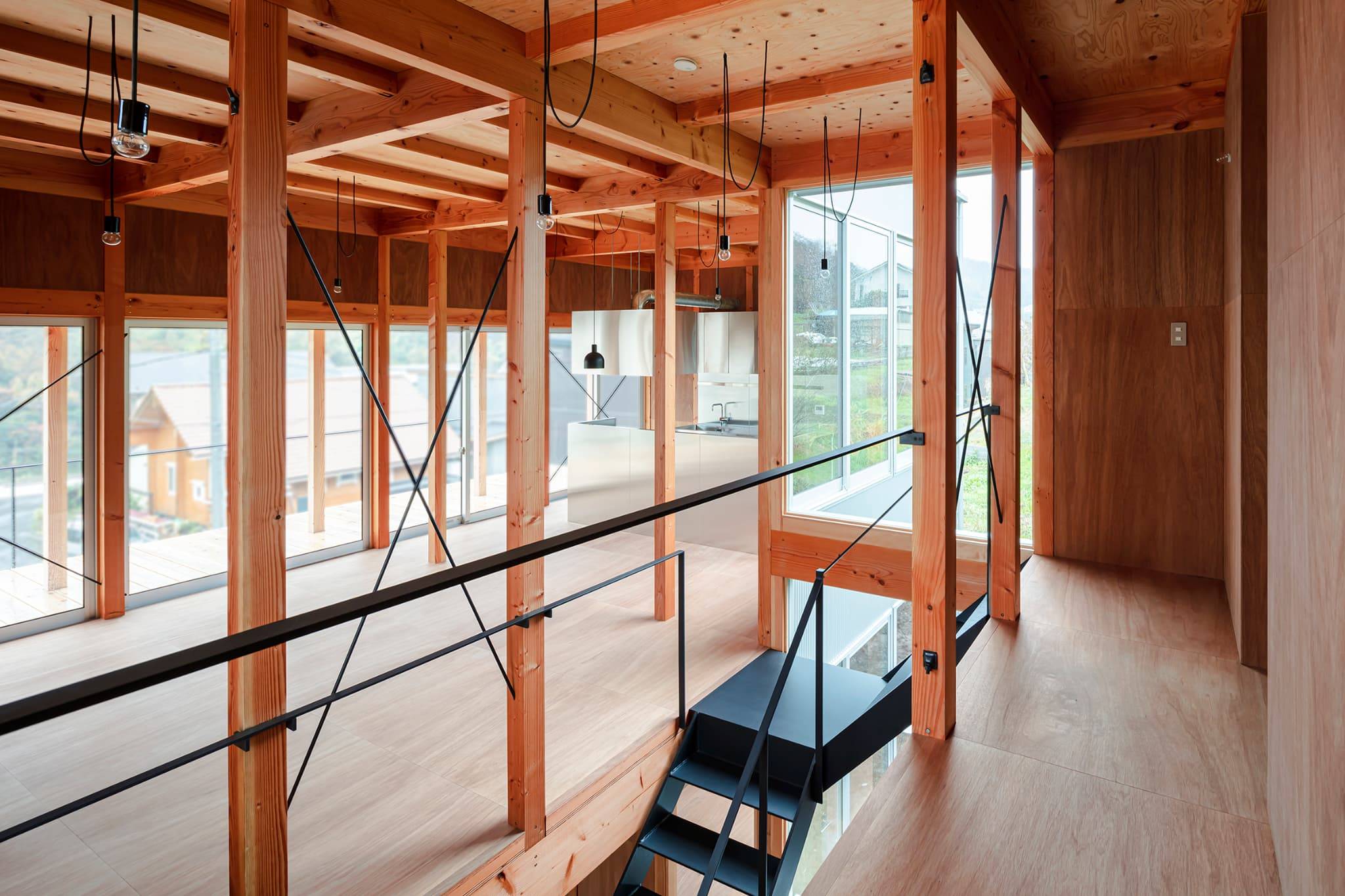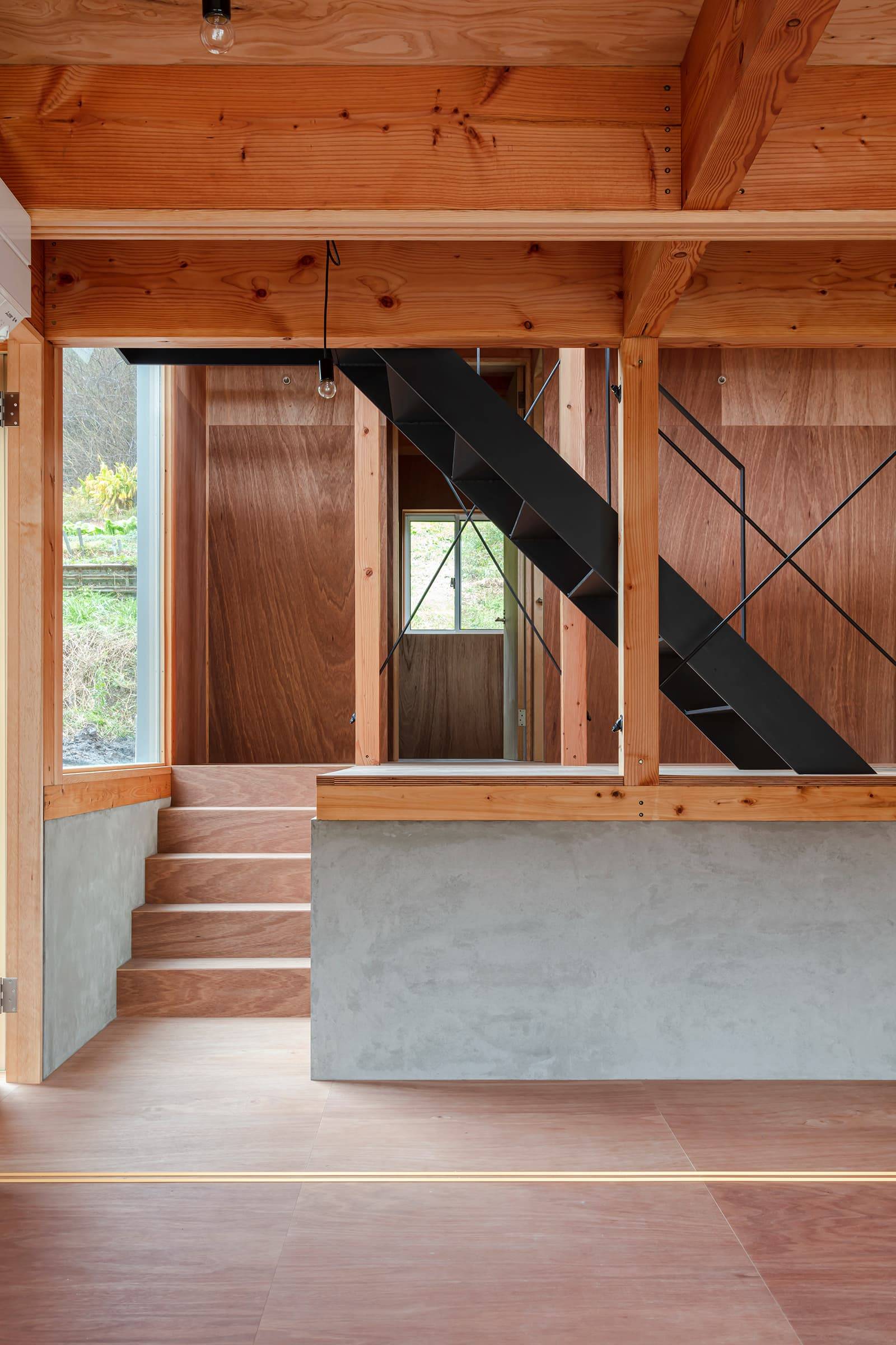 葉山町の海岸から徒歩20分ほどに位置し、北側の山、南側の小川に囲まれた自然豊かな住宅地の専用住宅の計画。敷地は南北方向に傾斜があり、その傾斜を建築の中にそのまま取り込み、プラットフォーム状にレベル差のある内部空間を実現した。段々の床は周辺の林のような柱によって支持され、北側の山、南側の川を望む開口部やテラスによって、外部の景色や空気を取り込む敷地に溶け込むような設計となっている。耐力壁のブレース、柱脚金物、樋、階段や手摺の細部は、既製品ではなく鍛冶屋による鉄工事を用いたディテールとし、職人の手仕事を感じれる仕上がりとした。