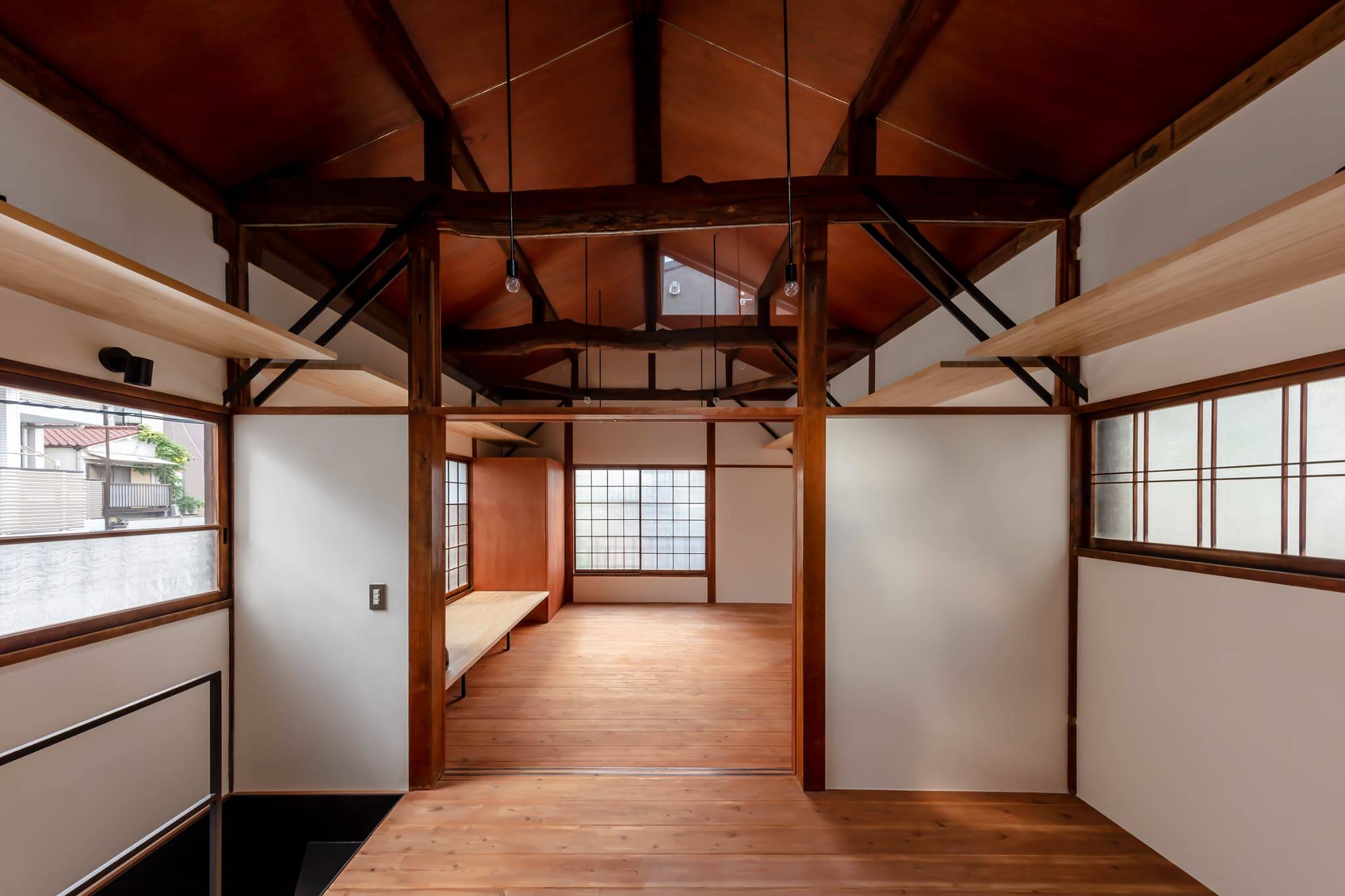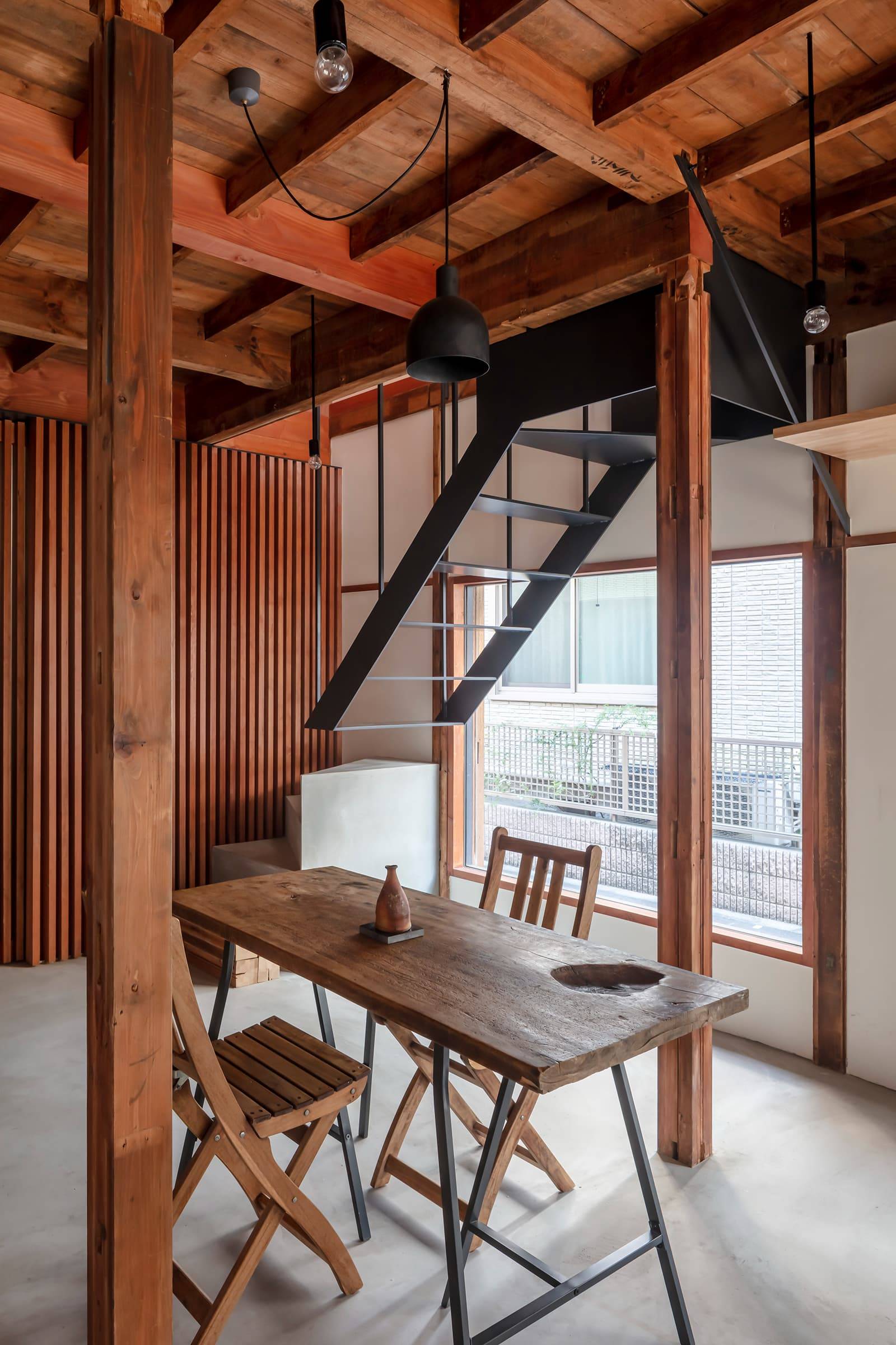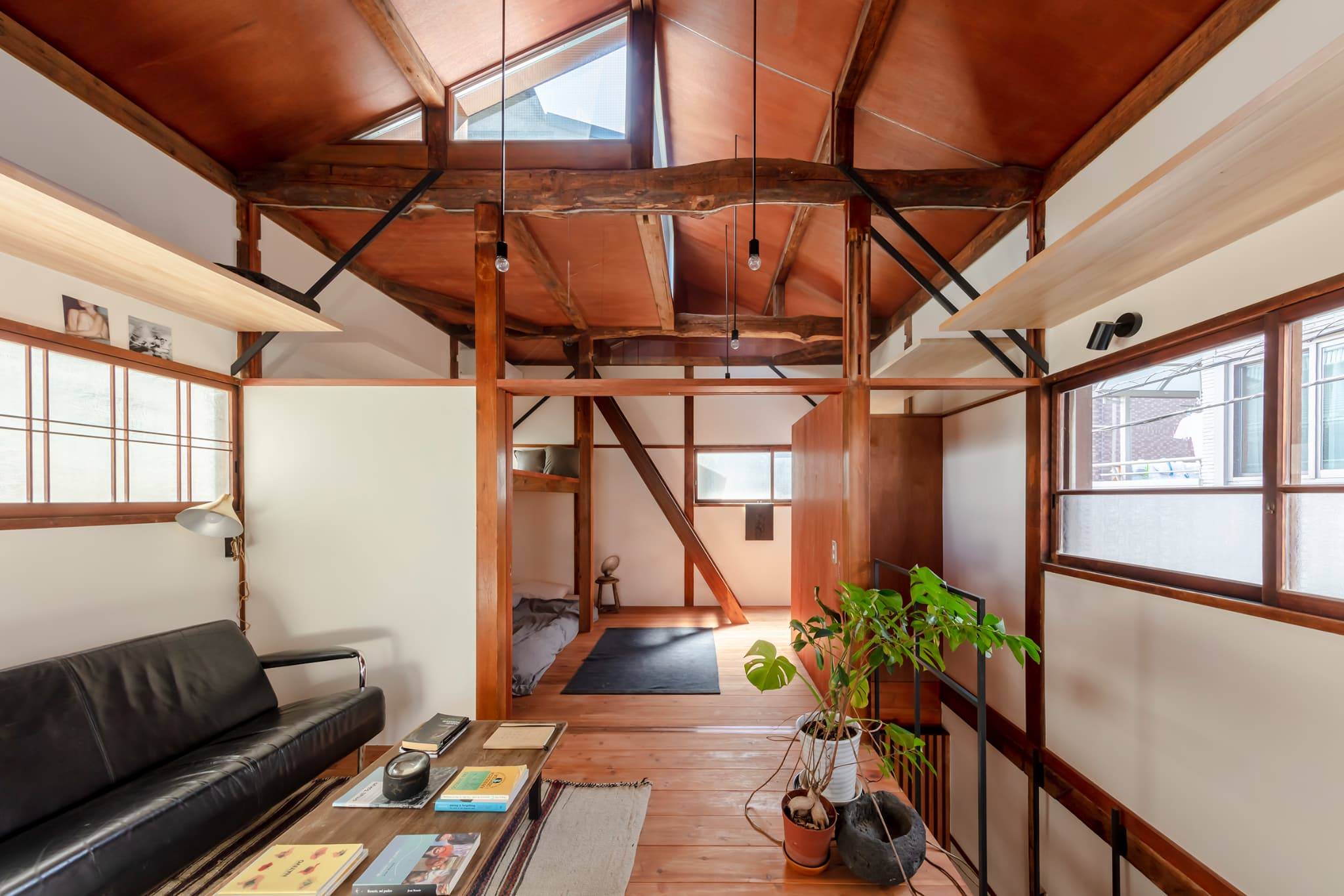 東京千駄木の小さな民家を改修し、海外の芸術家の東京滞在の場とした計画。構造的補強としてフラットバーの方杖とその座屈止めの棚板を設置することで、空間を細分化していた壁を撤去し、その時々に合わせて自由に使えるように計画し、2階の高窓からの自然光を空間全体に取り込んだ。