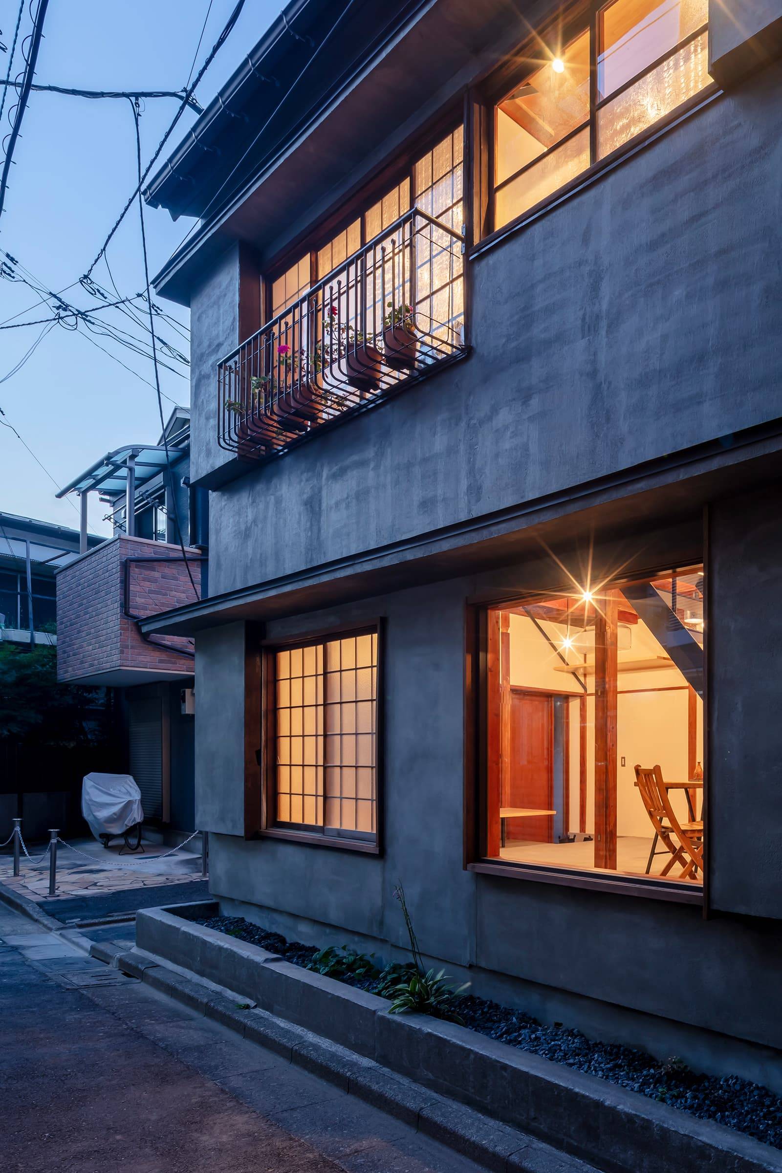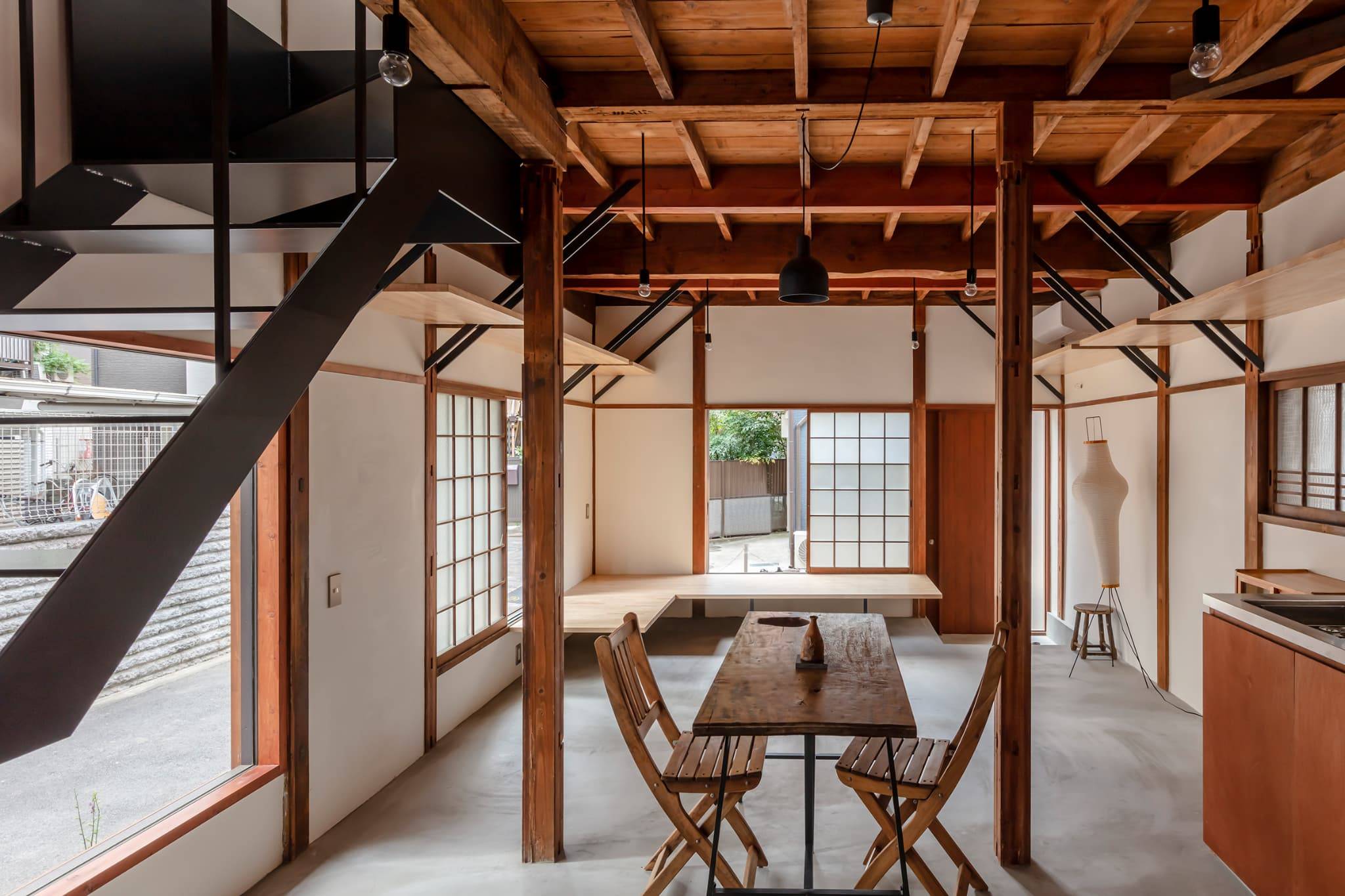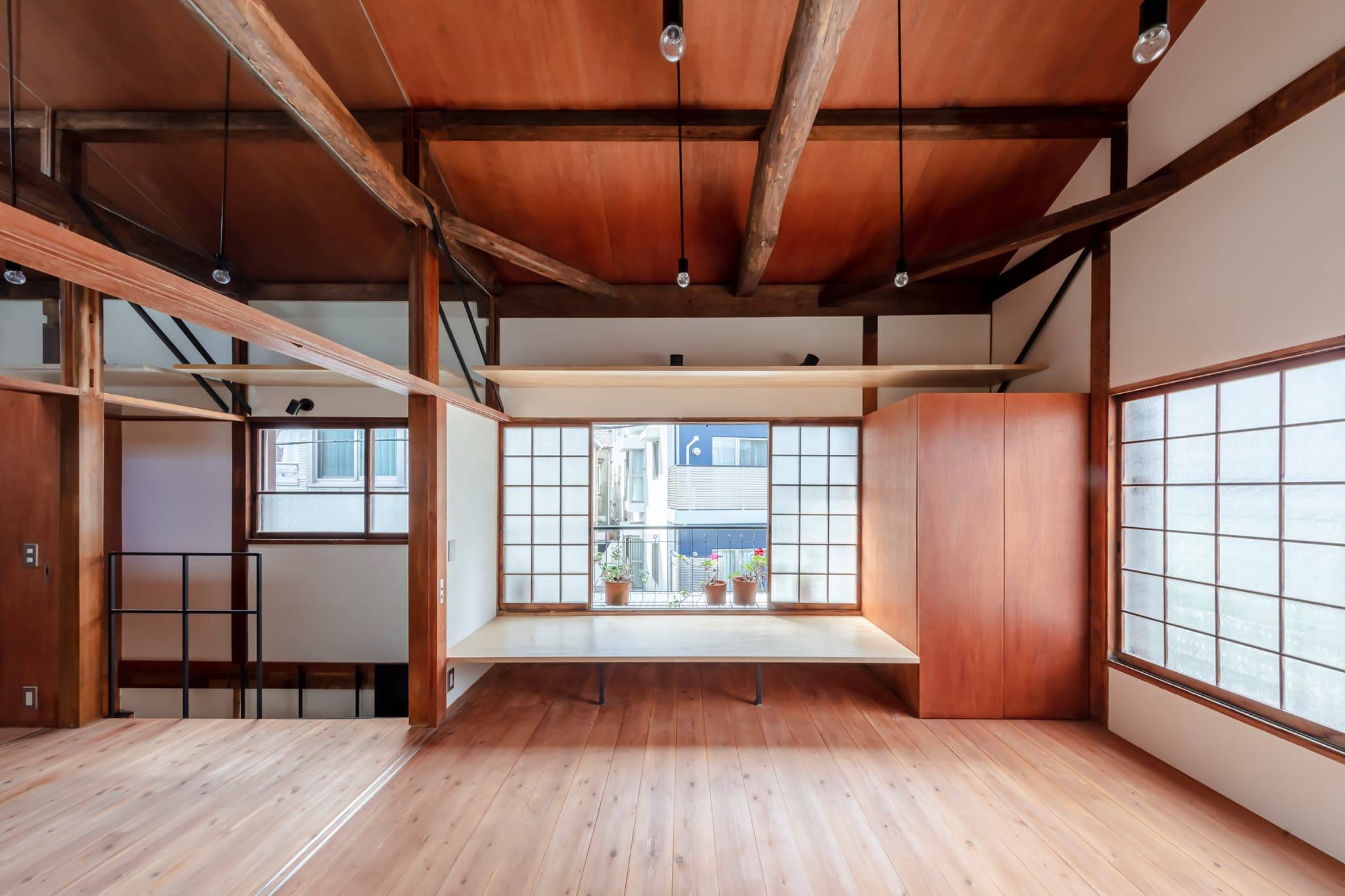 東京千駄木の小さな民家を改修し、海外の芸術家の東京滞在の場とした計画。構造的補強としてフラットバーの方杖とその座屈止めの棚板を設置することで、空間を細分化していた壁を撤去し、その時々に合わせて自由に使えるように計画し、2階の高窓からの自然光を空間全体に取り込んだ。