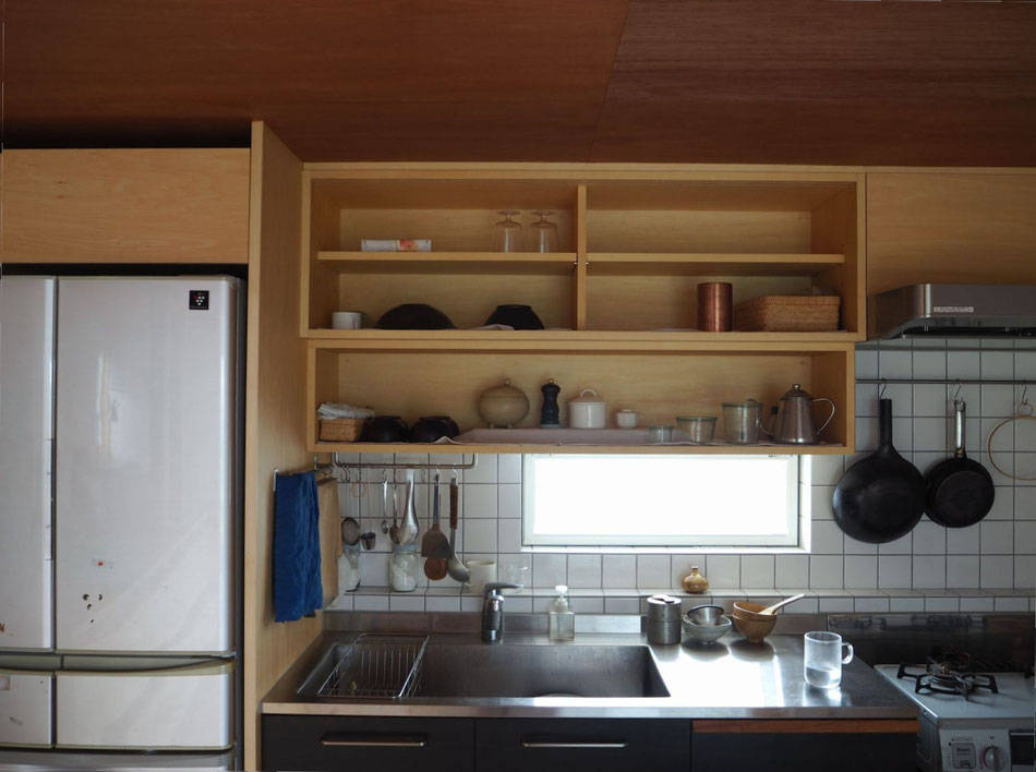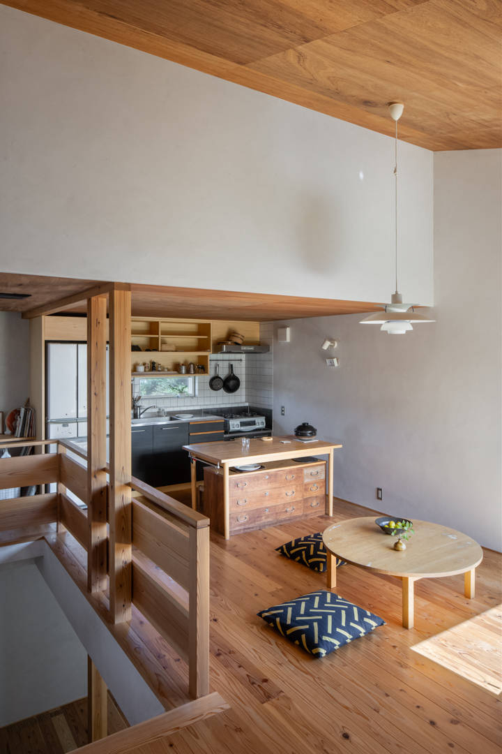 まわりの住宅に囲まれやや閉じた暮らしが想定されたため、1階に寝室や水まわりを配し、2階に家族があつまり食事やくつろげる広めのスペースと台所、そのとなりに居職空間を設けている。