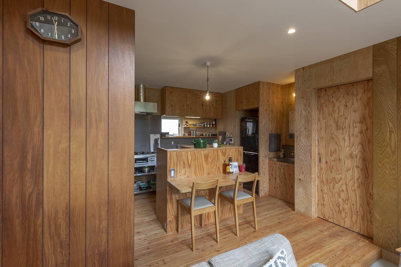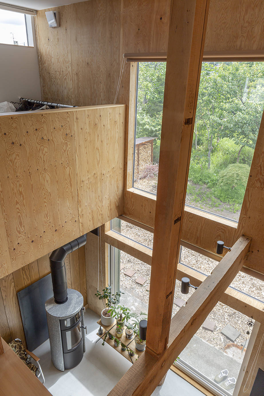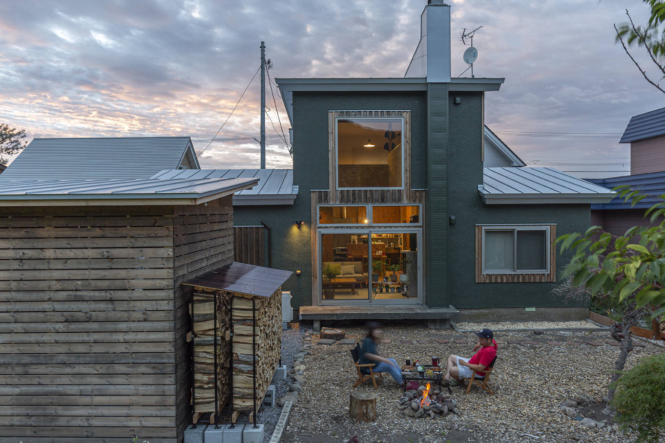 155坪というゆったりとした敷地は銭函天狗山を含む山々を望むことができ、近隣に建つ木工製品加工工場の佇まいも借景となっている。