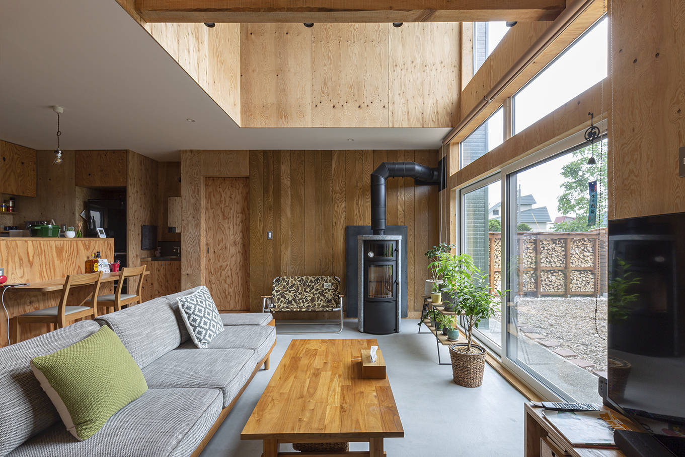 計画の特徴は、建築面積の約1/3の広さを持つ、玄関からリビングへ続くアウトドアショップのような土間空間を作ったこと。土間の突き当りにはこだわりの薪ストーブが鎮座する。