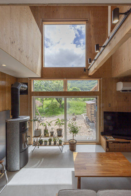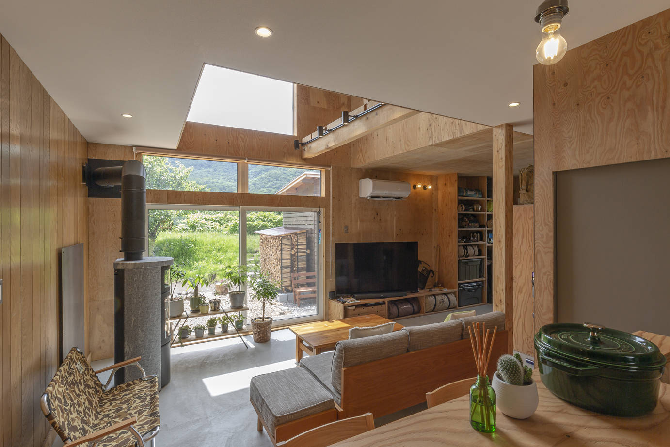 外では、駐車場の他に施主が半DIYで作り上げた物置や薪棚で囲われた庭で、週末ともなるとタキビを灯しのどかな田舎暮らしを楽しむことができる。