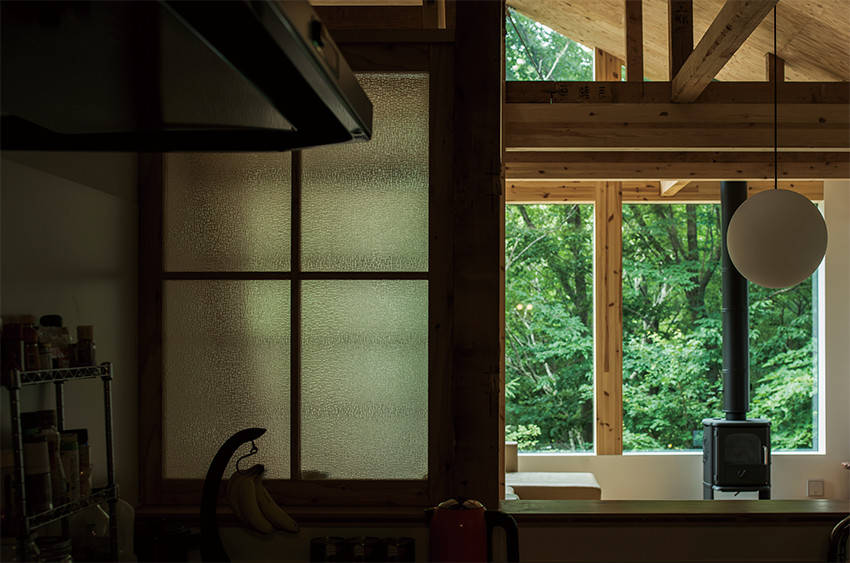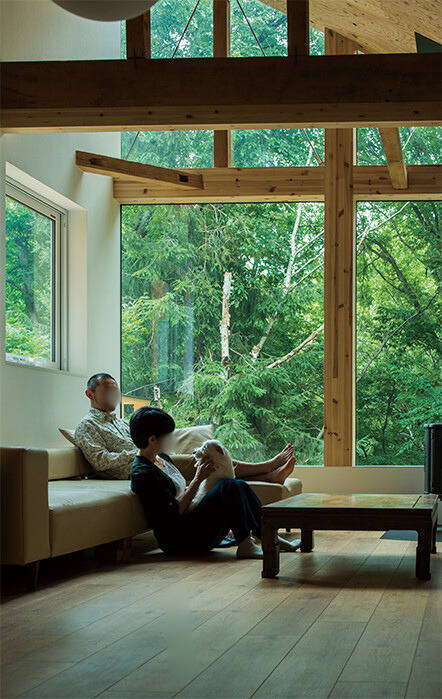 二人の要望は、キッチンで料理をしているとき・食事をしているとき・本を読んだり映画を見ていると き、薪ストーブの火をぼうっと見ながら入ってくる景色……。室内のどこからも緑を感じられる大きな窓 と開放的な空間、そしてみんなが外に出て直接自然に触れられる大きなテラスが欲しいこと。