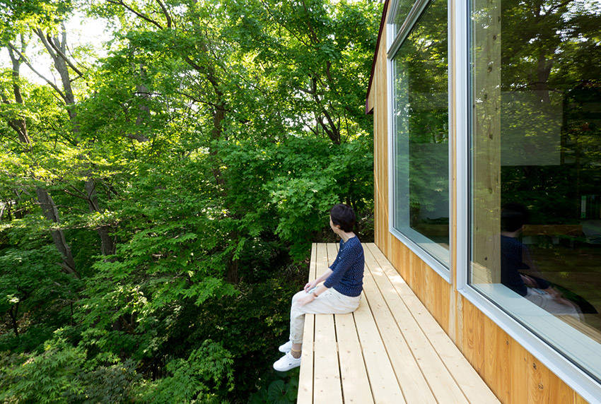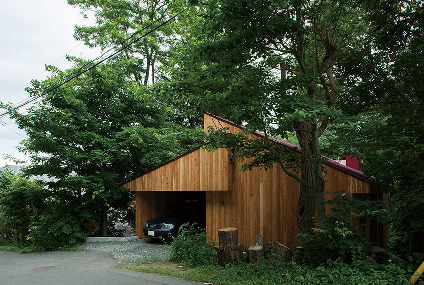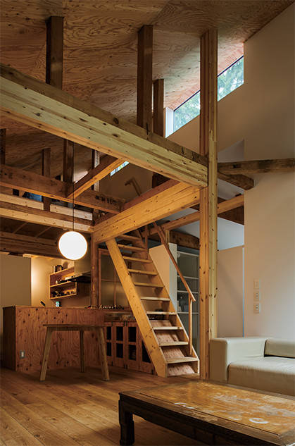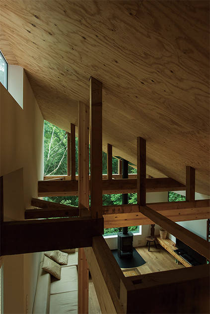一番自然に関われる外壁面には念願の大きな窓を設けてリビングとし、ダイニング・キッチンへと奥 につながる。その上部にはわずかな隙間を利用したロフト、リビングの隣には夫婦の寝室があり建物 から大きく張り出したテラスへの出入りができる。そしてどの部屋からも緑が感じられるようになってい る。いい形の外観には緑になじむように道産カラマツの羽目板を張った。