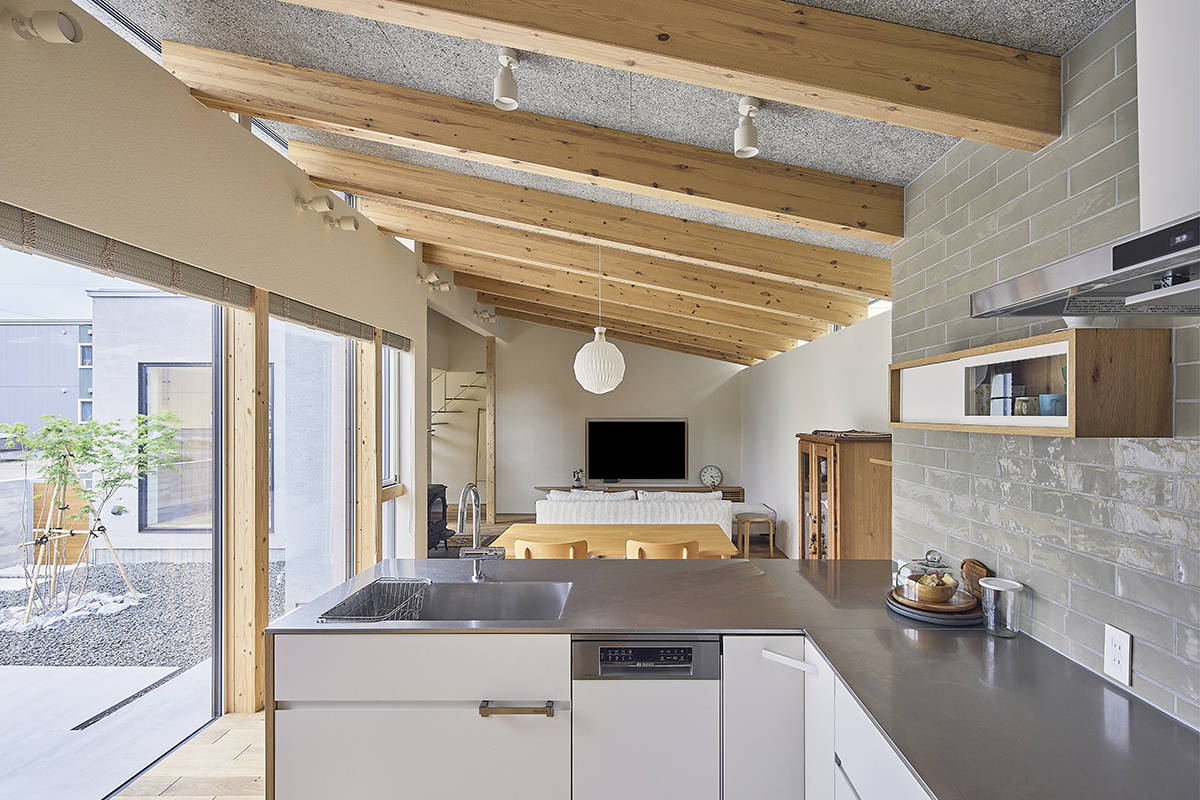 外壁は塗り壁とし、質感を際立たせるように荒く仕上げました。玄関アプローチから玄関、ホールは空間を低くし、訪れる人を柔らかく包み込むような空間としました。さらに空間を進むと天井が上がり、緩やかに傾斜させた天井の梁の間から光が舞い降りるように考えました。この際、質感のある天井によって光が拡散され、柔らかな光となるようにした。