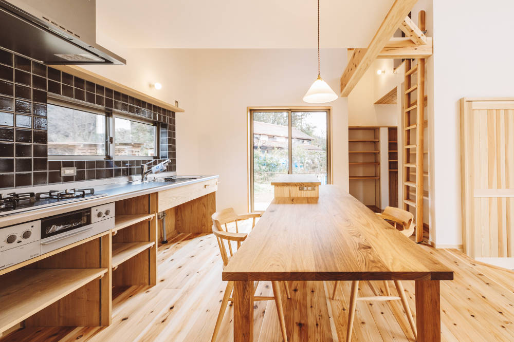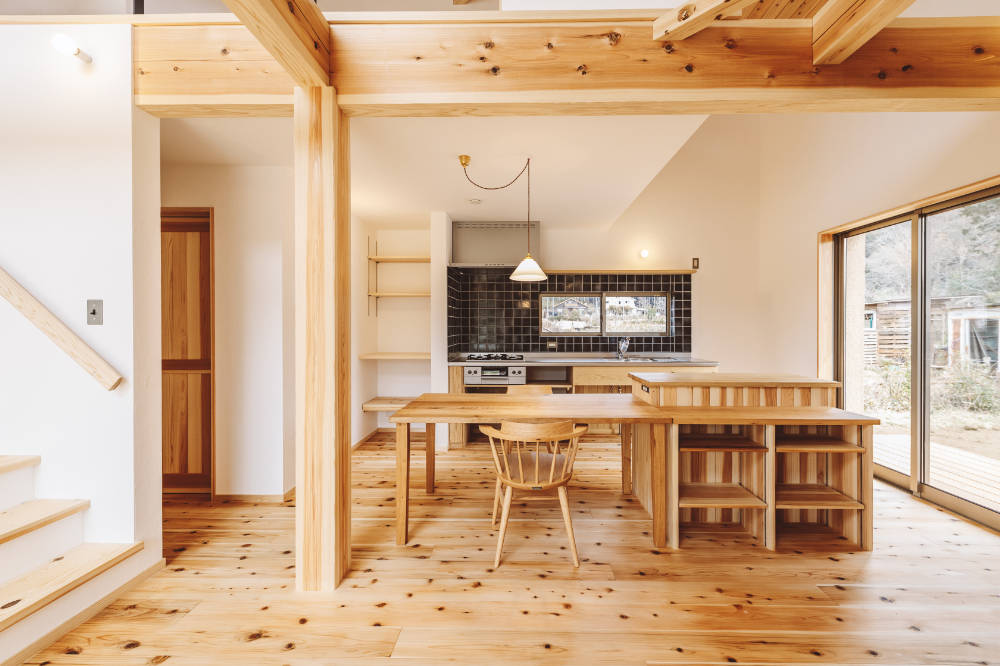 土間に置かれた薪ストーブや大きな窓からの借景が、豊かな暮らしを生んでくれています。