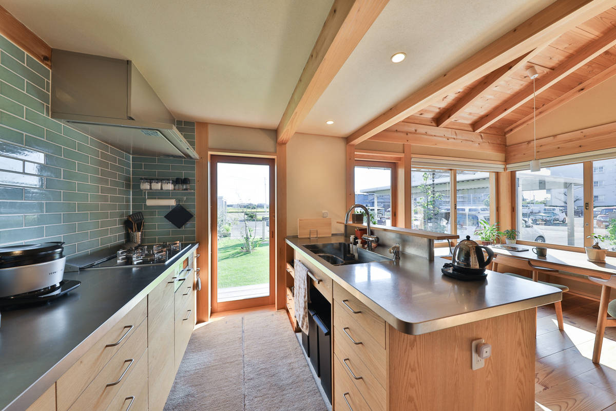 リビングの南側がダイニング。そして、親子でお料理を楽しめるように、キッチンはやや広めにしました。キッチンへの導線は玄関から食品室を通り抜けるショートカットのルートもあり、日常の生活では便利さを感じていただけるのではなでしょうか。