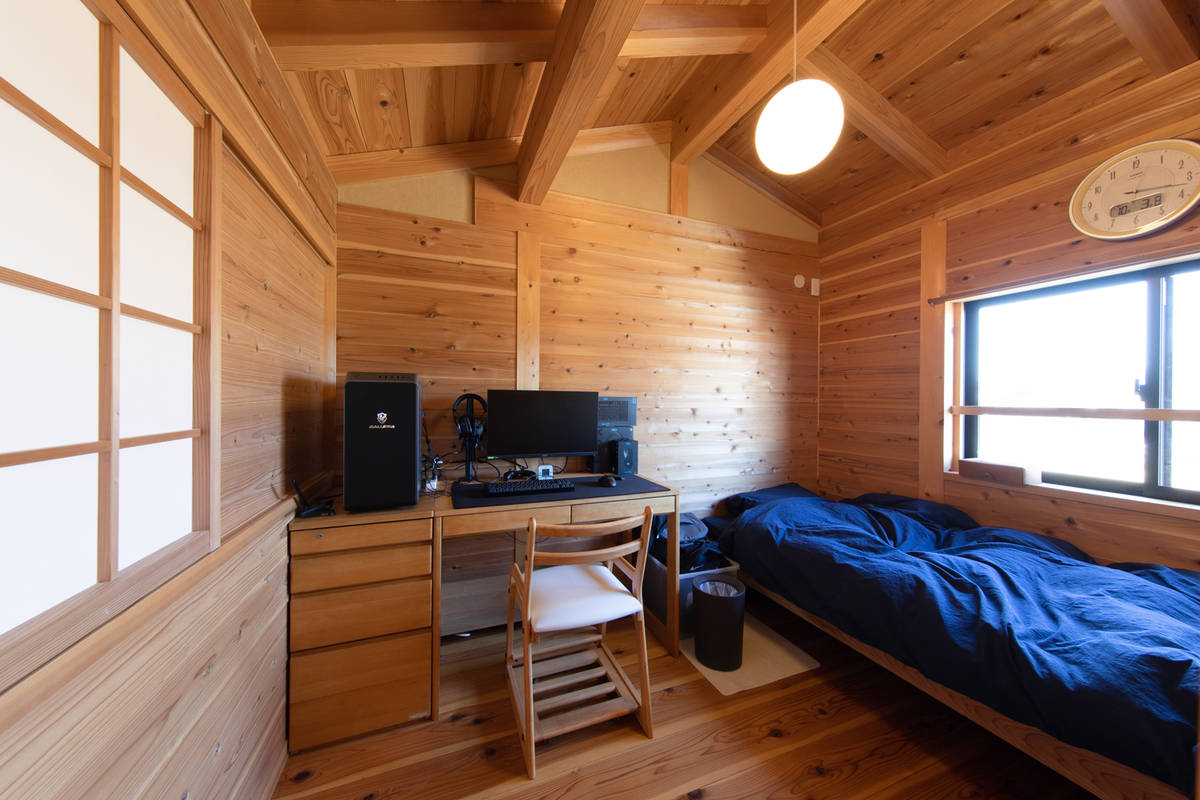 二階には主寝室と子供室(一室は二人でシェアすることに)。また、寝室奥には屋根裏を活かして小屋裏収納もあります。