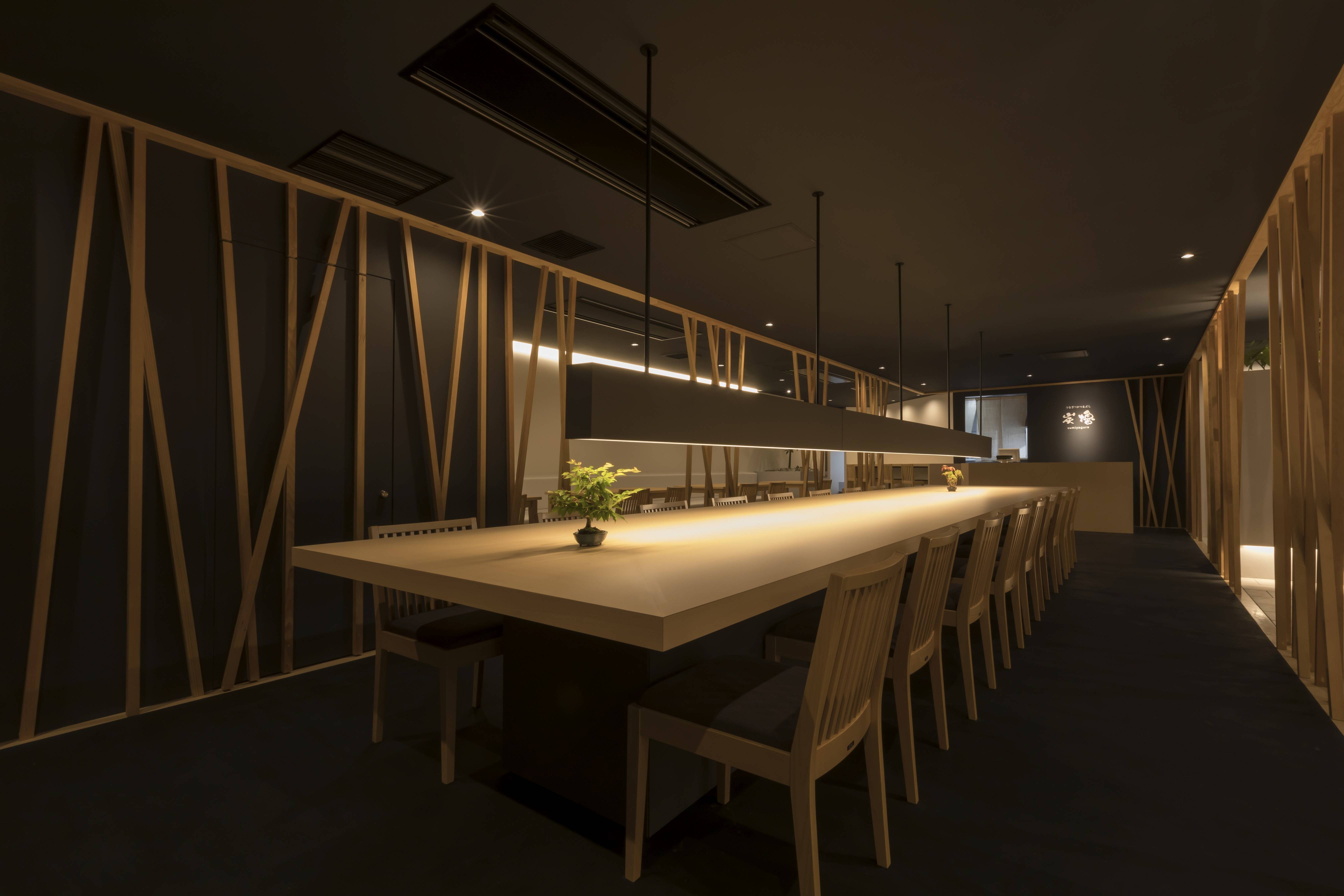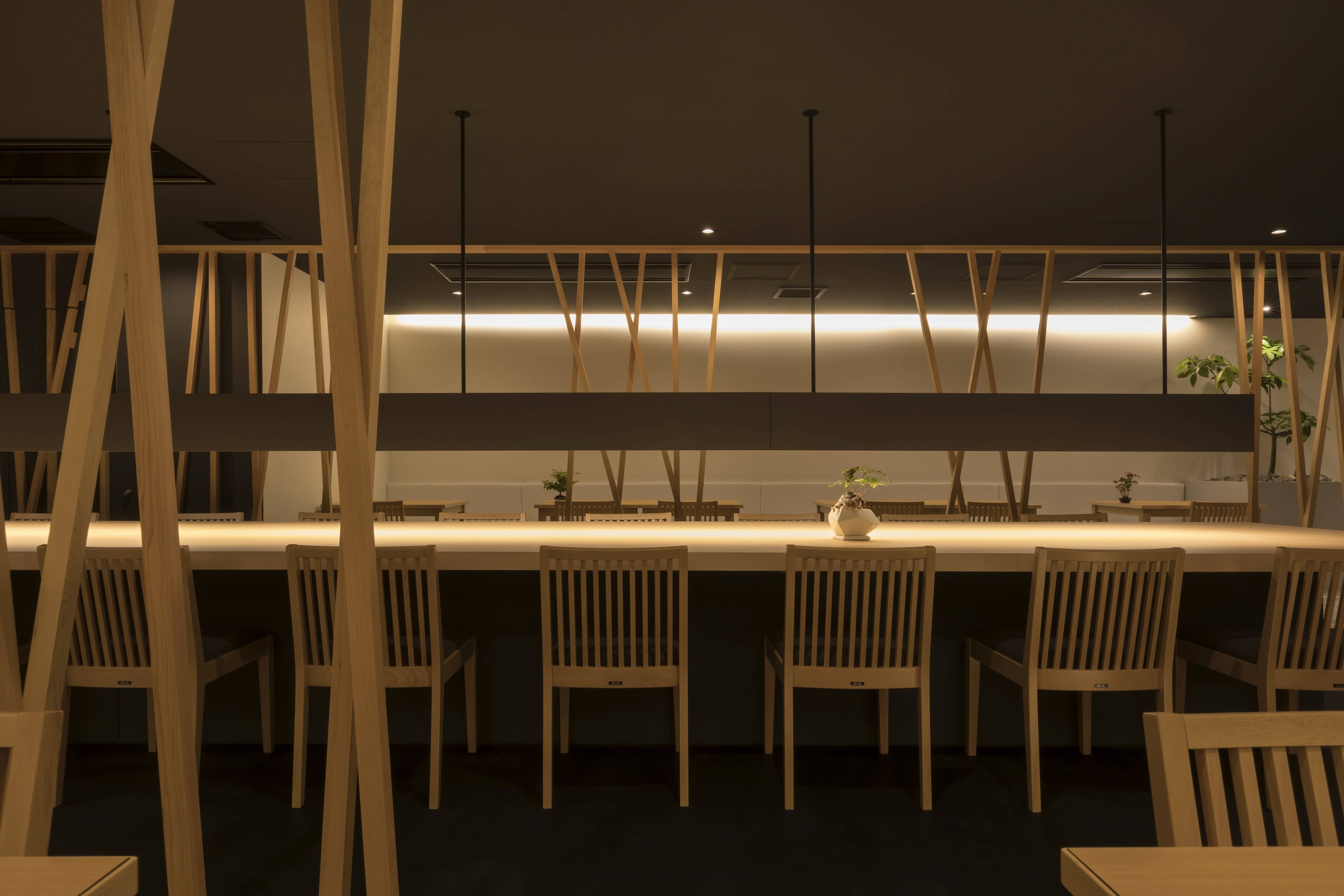 店舗内には木の格子をランダムに並べることで、うなぎを捕獲する「ウナギテボ」を想像させています。
