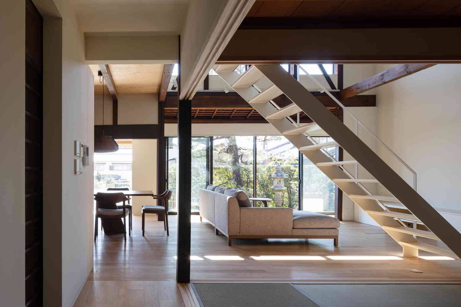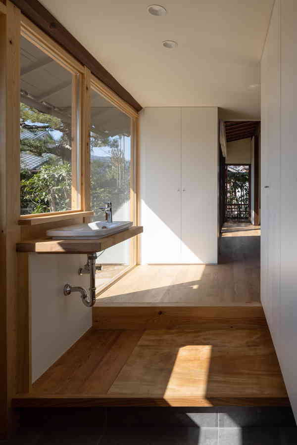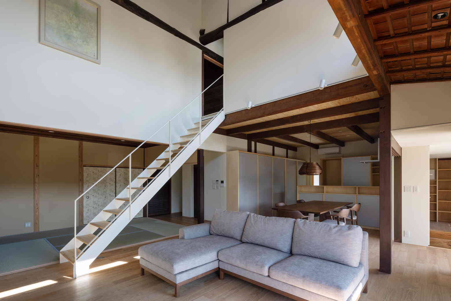 北嵯峨ののどかな田園風景の中に残る古民家を改修した。古民家特有の間取りや大きな小屋裏空間の魅力を活用しながら、明るく風の通る住空間を計画した。庭に面する南側に吹抜けのあるLDK、奥に和室や寝室が設けられている。吹抜け上部の外壁を全て開口に変更し、春季から秋季までは軒により直射光を遮るように計画している。また、吹抜けを介して温度差換気を行うことで、夏場は過度に冷房に頼らずに生活できるように配慮した。
