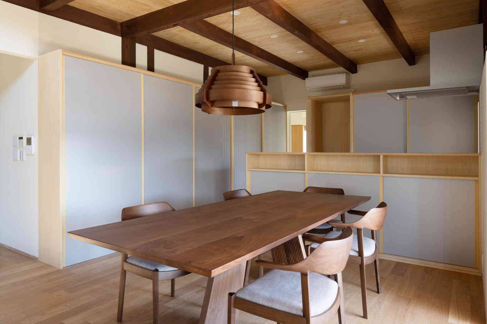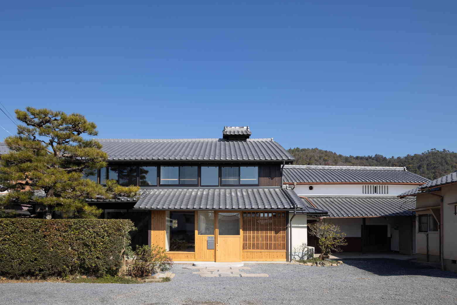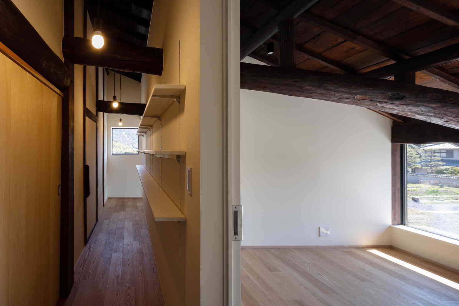 北嵯峨ののどかな田園風景の中に残る古民家を改修した。古民家特有の間取りや大きな小屋裏空間の魅力を活用しながら、明るく風の通る住空間を計画した。庭に面する南側に吹抜けのあるLDK、奥に和室や寝室が設けられている。吹抜け上部の外壁を全て開口に変更し、春季から秋季までは軒により直射光を遮るように計画している。また、吹抜けを介して温度差換気を行うことで、夏場は過度に冷房に頼らずに生活できるように配慮した。
