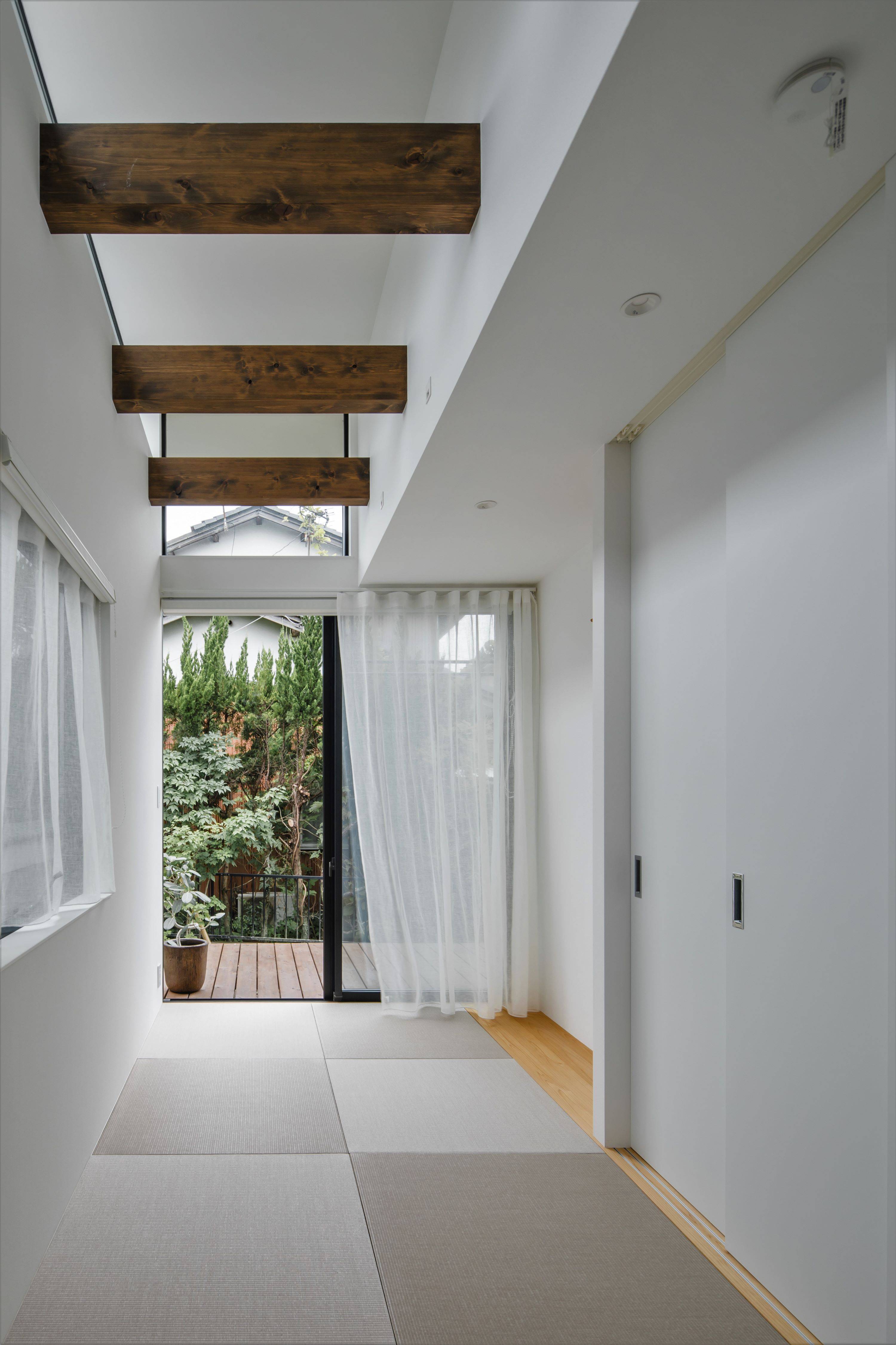 玄関と同じタイルを庭廊にも用いることで、“廊下”という室内空間が、外部空間の延長に変化し、外のような空間が住宅の奥の空間まで続いていきます。