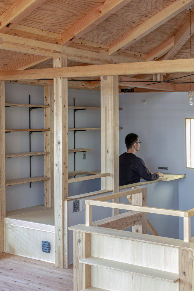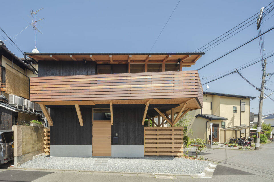 この地域は景観的理由から建物の形や大きさに京都市独特の厳しめの規制があり、また高額な地価からか周囲は道に沿って小さな敷地が連なり、ボリュームを抑えながら小さな家が込み合って立ち並んでいる。 H博士と探し当てた敷地も同様に小さいが、変形交差点の角地であり、この地域では局所的に公共空地空間である道路に大きく開き開放的であった。そこでこの開放性を活かし道路上の空間を視界に取り込む2階を5人で過ごすための広い居間として重点的に床を割り当て、建ぺい率の許す限り居間とベランダを設えている。交差点に開口を大きく設ける事で視線が道路上の空間を占有し、とても開放的な住まいとなった。 逆に1階は面積を絞り、道路からセットバックした壁面を設定し交差点の交通の安全性に配慮している。 また、前庭を設え、準防火地域にありながら様々な工夫により自然素材である木材を周囲に現す表情の仕上がりとする事で、地域の景観へ配慮しています