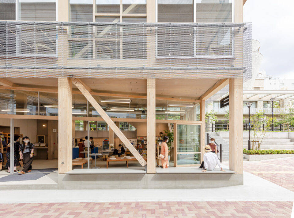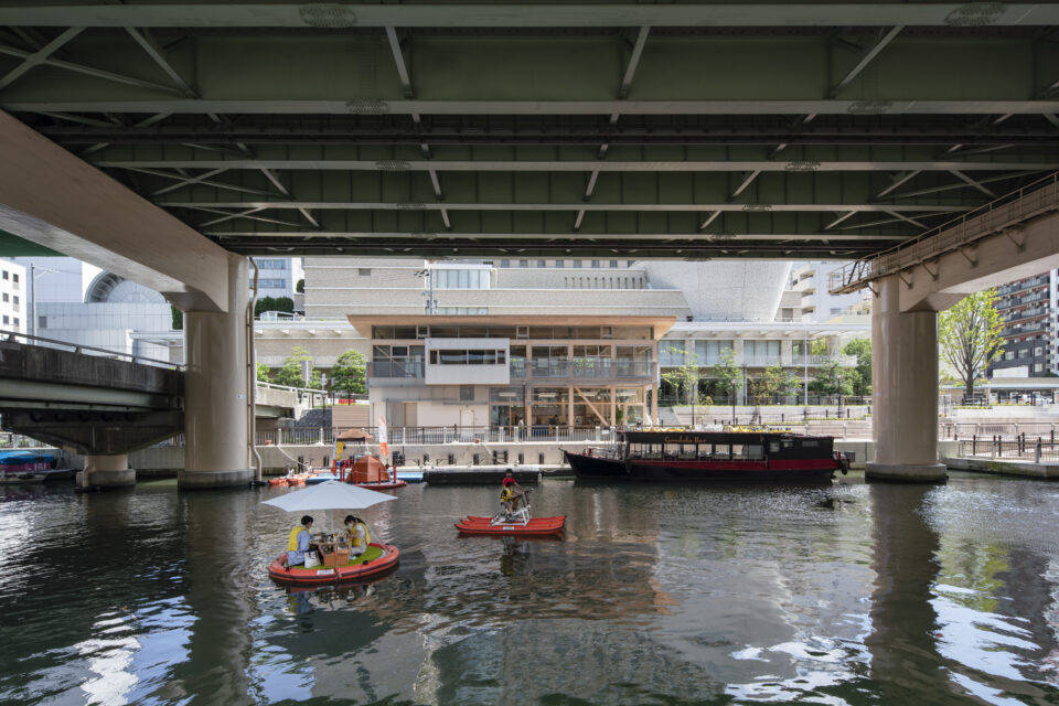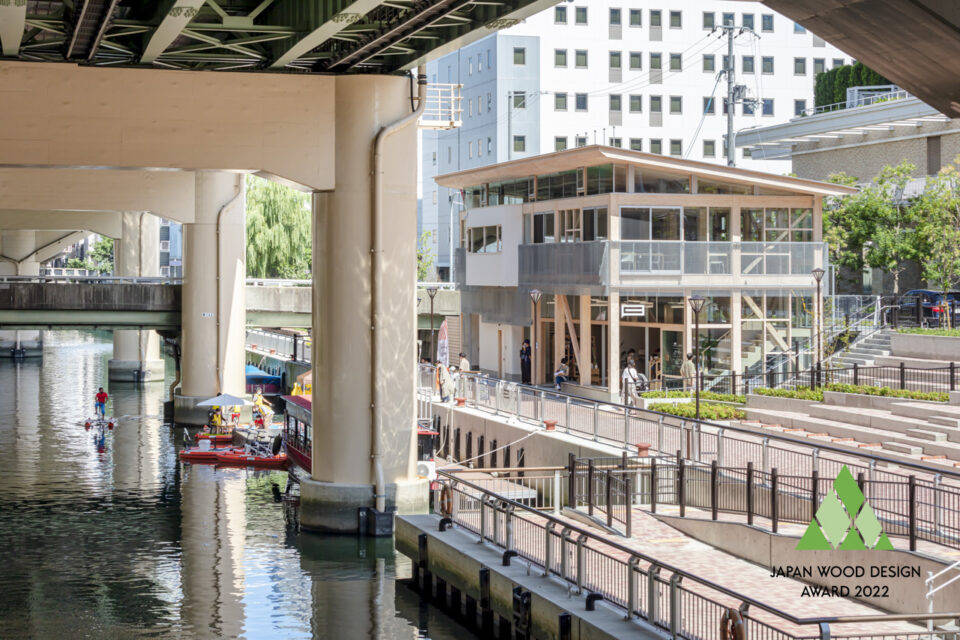 また、都市の中の木造建築として、新たな風景を作りながら、周りの風景にも違和感なく調和することを目指した。木目の綺麗な吉野杉に、ほんの少しの白色の塗装を施し、木材だけでなく金属素材等の都市的な要素と組み合わせることで、その調和を実現した。本施設に隣接する水辺で行われるSUP を始めとする様々なアクティビティの拠点施設として、木の柔らかさと都市的なシャープさの組み合わせが生むファサードが、人々を引きつける役割を果たしている。