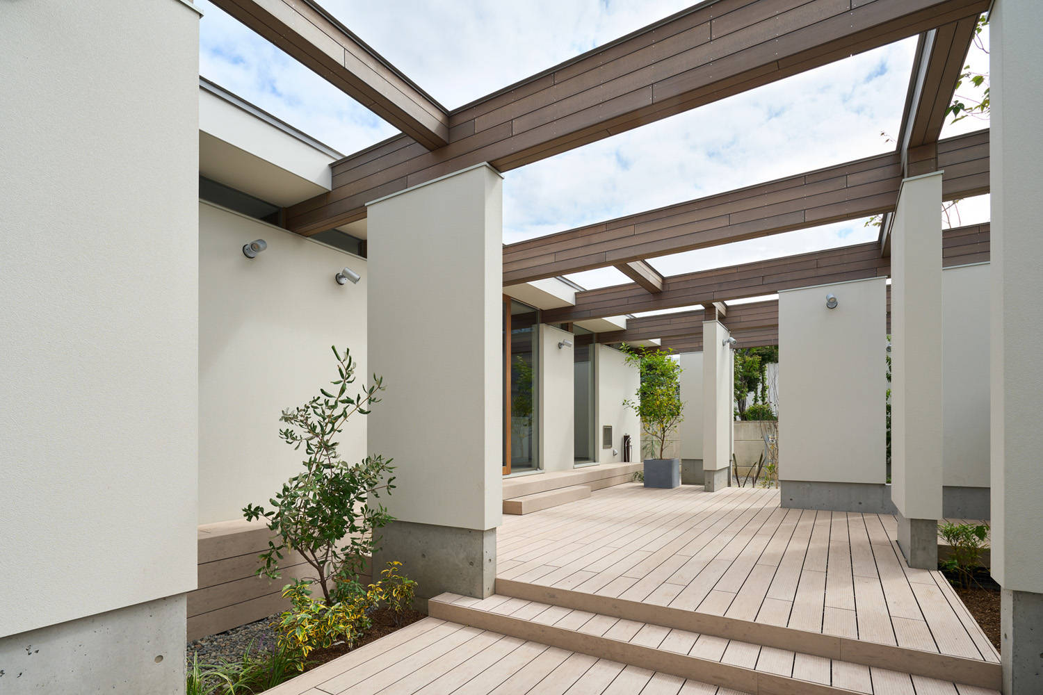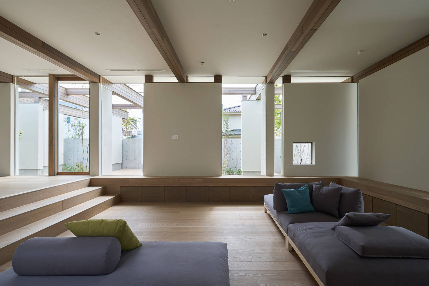 また、まばらに散りばめられた梁を受ける壁を内部と外部に配置し、視覚的にも中と外が同等に感じられるようにしました。