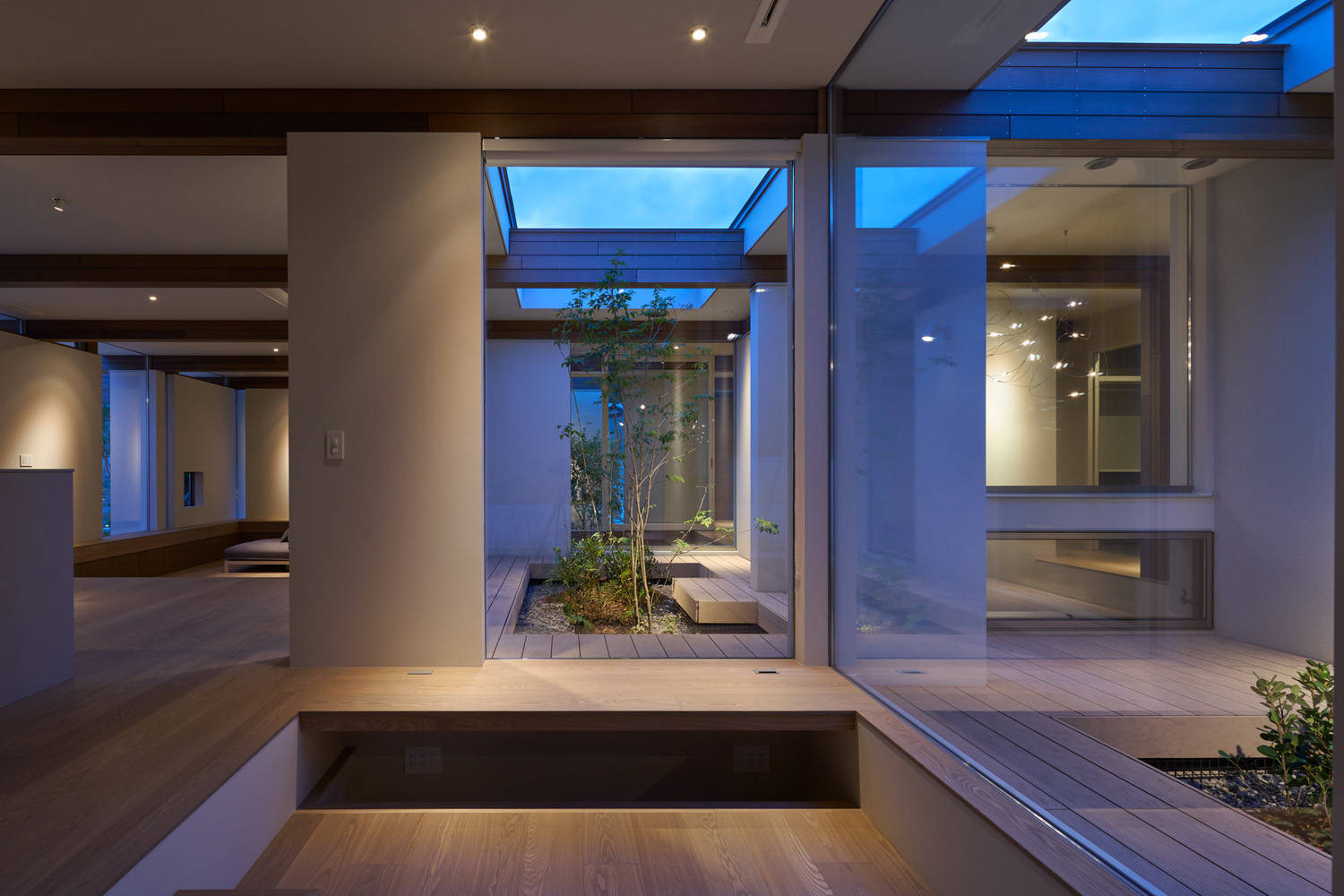 床は外部のデッキ材と、内部のフローリング材を同色にするなど、意匠的な部分にも内外の繋がりを計画していったことにより、部屋の中で過ごしていても、どこか外部で過ごしているかのように感じられます。